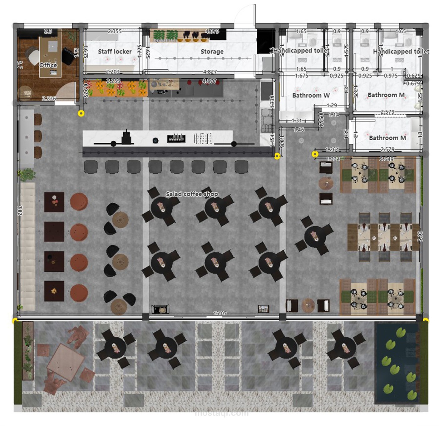 هي كافيتريا للسلطة والاكلات الصحية مساحتها 170م2