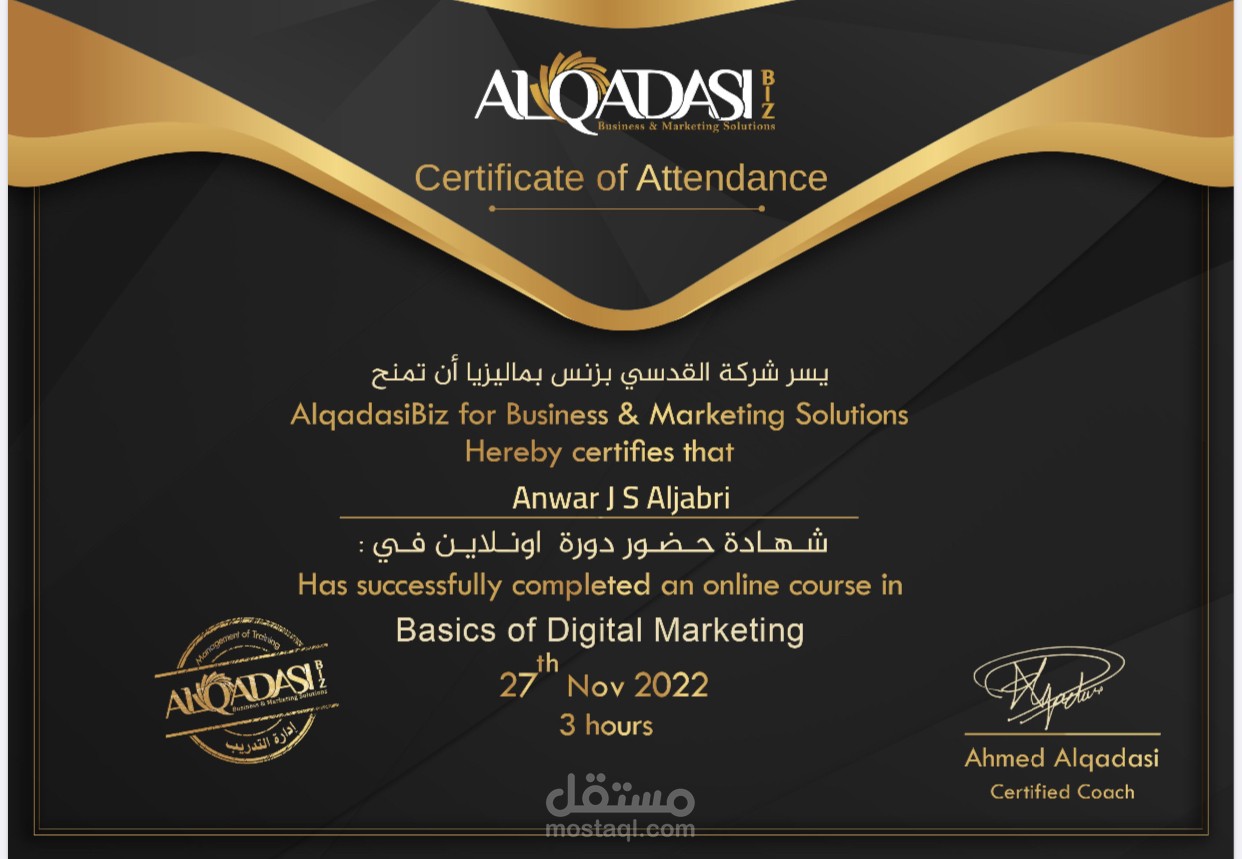 شهادة من شركة القدسي بزنس في ماليزيا دورة التسويق الرقمي بواقع 3 ساعات