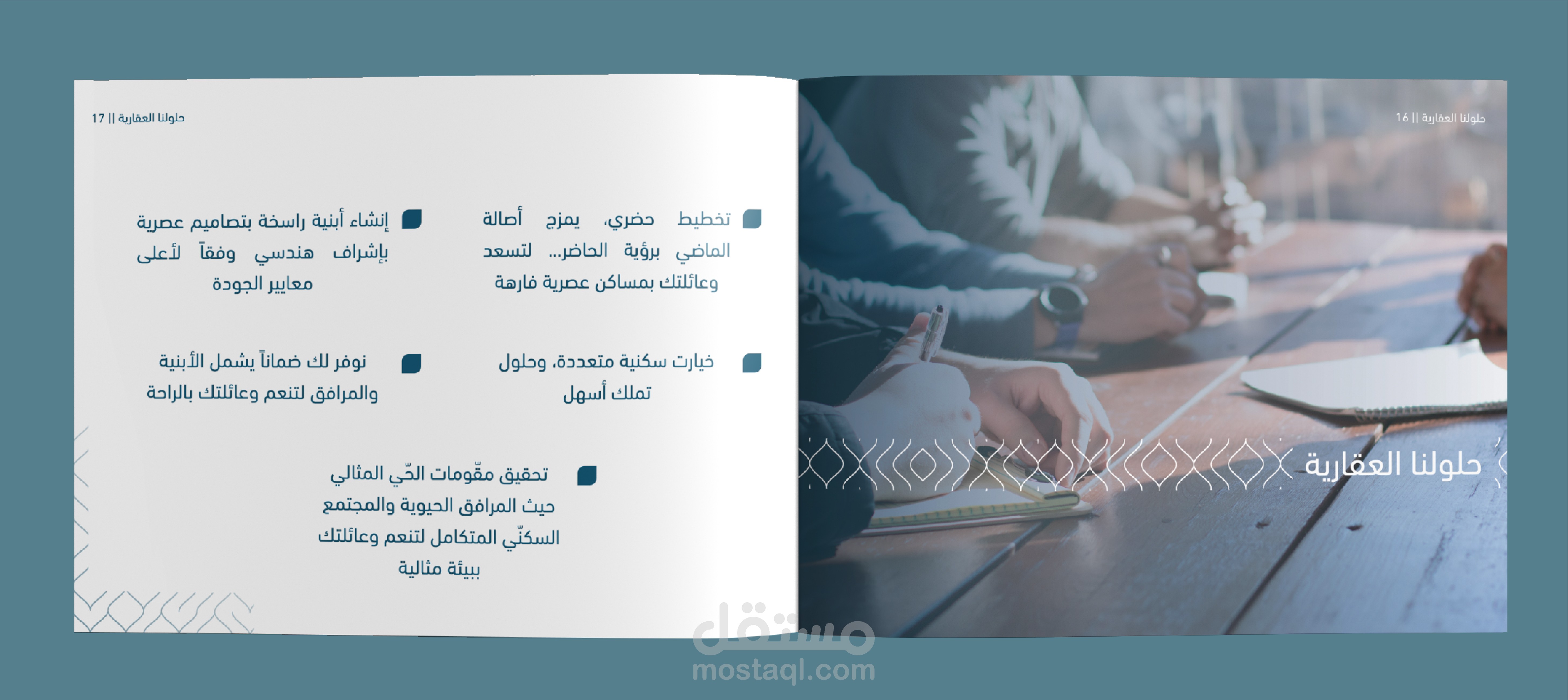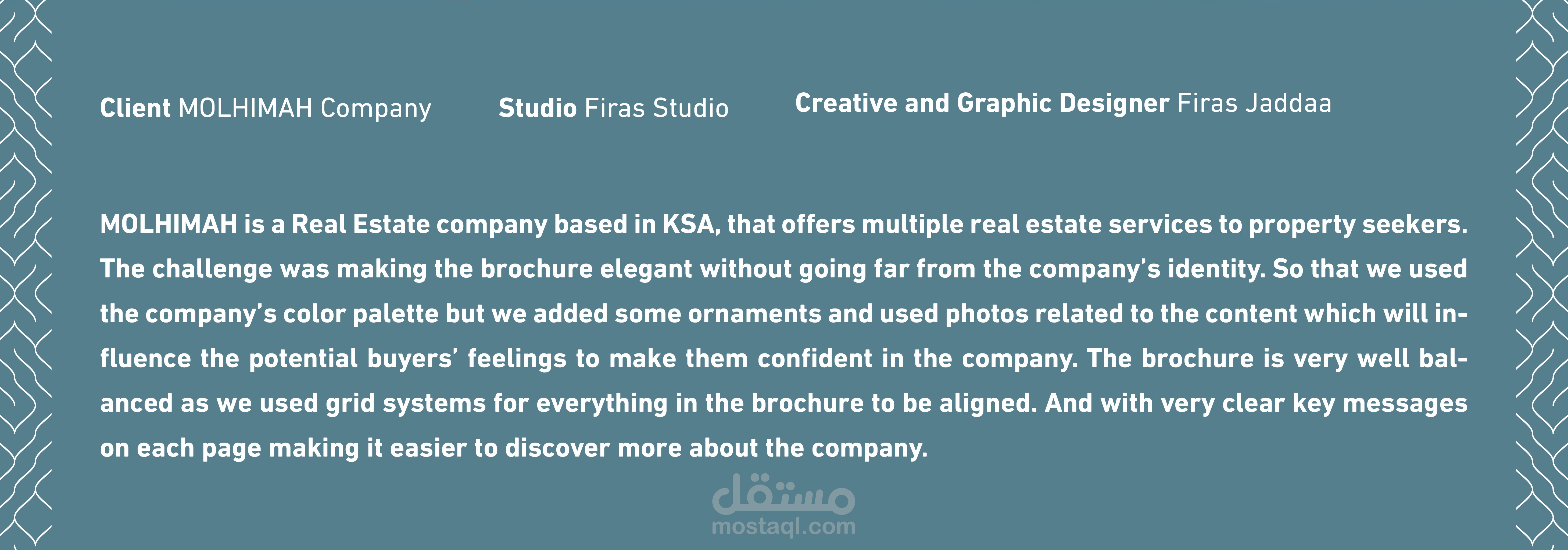 كان التحدي هو جعل الكتيب أنيقاً دون الابتعاد عن هوية الشركة. لذلك استخدمنا لوحة ألوان الشركة ولكننا أضفنا بعض الزخارف واستخدمنا الصور المتعلقة بالمحتوى والتي ستؤثر على مشاعر المشترين المحتملين لجعلهم واثقين من الشركة.