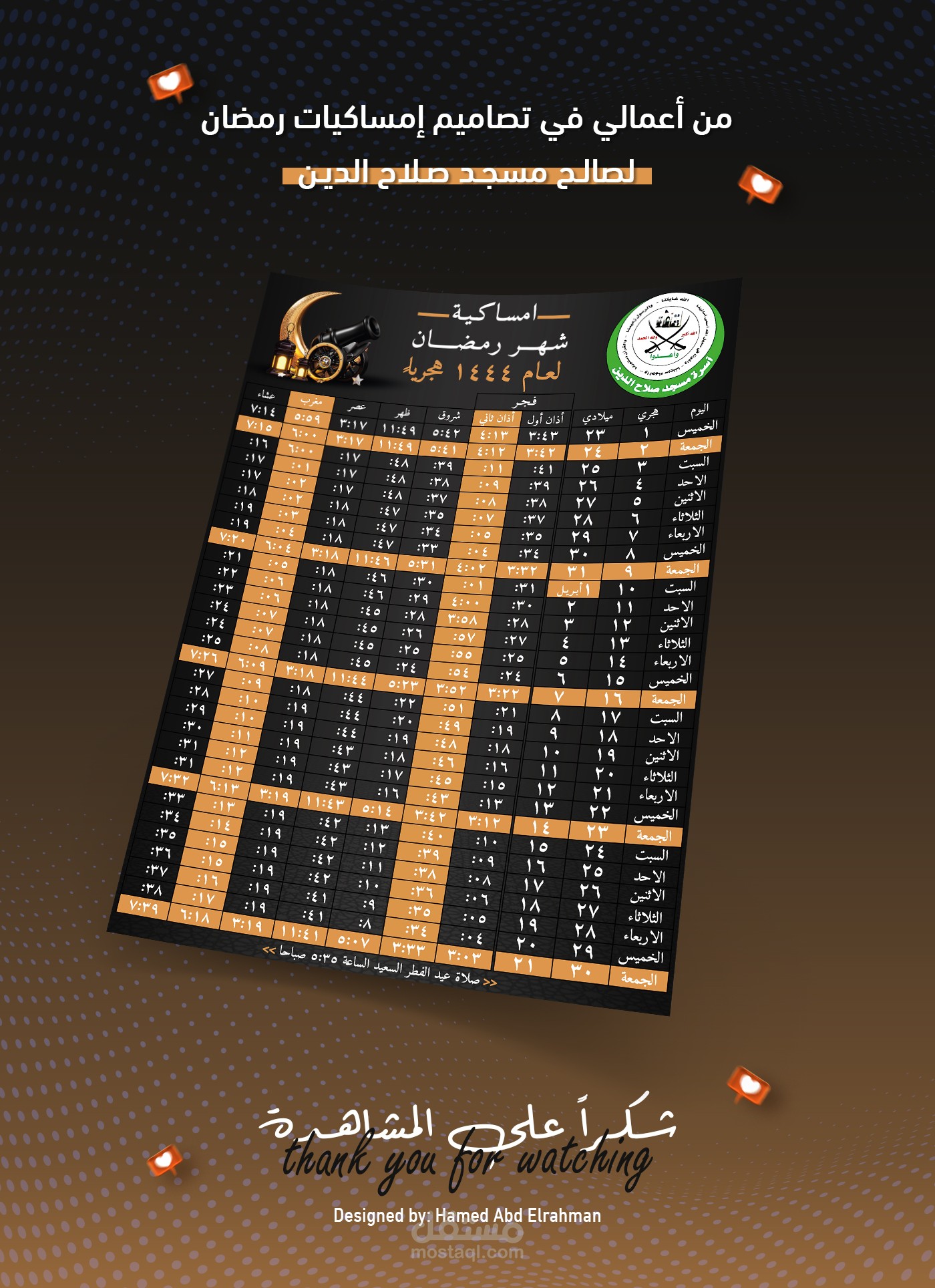 تصميم امساكية رمضان ابداعية باستخدام الفوتوشوب والاليستريتور لصالح مسجد صلاح الدين.
