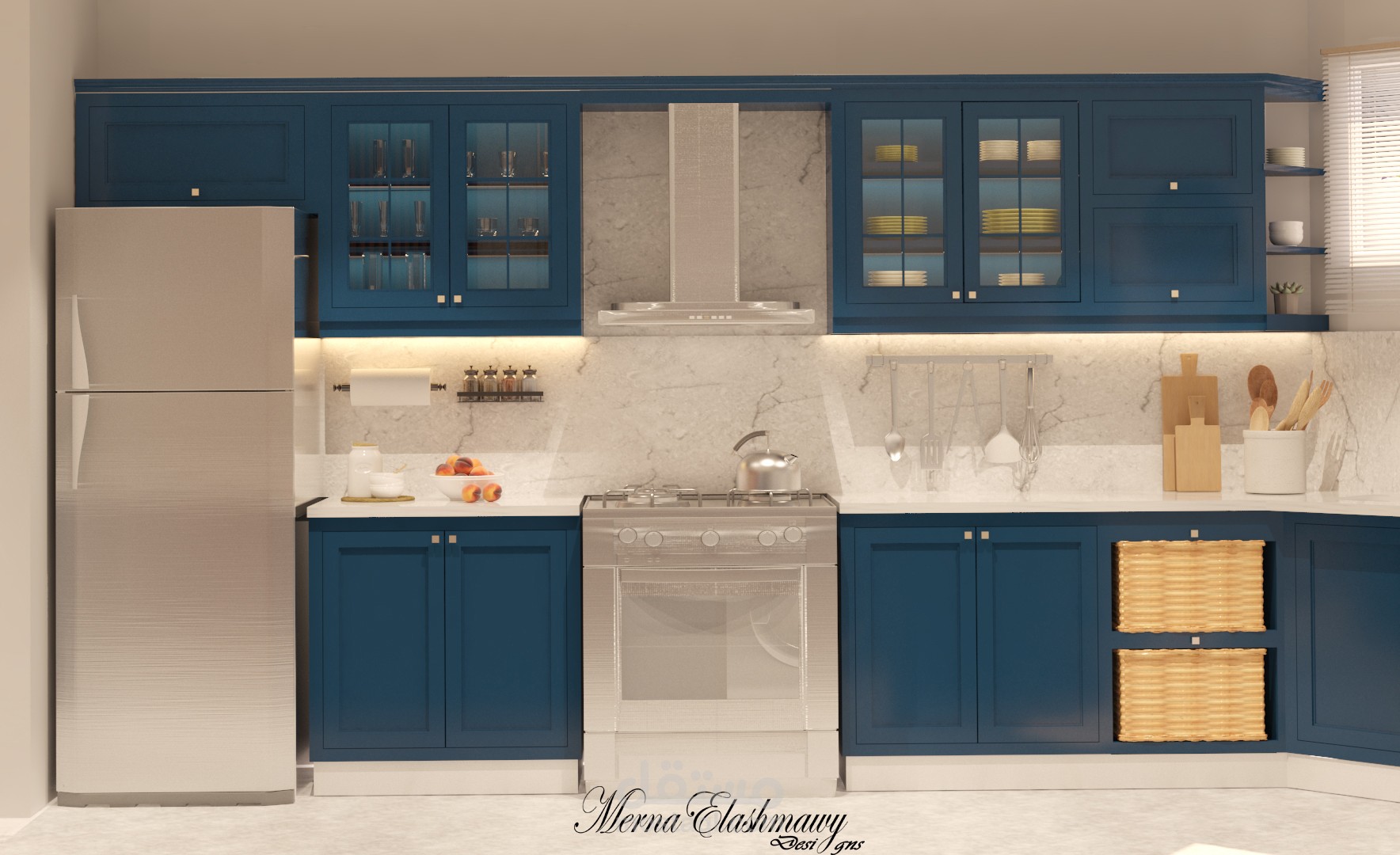 modern design for a small reception and kitchen area-blue hues and touch of gold