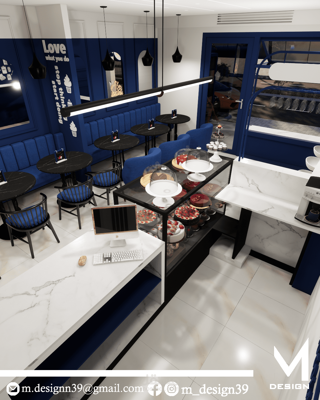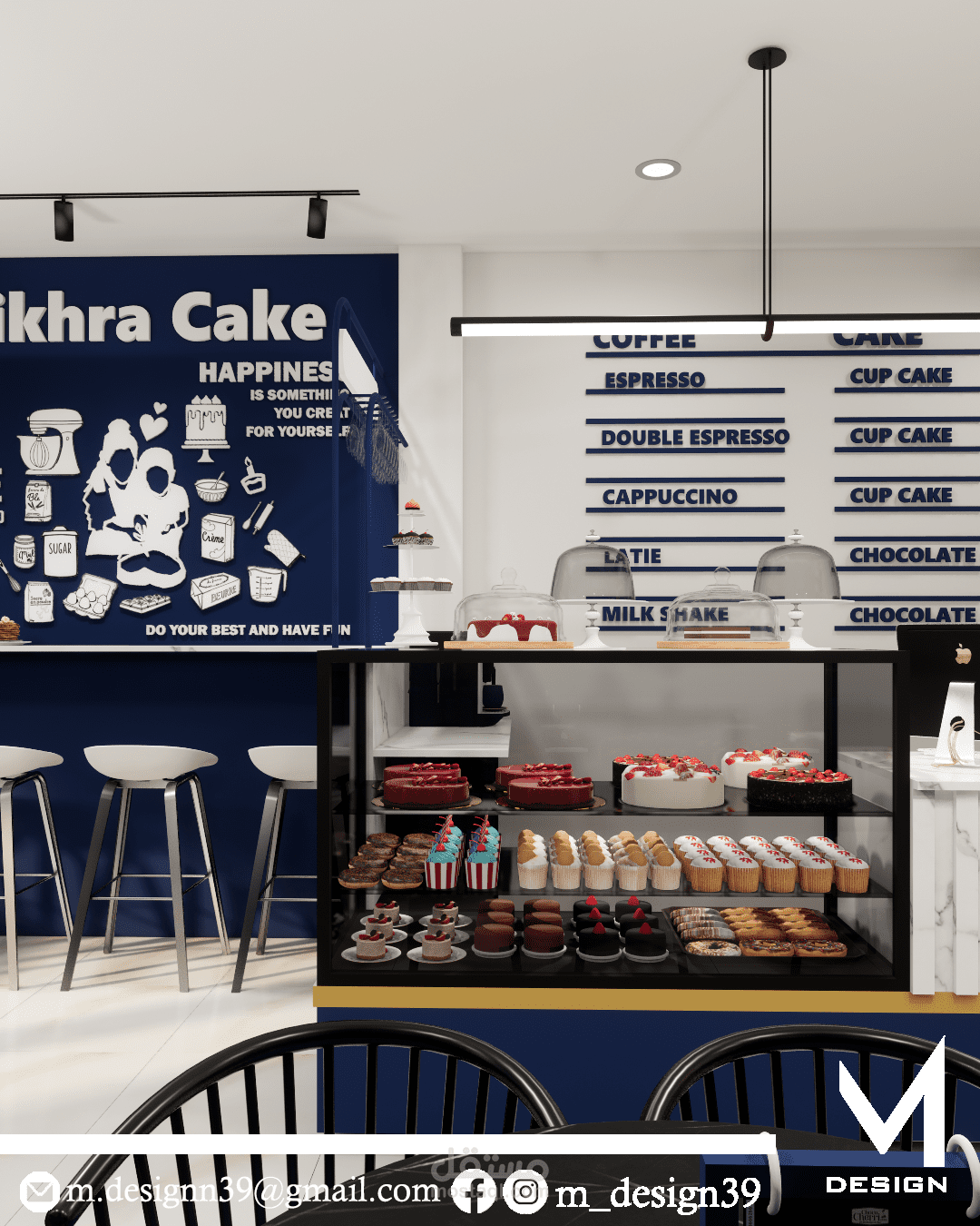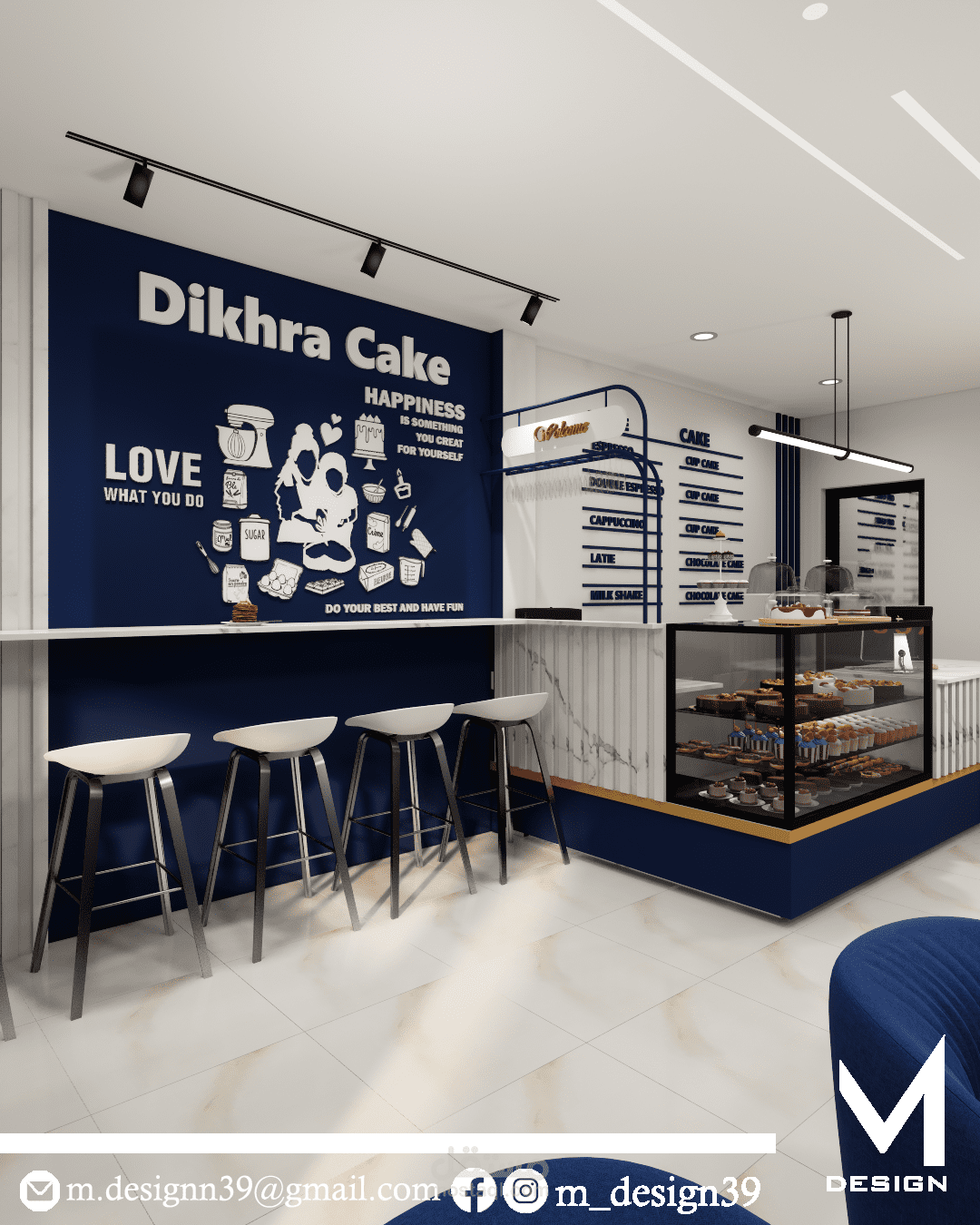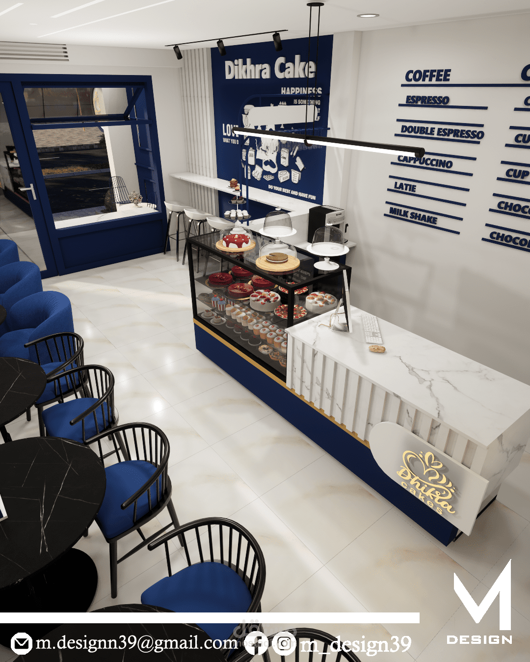 تم تصميم محل بالطراز ما بين مودارن و نيوكلاسيك برغبة العميل واختيار الالوان الاساسية - الازرق و الابيض و الذهبي و الاسود - مثل الوان الهوية التجارية و كذلك لاعطاء اتساع ومساحة للمكان . واستخدمت أرضية سيراميك بلون ابيض الرخامي و كذلك بديل الخشب بنفس لون . مع استعمال المراية لاضافة اتساع و رقي للمكان . و الرسم في حائط لاضافة الحيوية للمكان بقصة معبرة عن حكاية صاحبة المشروع واضافة لمسة مميزة تختلف بها عن كل مشاريع مماثلة . و توزيع الاثاث بافضل طريقة ممكنة لاستعاب اكثر عدد من الزبائن مع تنويع في شكل الجلسات واستغلال لكل المساحات المتوفرة . استغلال الردهة الخاريجية كمكان لتصوير مع تصميم كرسي بشكل كيك فيه شعار محل مع اكسسوارت في نفس مجال محل ( كيس دقيق. سكر . بيض .......) - قمت بتوزيع الاضاءة على حسب وظيفة كل مجال في مشروع ( العامة - الوظيفية - الموجهة )