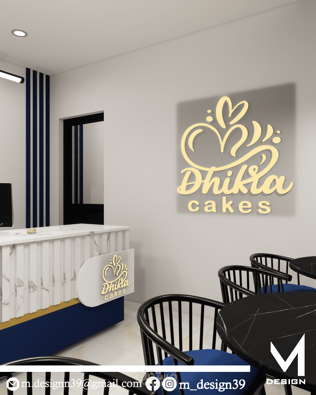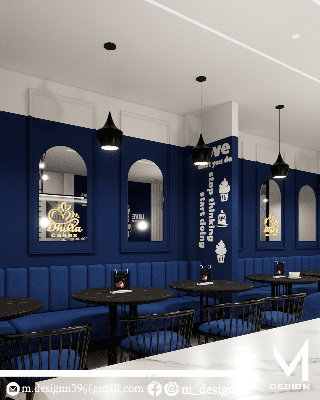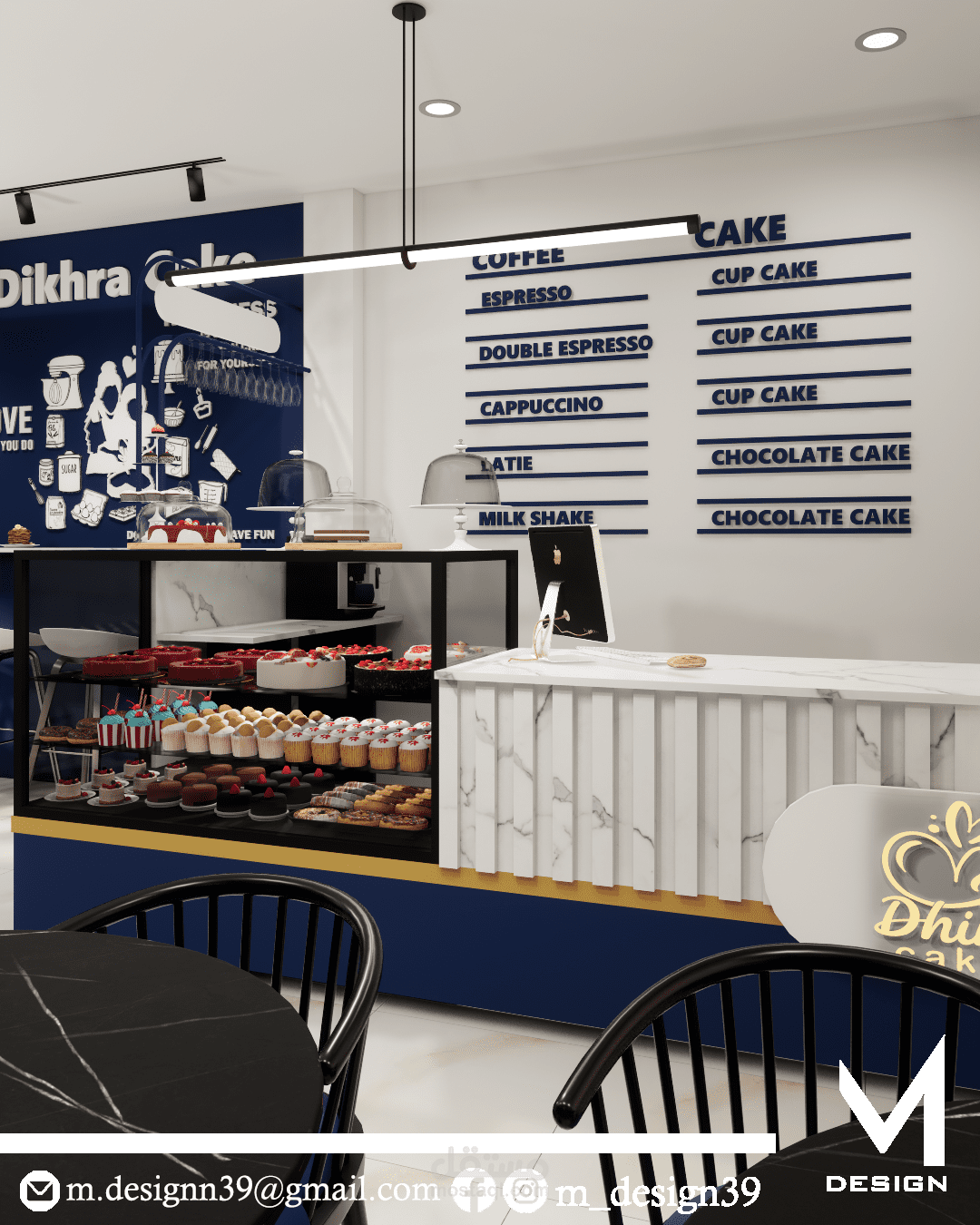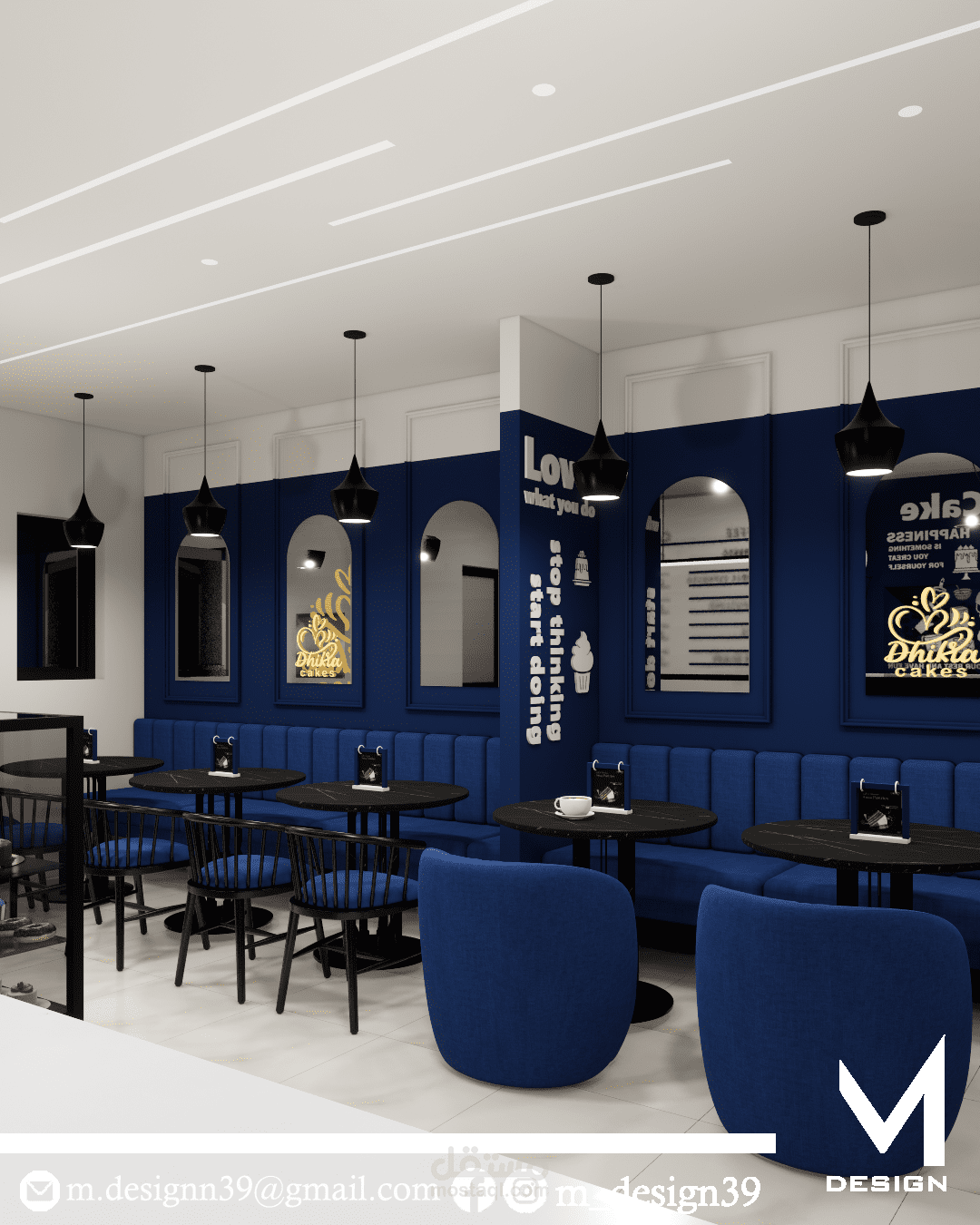 تم تصميم محل بالطراز ما بين مودارن و نيوكلاسيك برغبة العميل واختيار الالوان الاساسية - الازرق و الابيض و الذهبي و الاسود - مثل الوان الهوية التجارية و كذلك لاعطاء اتساع ومساحة للمكان . واستخدمت أرضية سيراميك بلون ابيض الرخامي و كذلك بديل الخشب بنفس لون . مع استعمال المراية لاضافة اتساع و رقي للمكان . و الرسم في حائط لاضافة الحيوية للمكان بقصة معبرة عن حكاية صاحبة المشروع واضافة لمسة مميزة تختلف بها عن كل مشاريع مماثلة . و توزيع الاثاث بافضل طريقة ممكنة لاستعاب اكثر عدد من الزبائن مع تنويع في شكل الجلسات واستغلال لكل المساحات المتوفرة . استغلال الردهة الخاريجية كمكان لتصوير مع تصميم كرسي بشكل كيك فيه شعار محل مع اكسسوارت في نفس مجال محل ( كيس دقيق. سكر . بيض .......) - قمت بتوزيع الاضاءة على حسب وظيفة كل مجال في مشروع ( العامة - الوظيفية - الموجهة )
