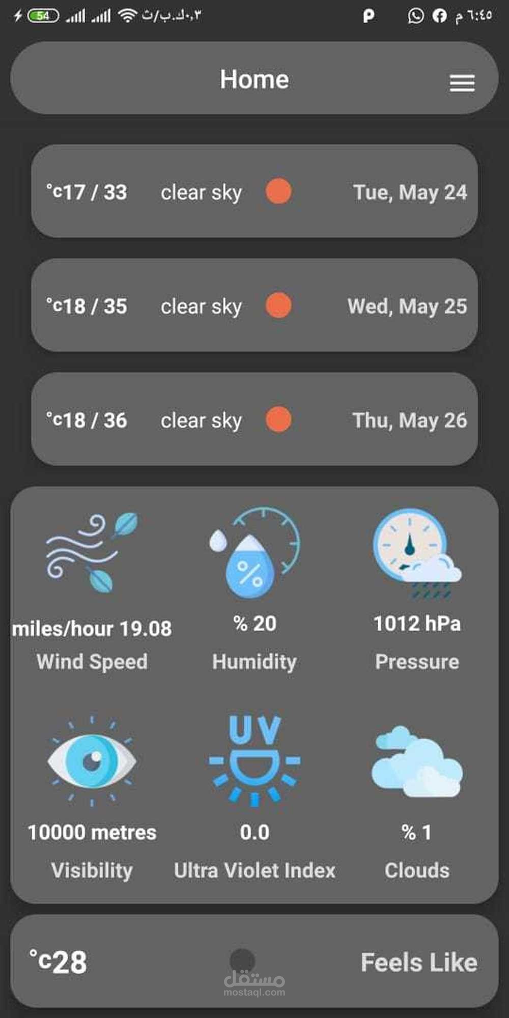 استخدم تطبيق Weather Forecast لعرض معلومات مفصلة عن الطقس لليوم ، ودرجة الحرارة اليومية ، والضغط ، والرطوبة ، وسرعة الرياح ، والغيوم ، والأشعة فوق البنفسجية ، والرؤية ، ... إلخ.