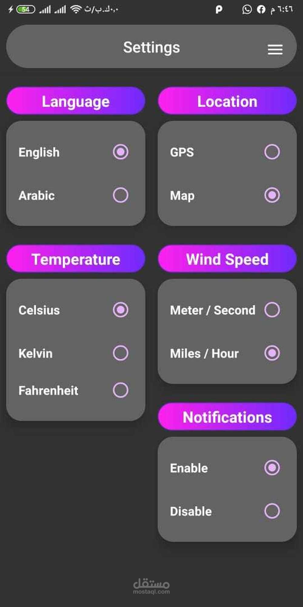 يوجد تنبيه للطقس عند ضبط تنبيه للمطر والرياح ودرجة الحرارة والثلج ... إلخ.