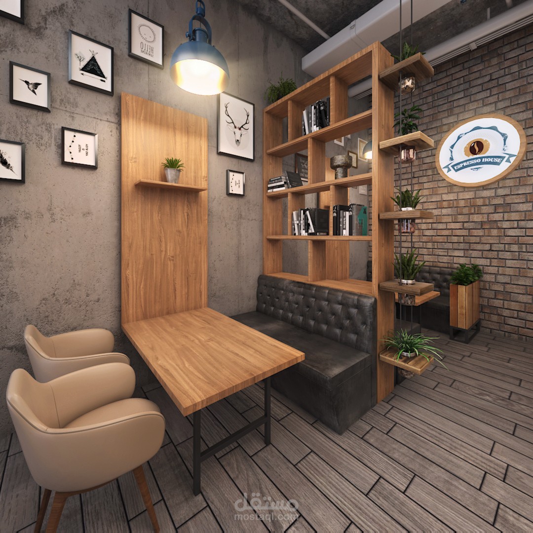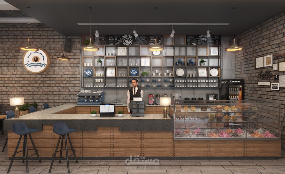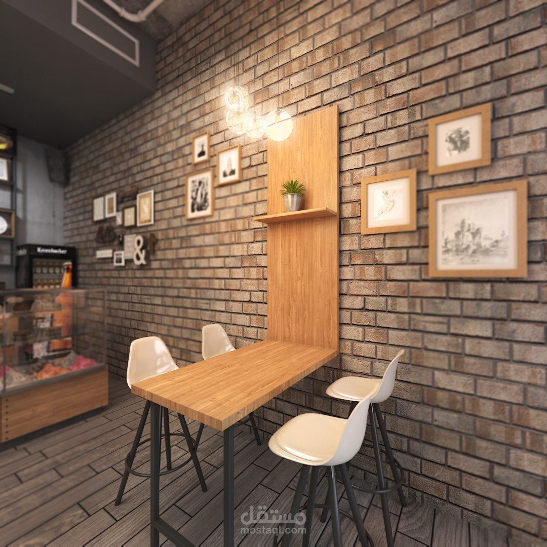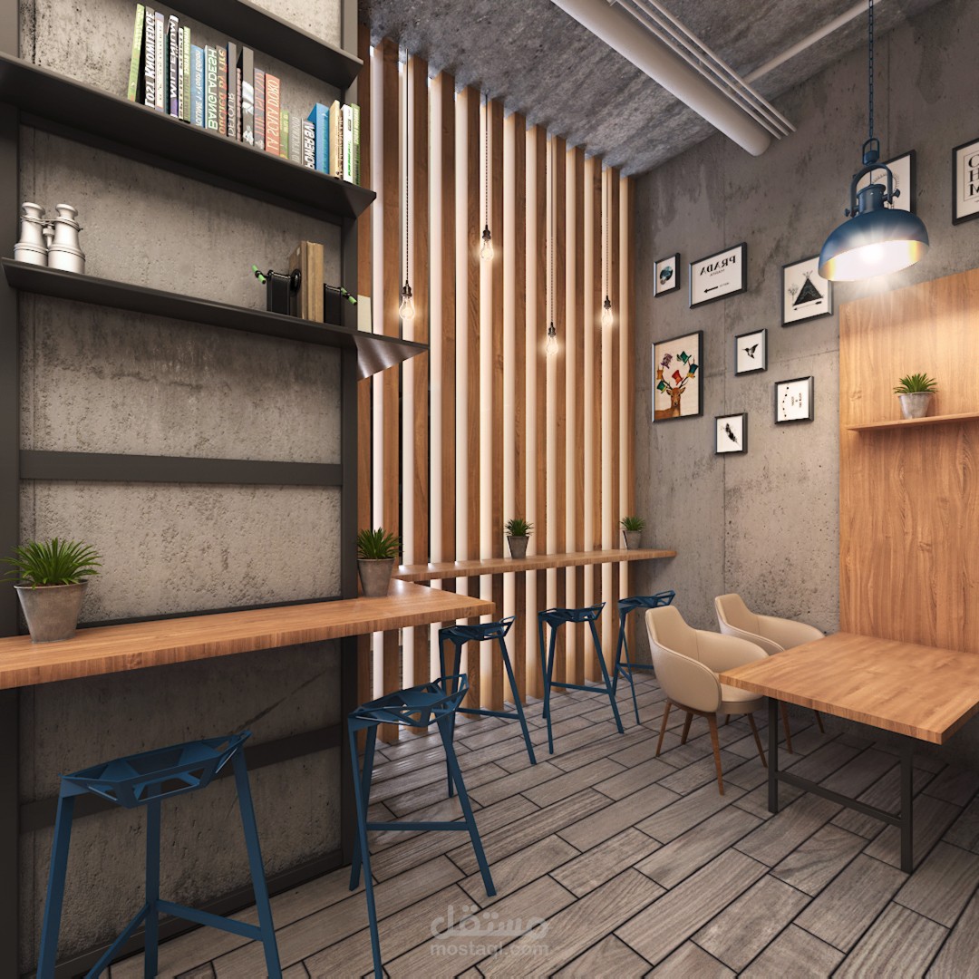 تصميم داخلي لكافتيريا على الطراز الصناعي الحديث ضمن مول تجاري في مدينة دمشق
