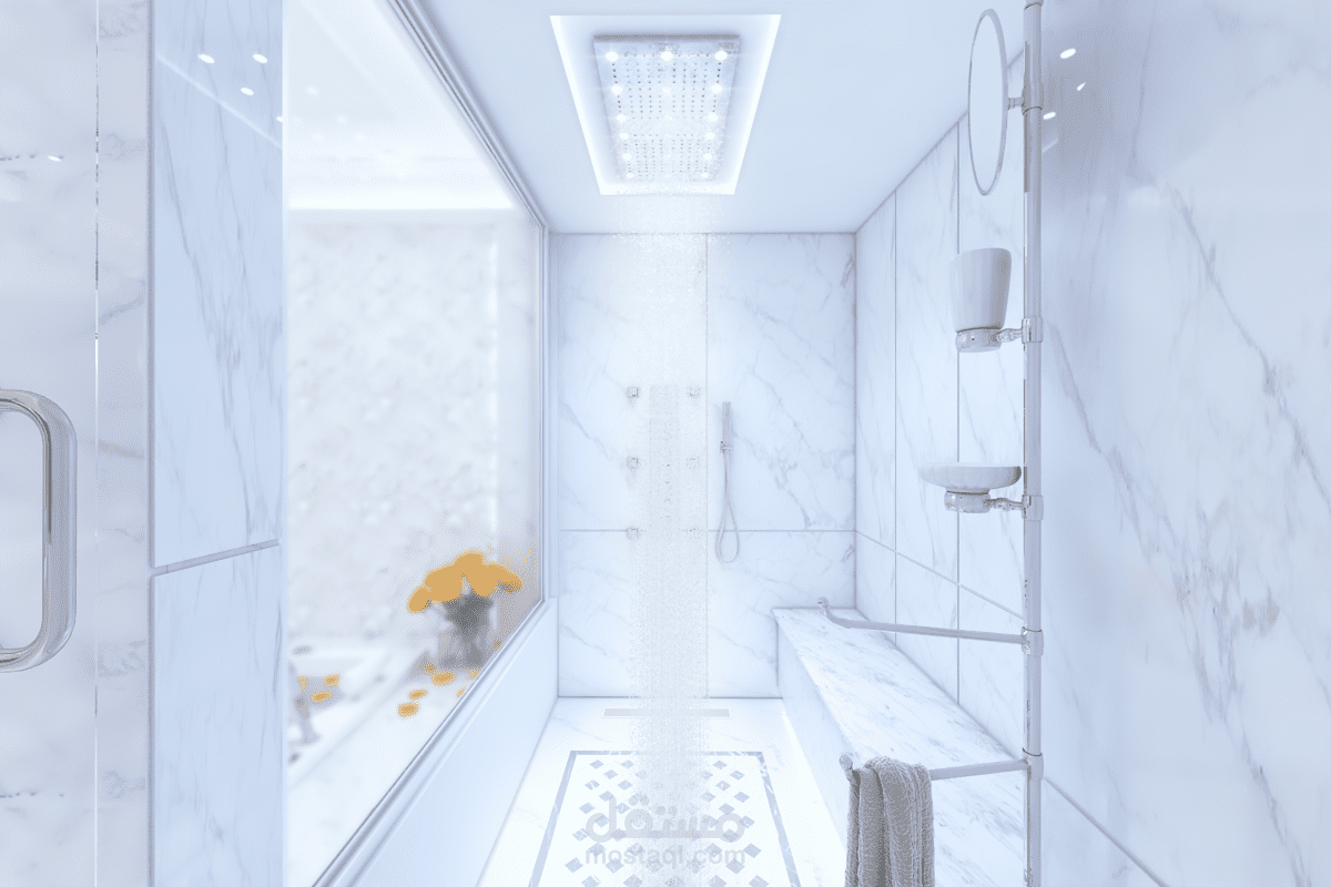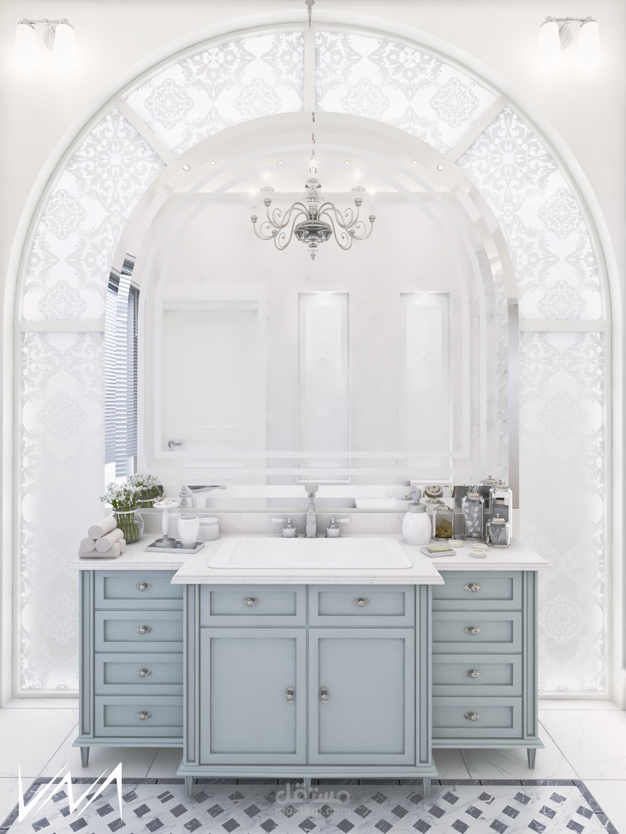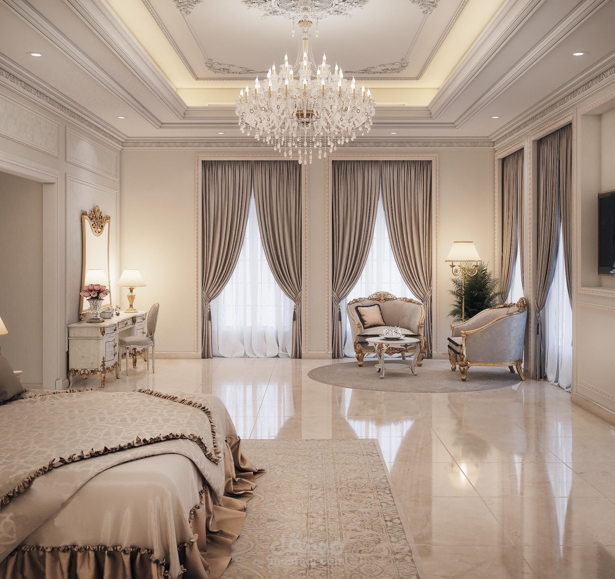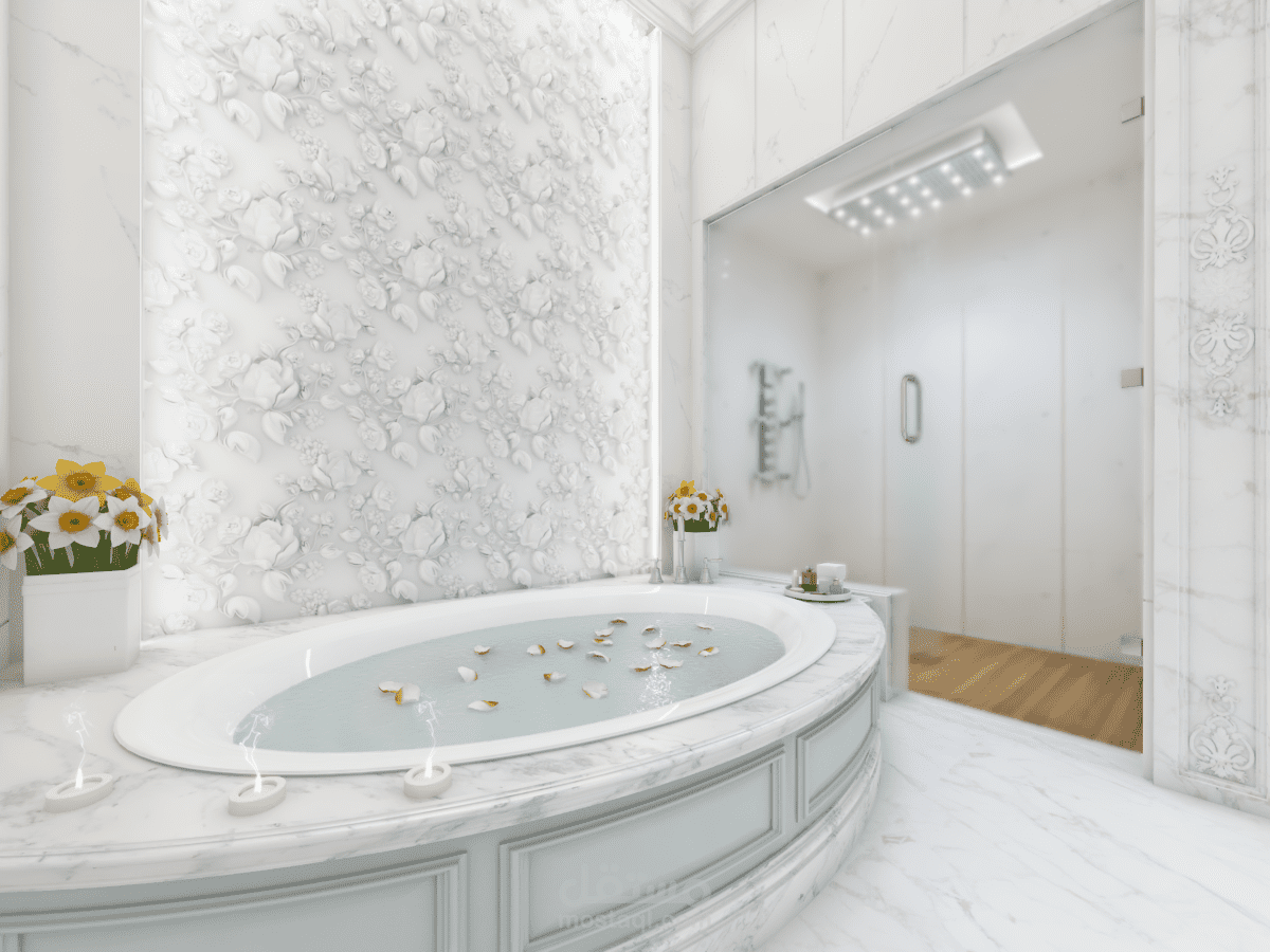 تصميم لغرفة نوم فخمة مع حمامها الخاص على الطراز الكلاسيكي الحديث ضمن فيلا في مدينة دبي