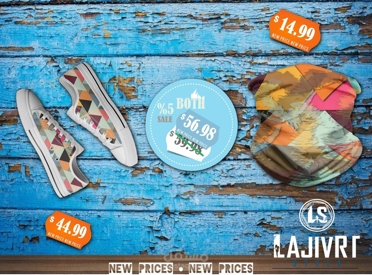 تم تحضير القالب الخاص بالتصميم ورفع التصميم على المنتجات ثم تم تصميم موكاب للعرض خاص بالمنتجات ووضع التفاصيل الخاصة بالعرض.