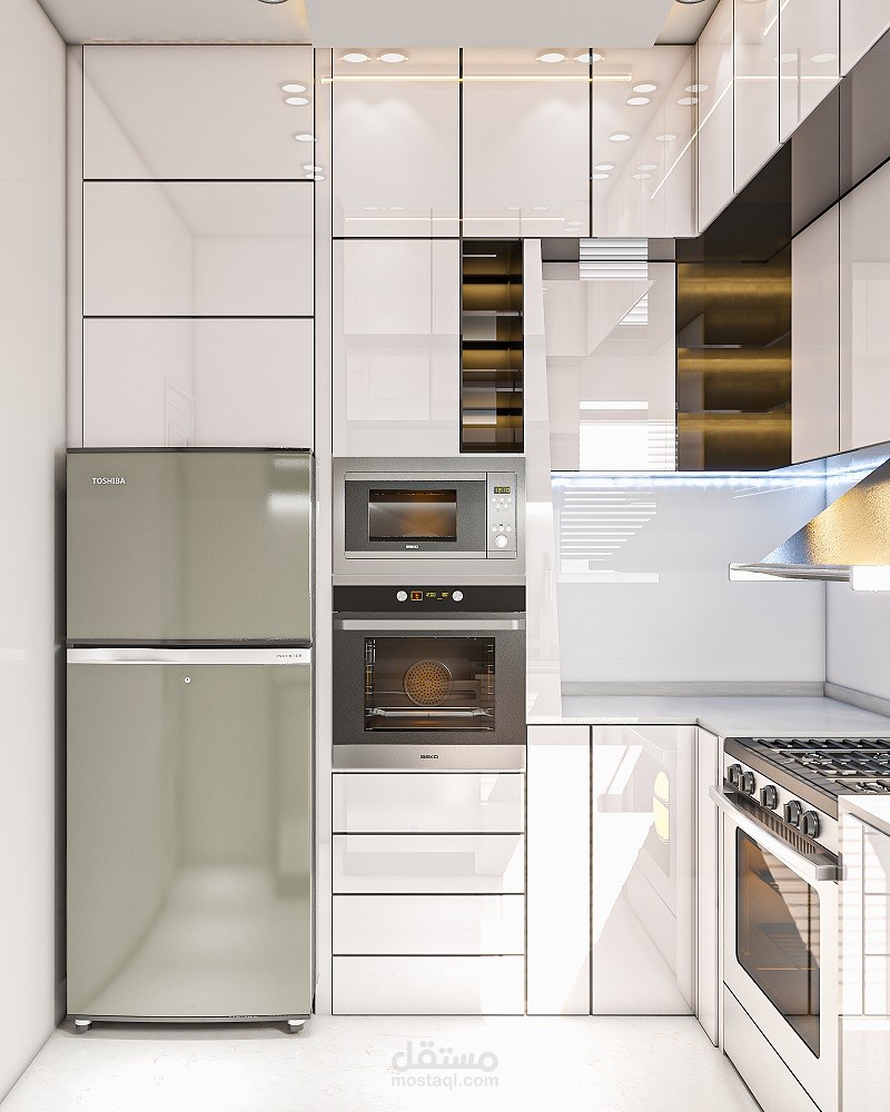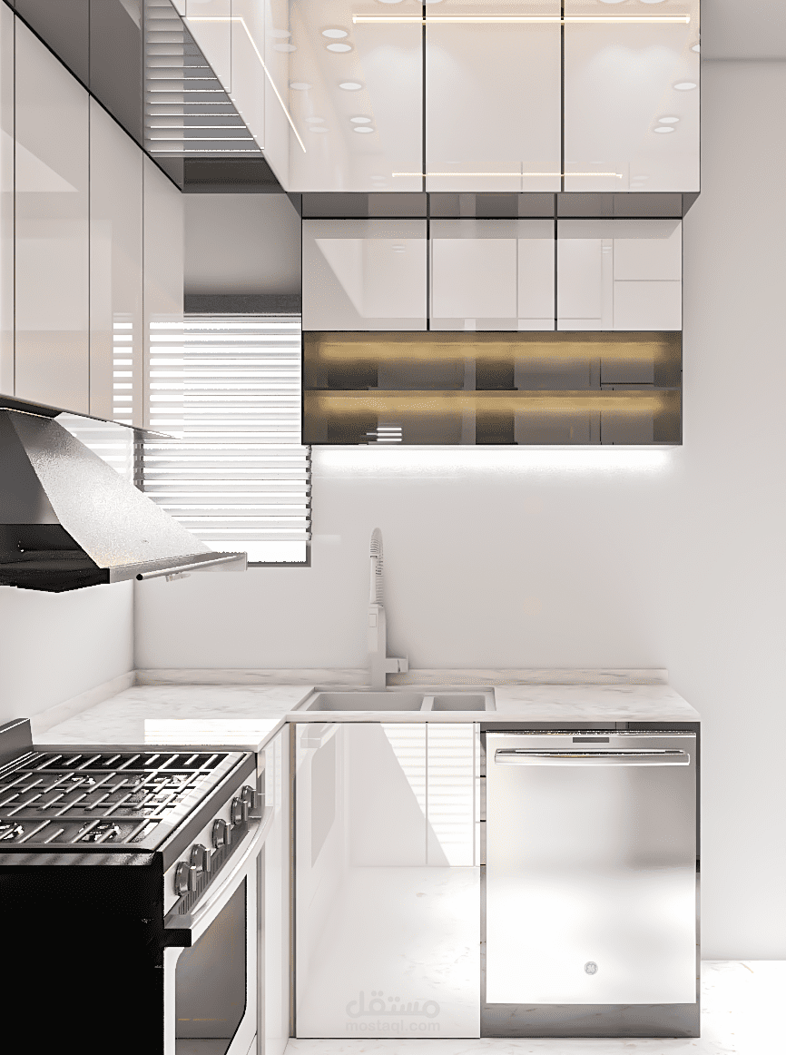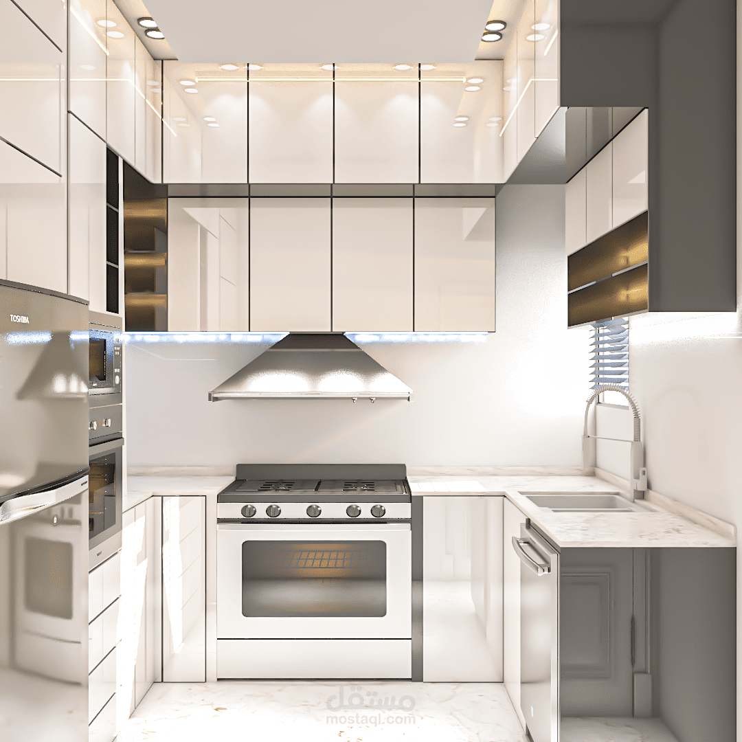 تصميم مطبخ من مادة البولي لاك الابيض باستخدام برنامج الكاد والثري دي ماكس والفوتوشوب ..