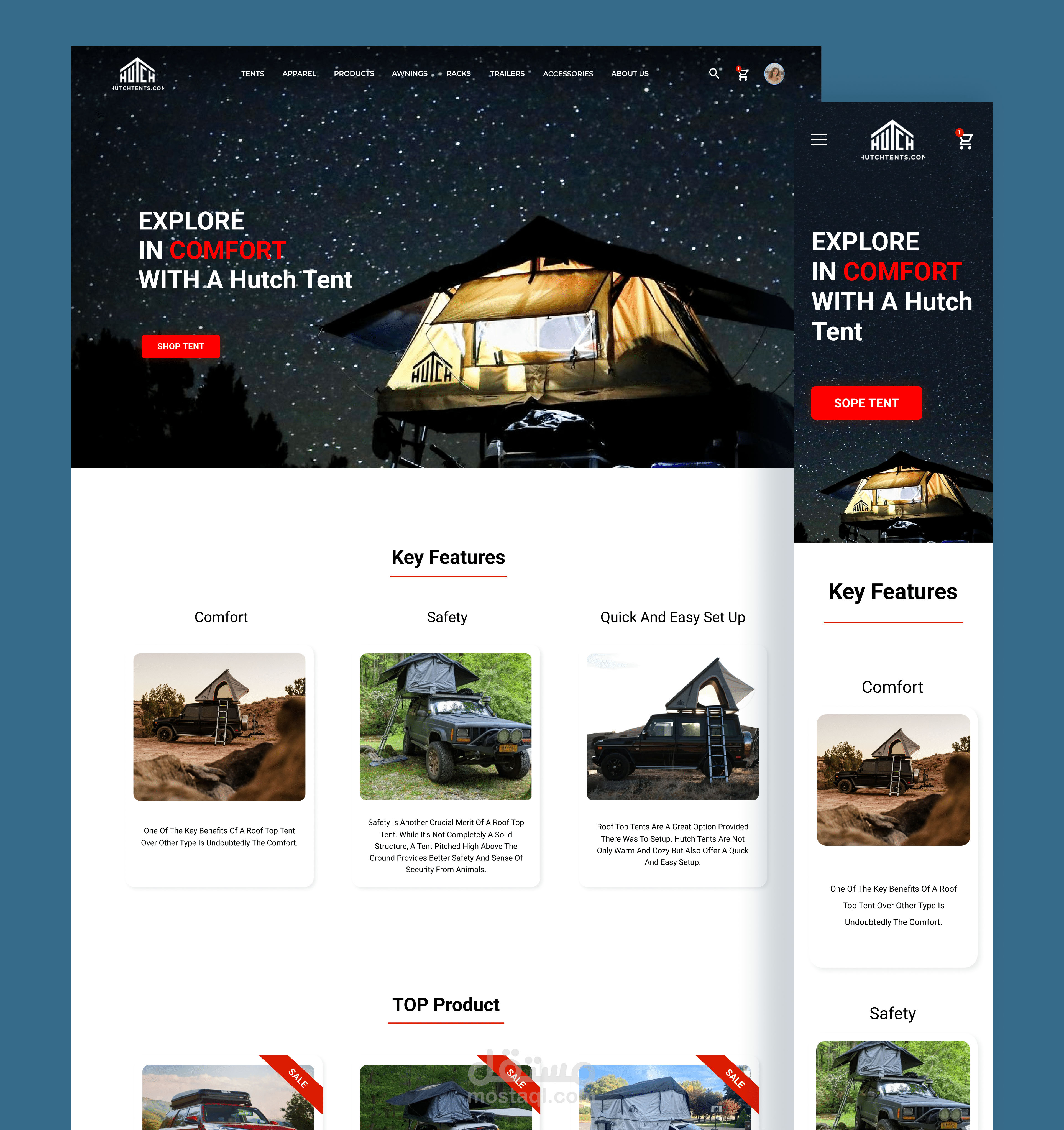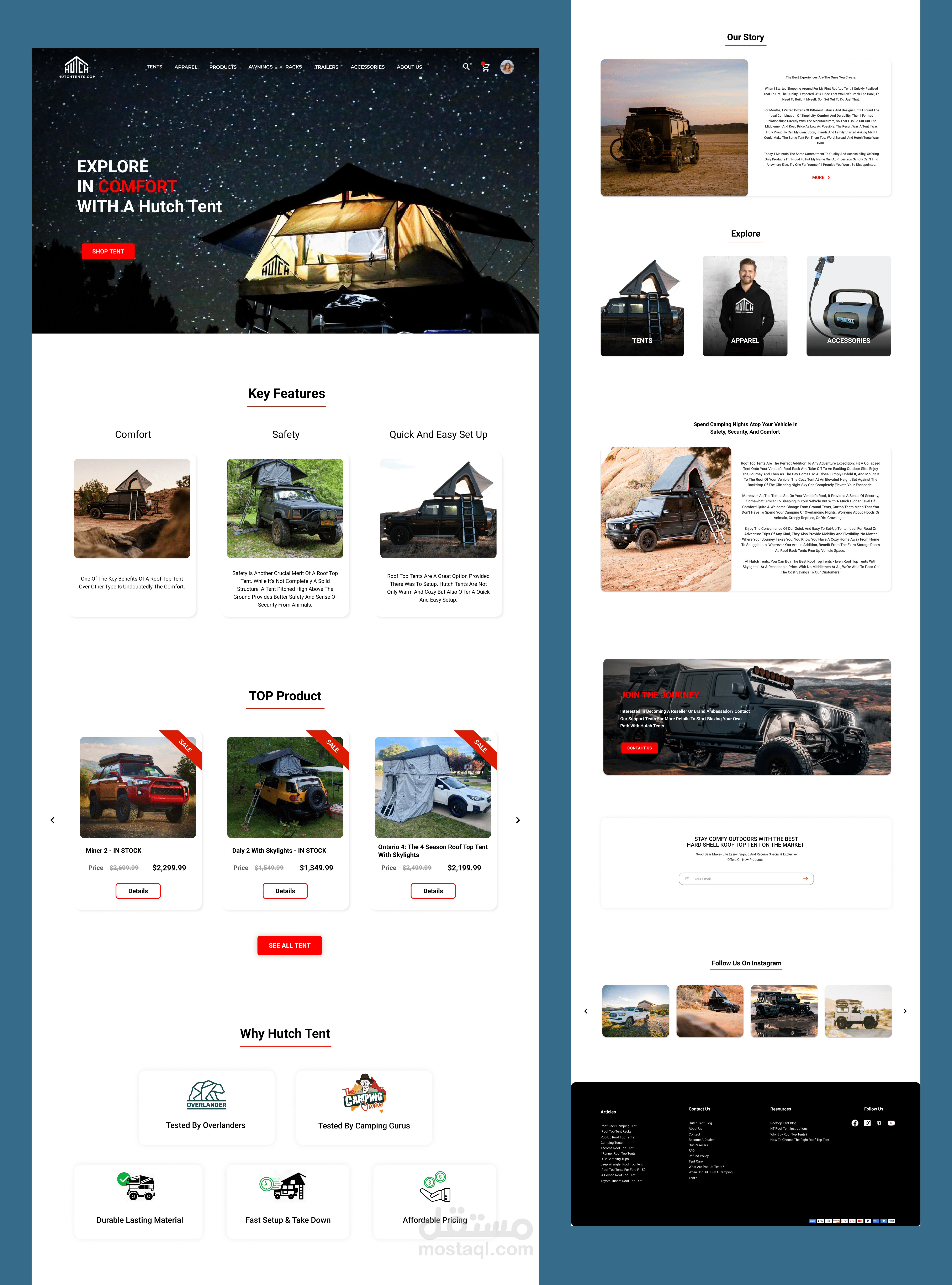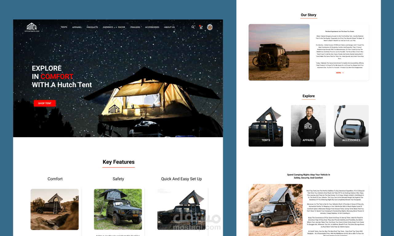 Hutch is a tent company and this is the redesign of its home page, the home page is the most important page on the site because it gives the first impression to the customer and makes him decide whether to continue browsing the site or not, in addition to knowing him about the company, its goals, and features, the most important products and more, so it should be simple and understandable And encouraging to continue browsing the site, and this is exactly what was achieved in this re-design
