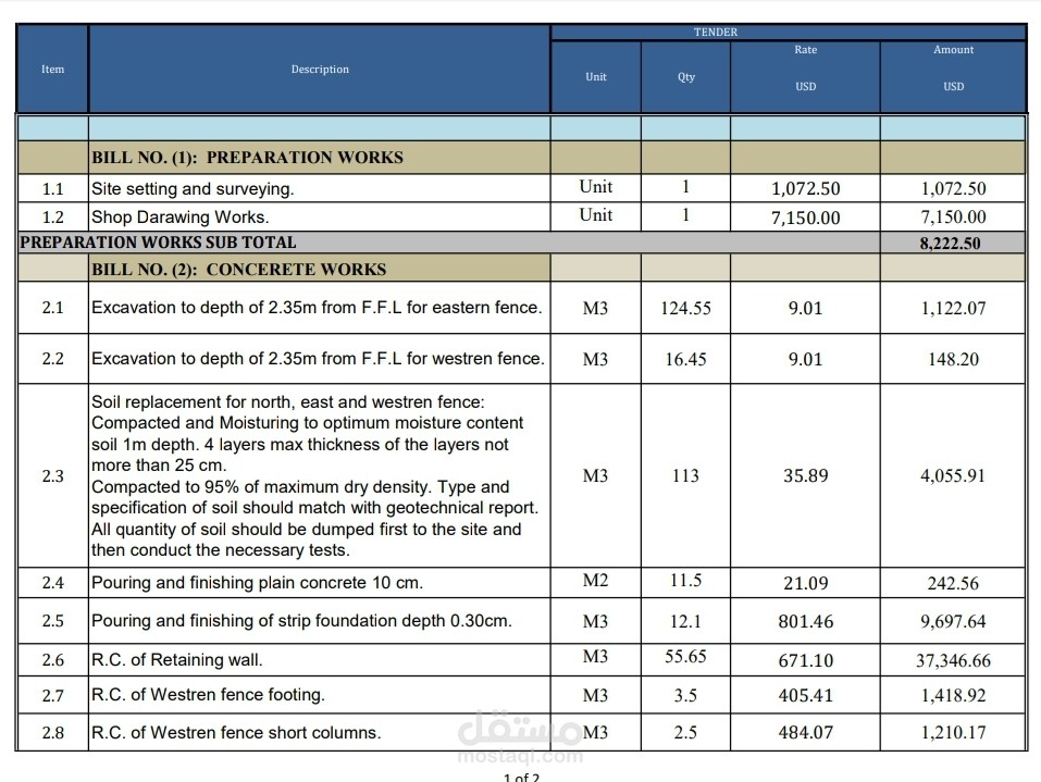 جدول كميات ومواصفات لأعمال إنشائية لفيلا.
