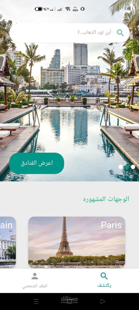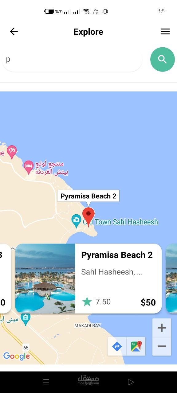 تطبيق لعرض الفنادق على مساحة محددة ع الخريطة وامكانية تصفح الفنادق والحجز وباللغتين العربية والانجليزية.