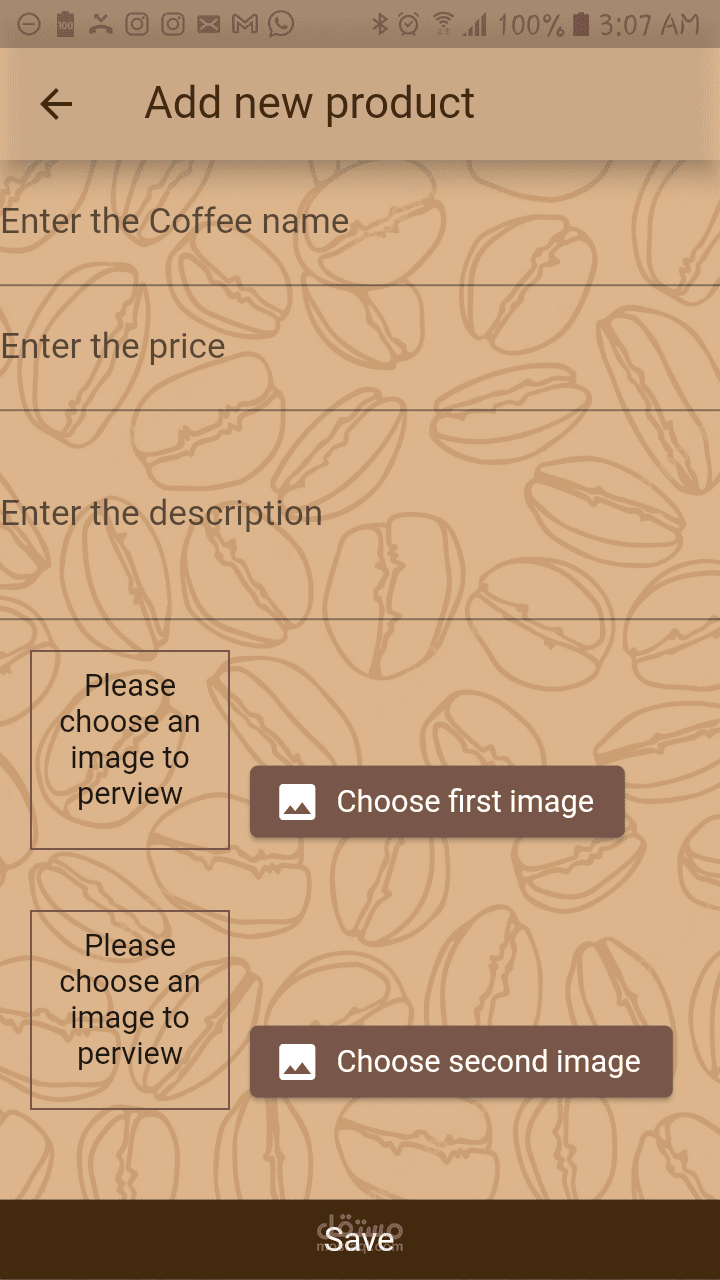 تطبيق خاصة بمتجر لبيع منتجات القهوة، يتيح للمستخدم تصفح منتجات القهوة المختلفة واضافة منتجات الى العربة الخاصة به، كما يوجد به واجهة خاصة للمدير لاضافة او تعديل او مسح المنتجات.