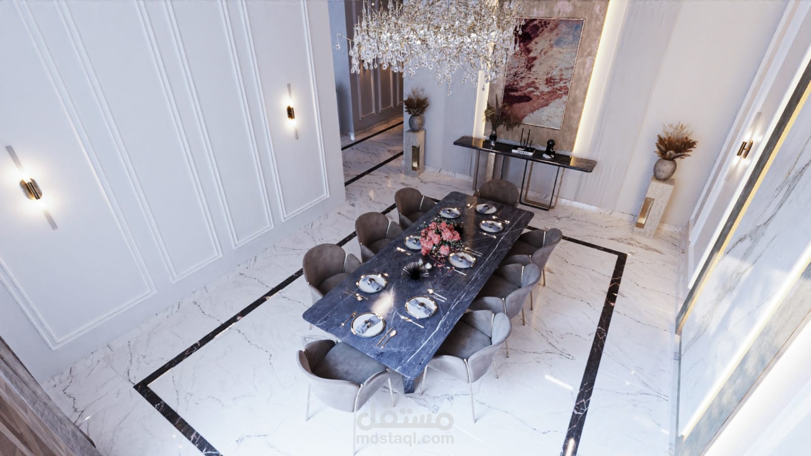 العمل التصميمي المرفق من ضمن أعمالنا في ماكس للاستشارات الهندسية ووهو عمل ناتج عن فريق عمل متكامل من المهندسين المبدعين .. كل في مجال ابداعه من تصميم - تنسيق مع أعمال التكييف والكهرباء ودراسة تصميم الاسقف وارتفاعاتها مع الجسور الإنشائية... اختيار الخامات بما يتوافق مع ذوق العميل ، ميزانيته وتوافر الخامات في السوق الكويتي .... وانتهاء باظهار العمل على برامج الاظهار المعماري ومن ثم تجهيز المخططات التنفيذية بما يتطابق مع التصميم ... دوري كان الإشراف على جميع المراحل التي ذكرت أعلاه من مرحلة التصميم وانتهاء بالرسومات التنفيذية ومتابعه مراحل التنفيذ مع العميل بدءا من مرحلة شراء الخامات من السوق المحلي ومطابقتها مع الخامات الناصفة في الرسومات التنفيذية والثري دي والتنويه إلى الاخطاء الموقعية ان وجدت وتلافيها وإيجاد الحلول لها وانتهاء بمتابعة مراحل التنفيذ كاملة وينوه ان العمل التصميمي بالذات هو نتاج التعاون بين فريق العمل المبدع وتكامل كل في دوره