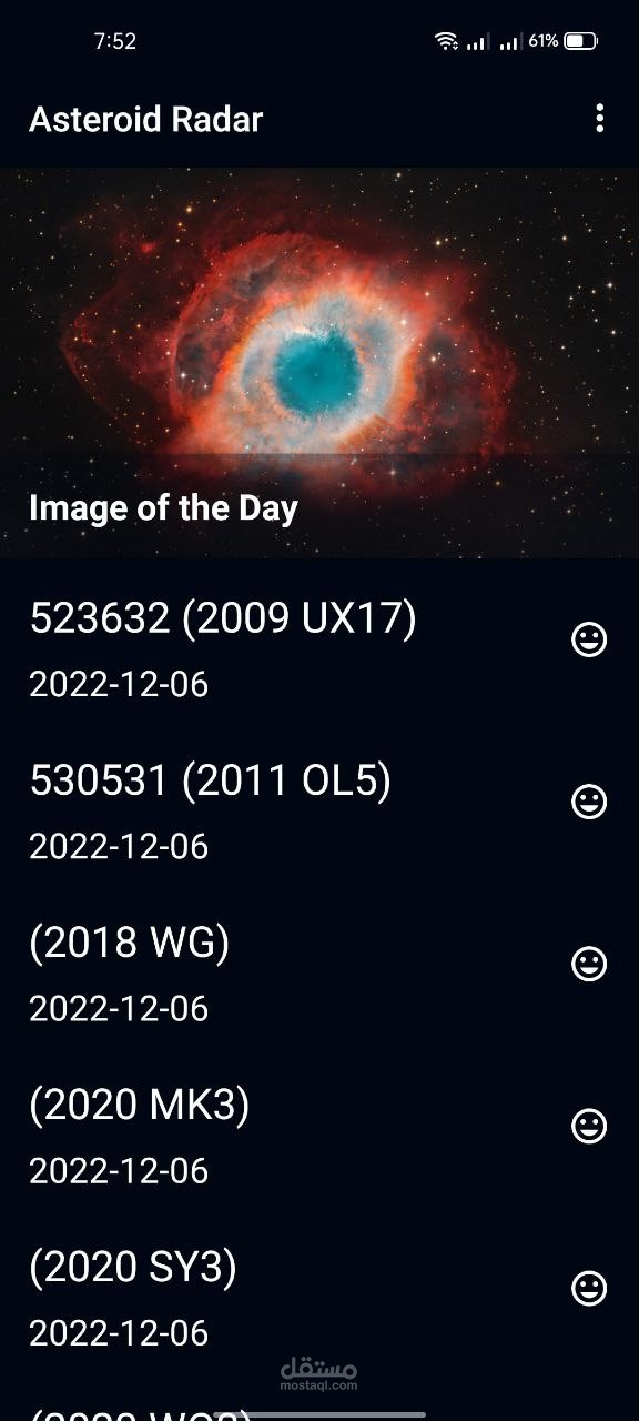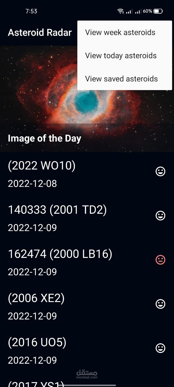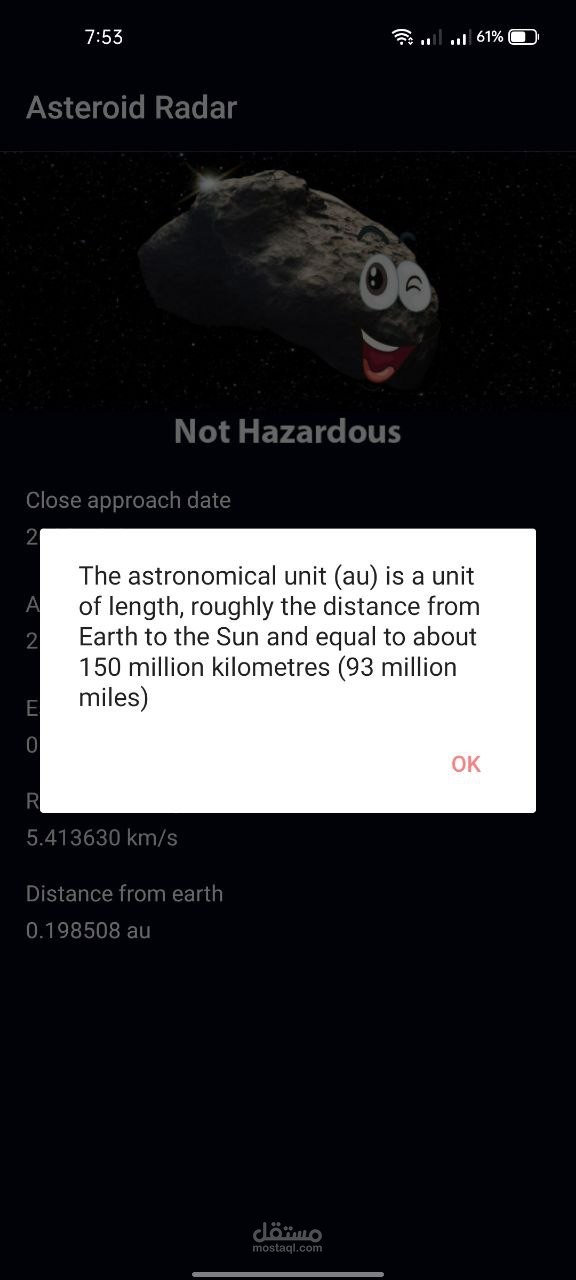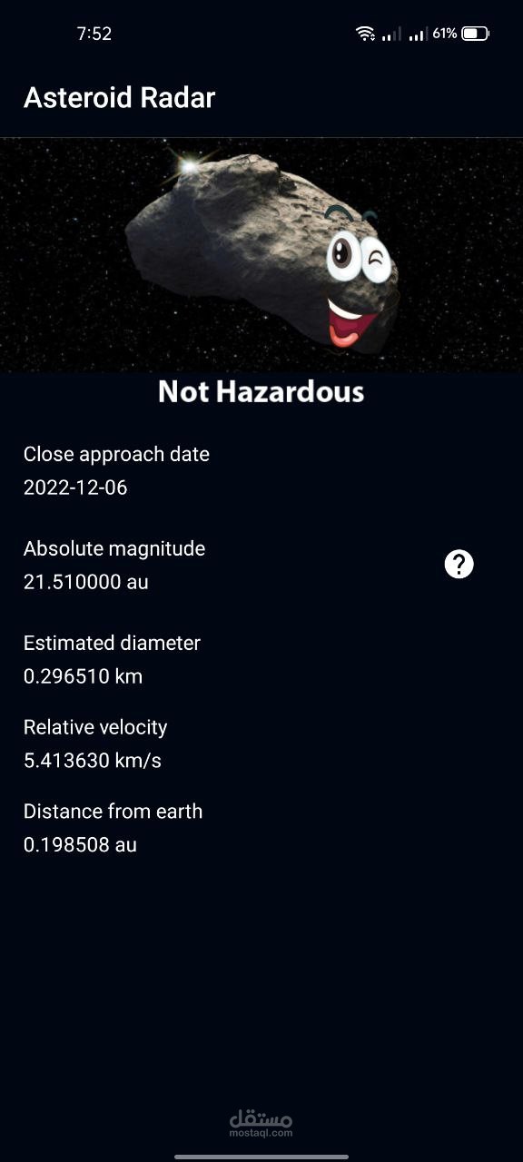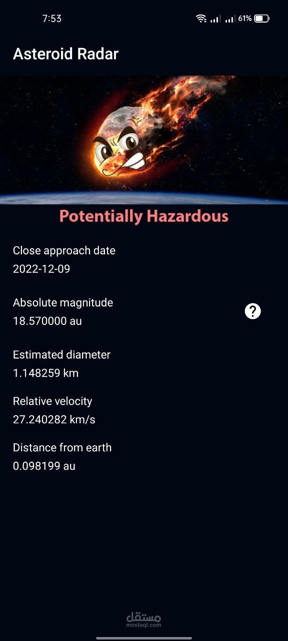 Asteroid Radar is an app to view the asteroids detected by NASA that pass near Earth, you can view all the detected asteroids in a period of time, their data (Size, velocity, distance to Earth) and if they are potentially hazardous.