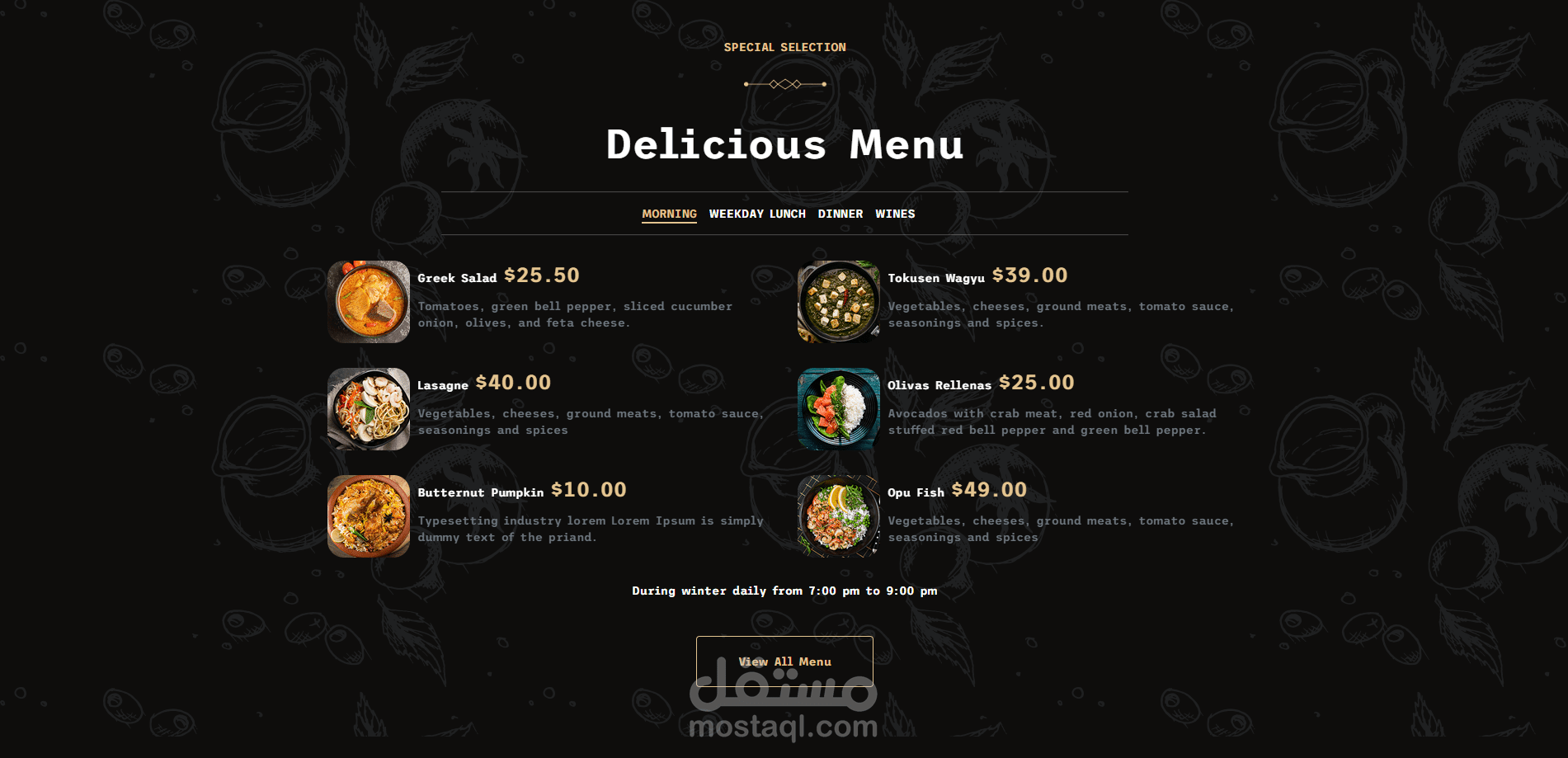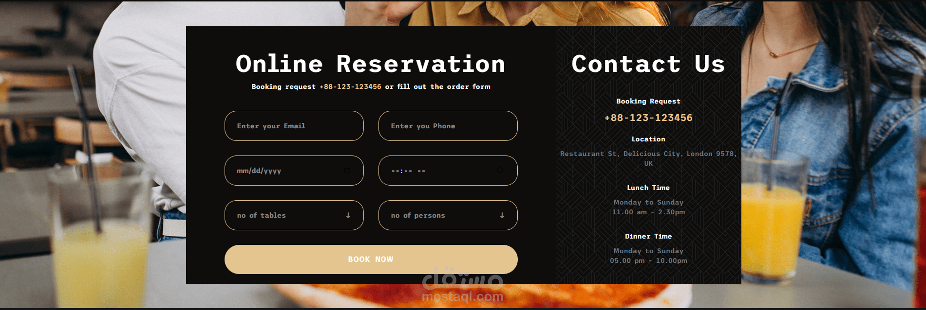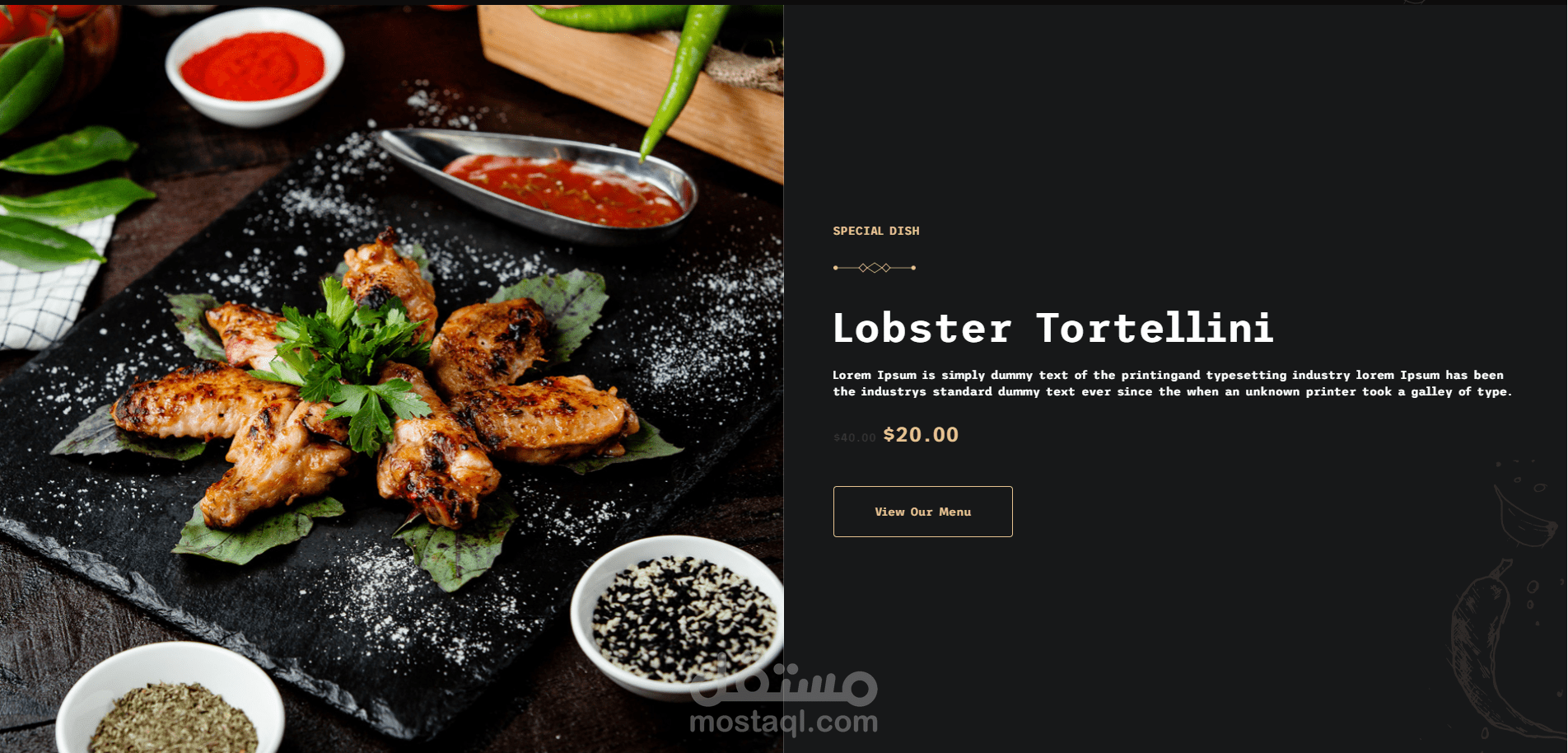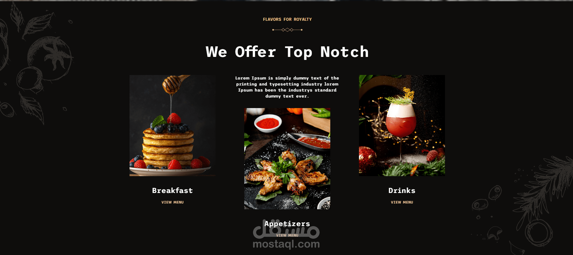 تصميم موقع لمطعم يعرض عليه وجباته التي يقوم بتقديمها الي عملائه واسعارها ويمكن من خلاله ايضا يقوم العميل بحجز موعد له قبل الذهاب الي المطعم وقمت باستخدام Html , CSS and Bootstrap لاتمام عمل هذا الموقع.