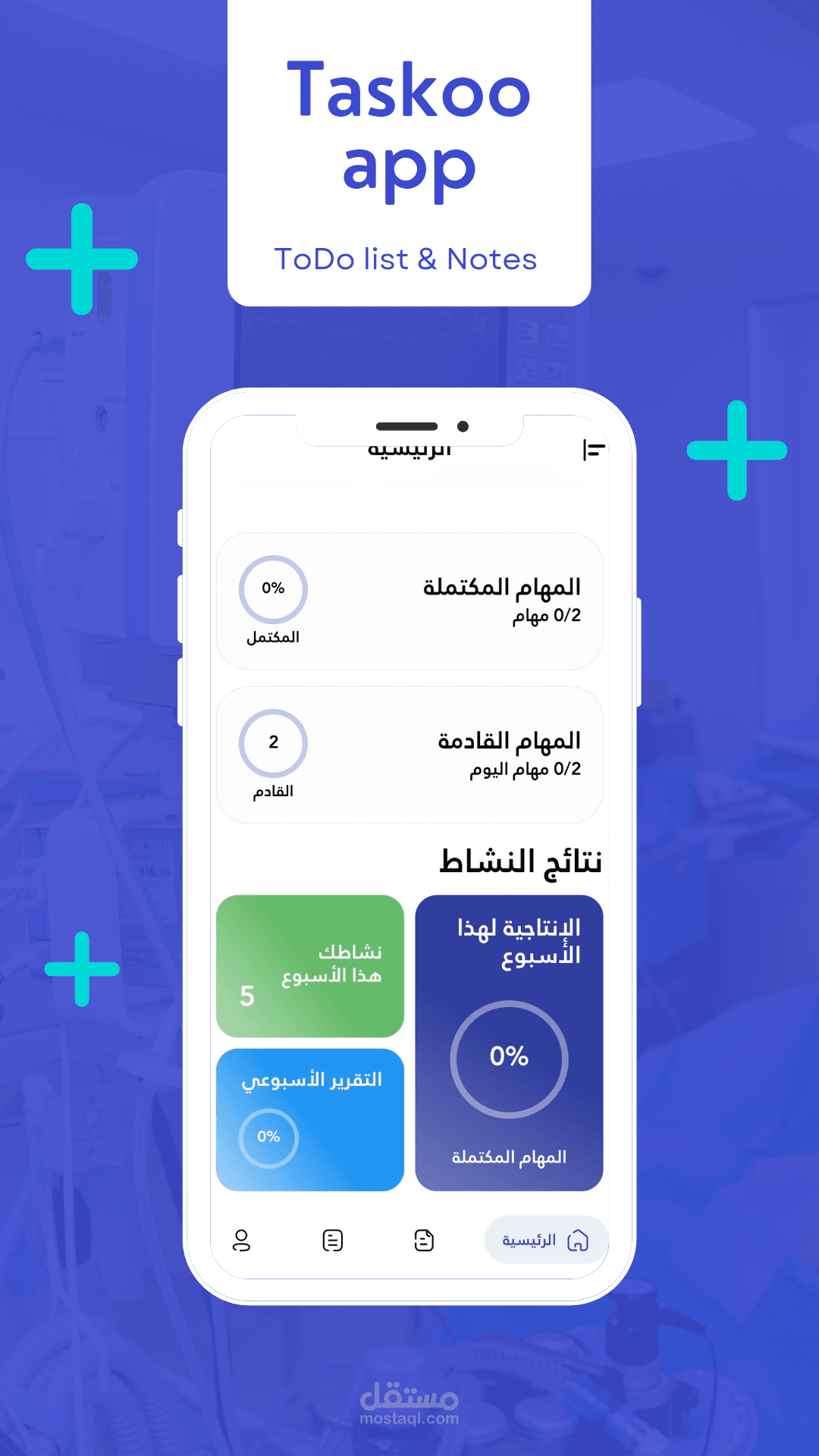 First page contains your daily and weekly report as well as the number of performed tasks and the left ones , with percentage of your productivity for the week.