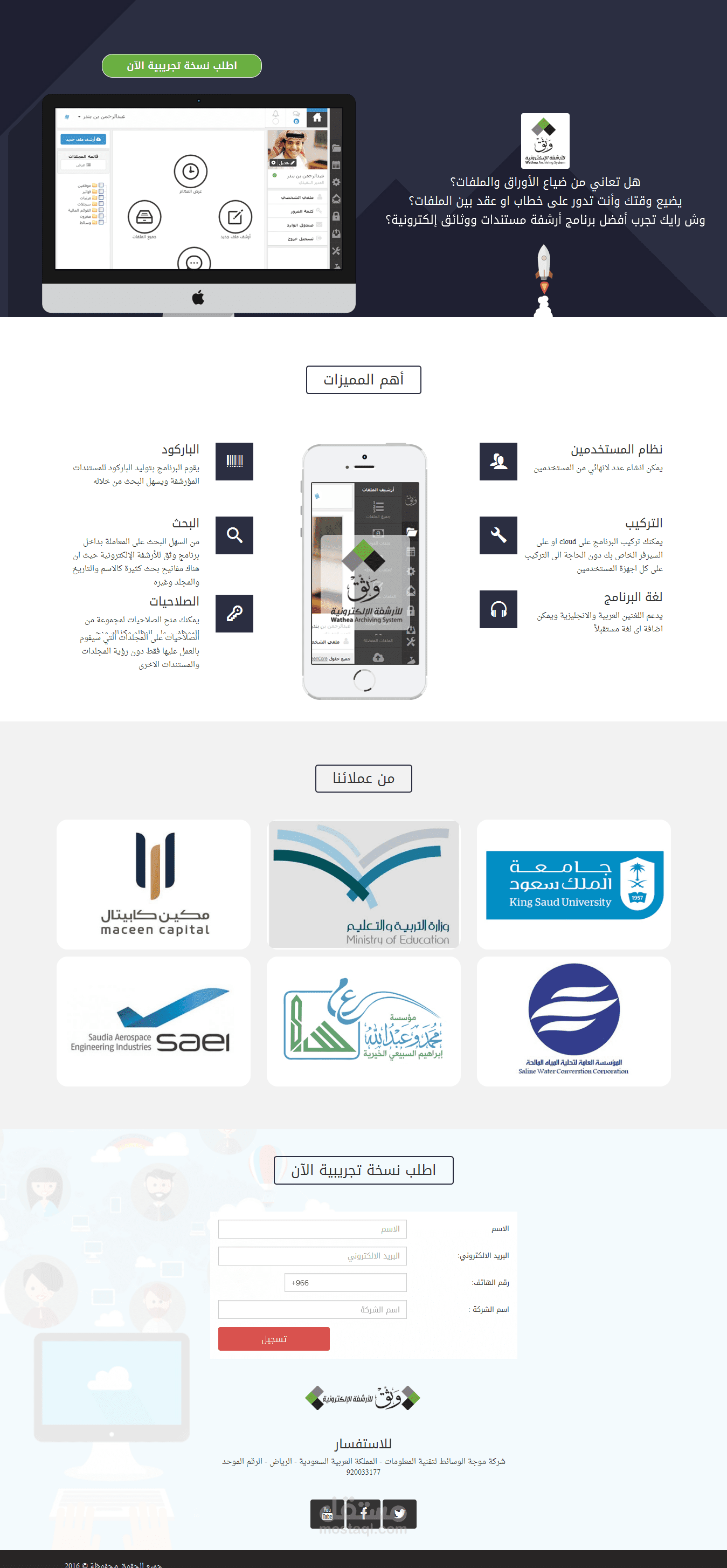 تصميم و تنفيذlanding page برنامج أرشفة إلكترونية للمستندات والوثائق تم عرض (أهم المميزات - من عملائنا -اطلب نسخة تجريبية ) جميع الحقوق محفوظة لبرنامج وثق
