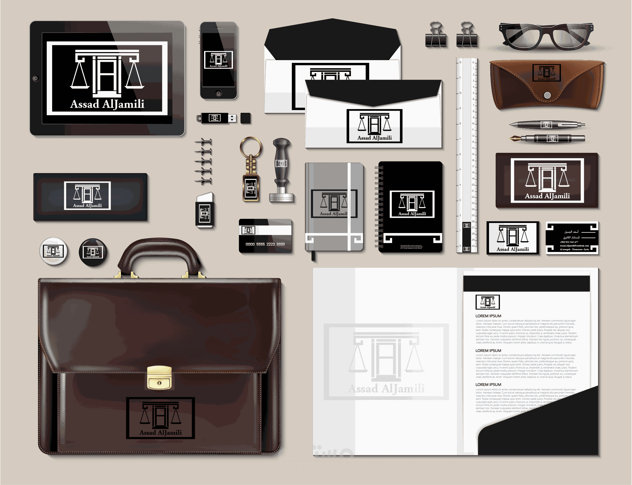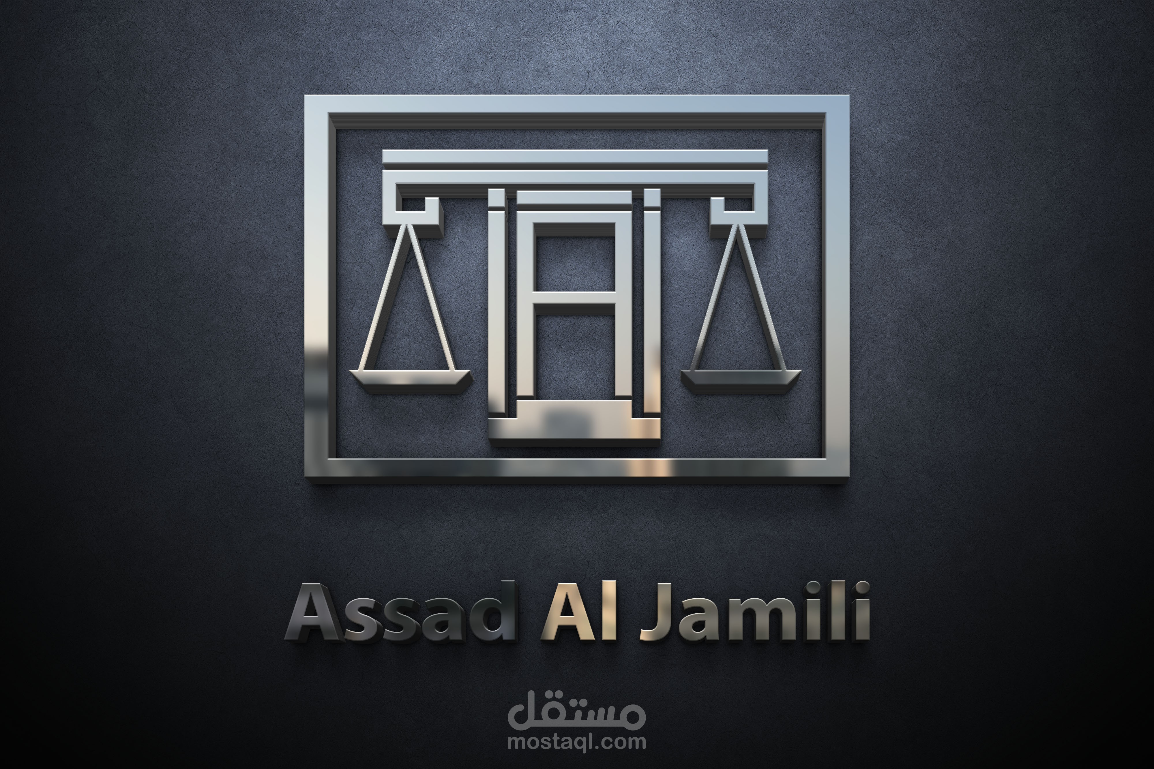 الفكرة هي عبارة عن دمج اسم المحامي بميزان العدل بما يتناسب من اسم المحامي كما هو موضح في الشكل