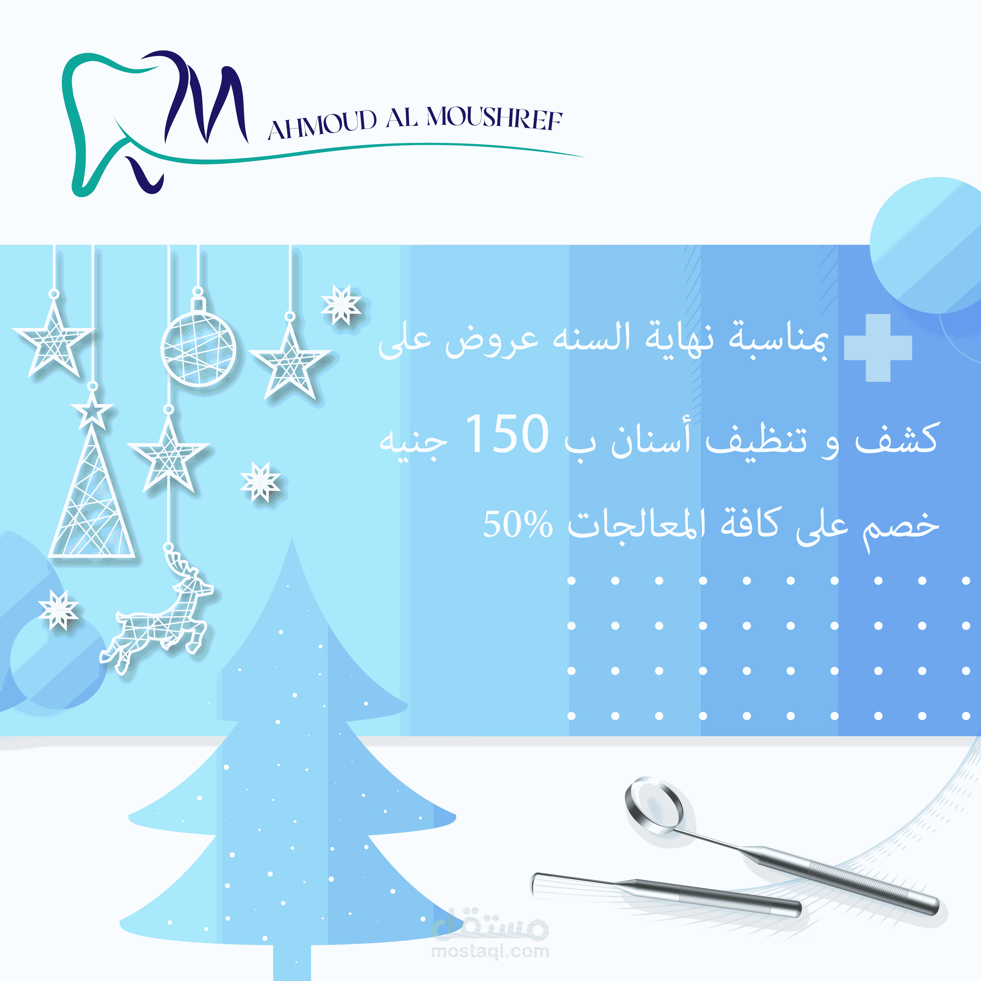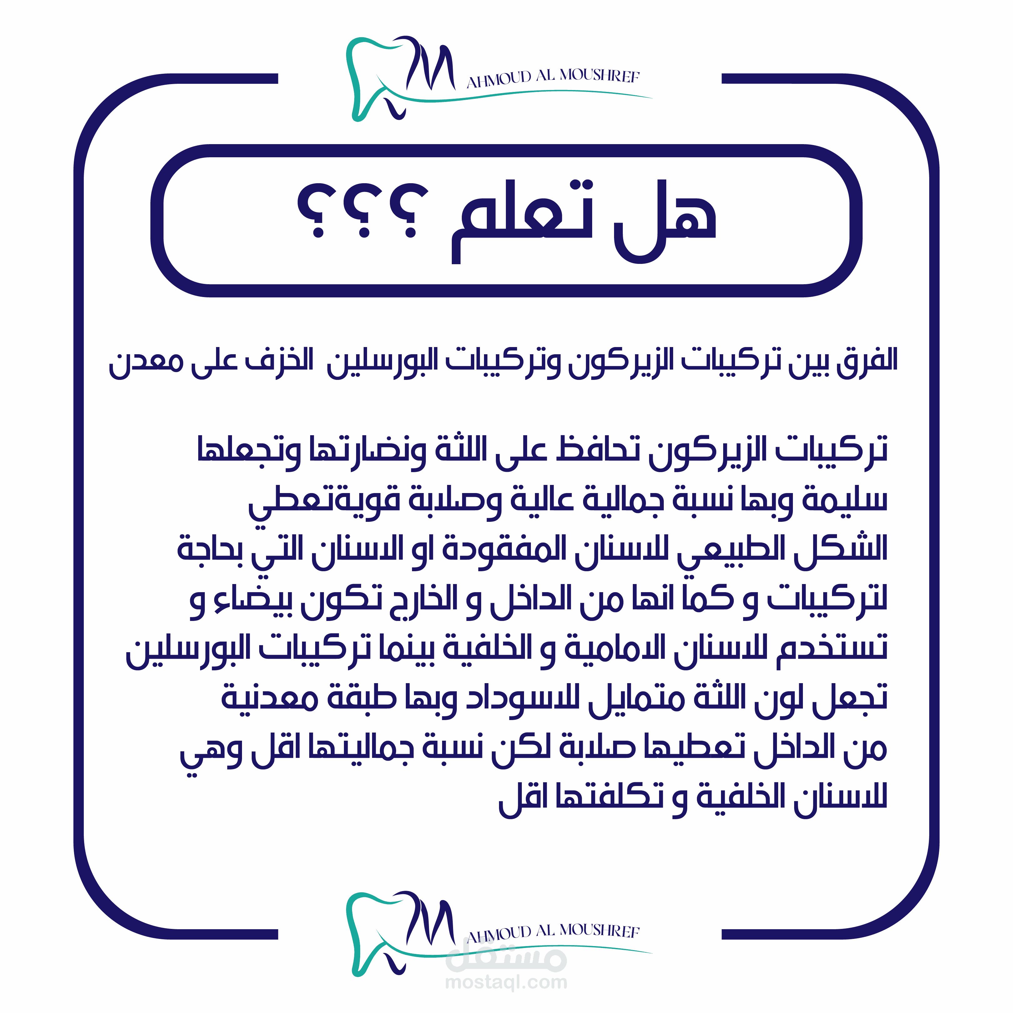 دكتور أسنان فكرة التصميم هي دمج اسم الدكتور مع السن من خلال حرف الأول من اختيار خط مناسب للوغو تم ادارة صفحات التواصل الاجتماعي الخاصة به من خلال الادارة و التصميم و خلق افكار تسويقية