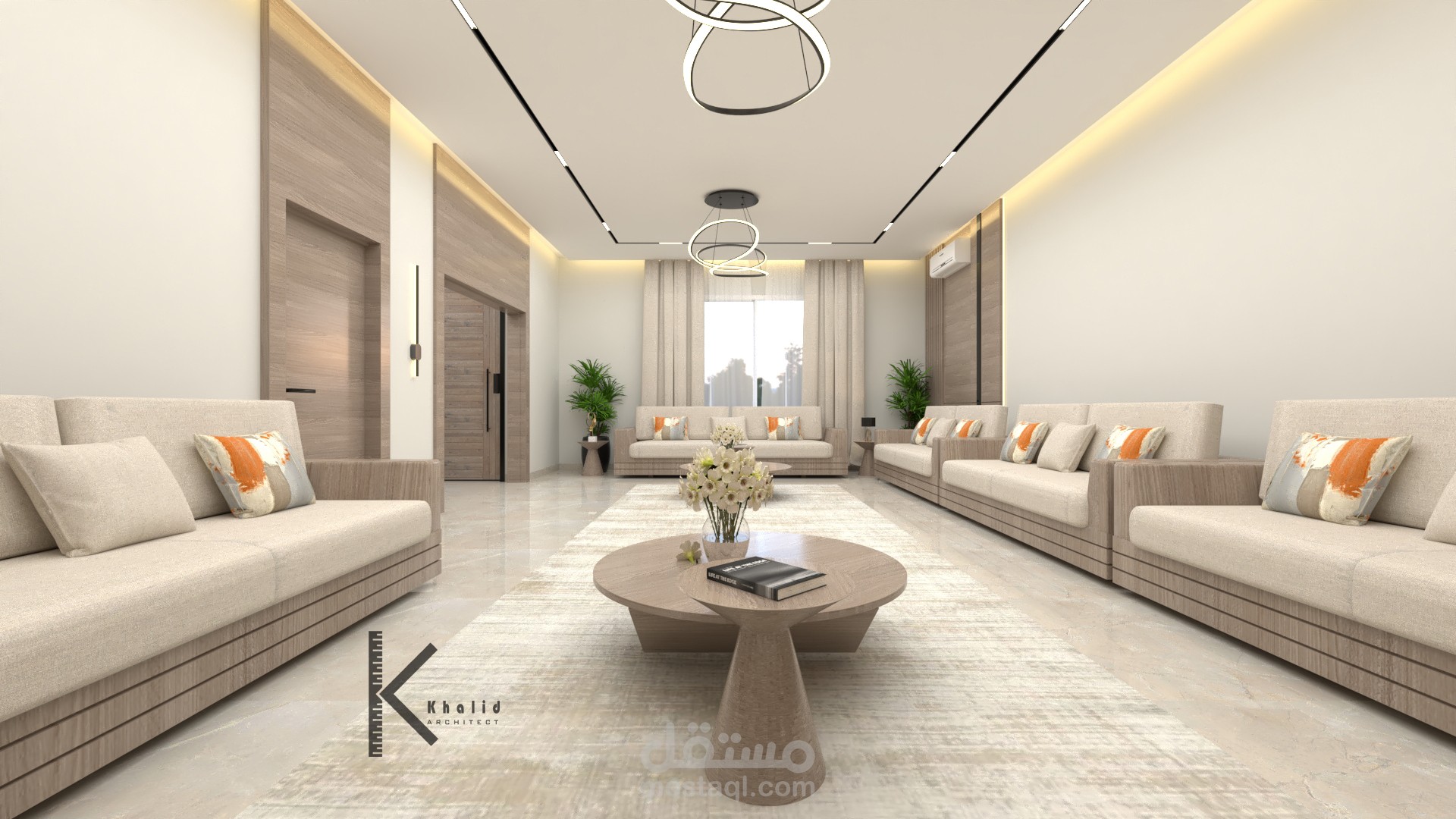 تصميم داخلي لمجلس رجال مع المدخل على الطراز المودرن بالمملكه وتجهيز المخططات التنفيذية الكهرباء والإنارة وجداول التشطيبات وتسليم ملفات المشروع كامله للتنفيذ