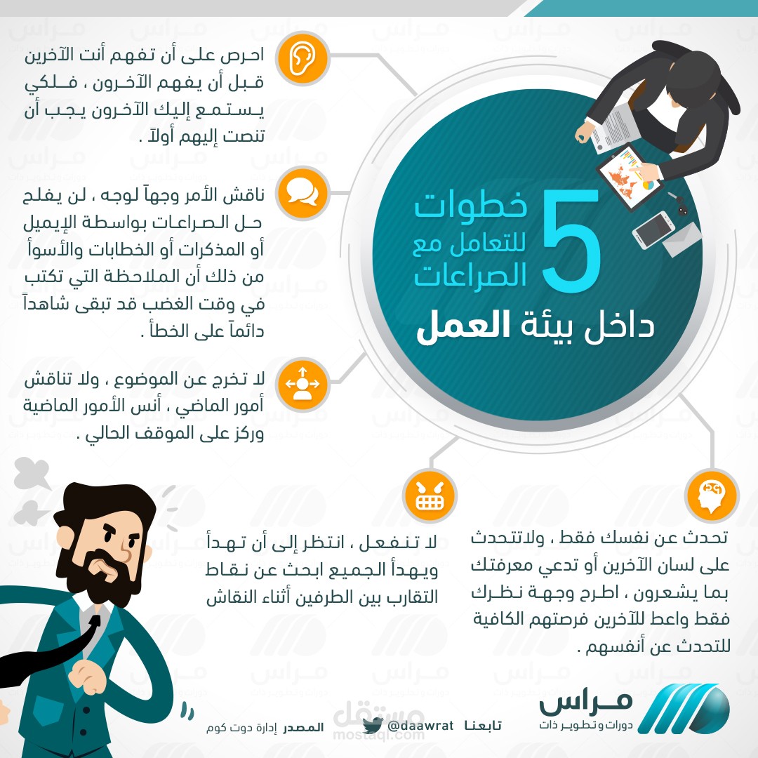 تصميم انفوجرافيك بعنوان 5 خطوات للتعامل مع الصراعات داخل بيئة العمل لصالح مراس