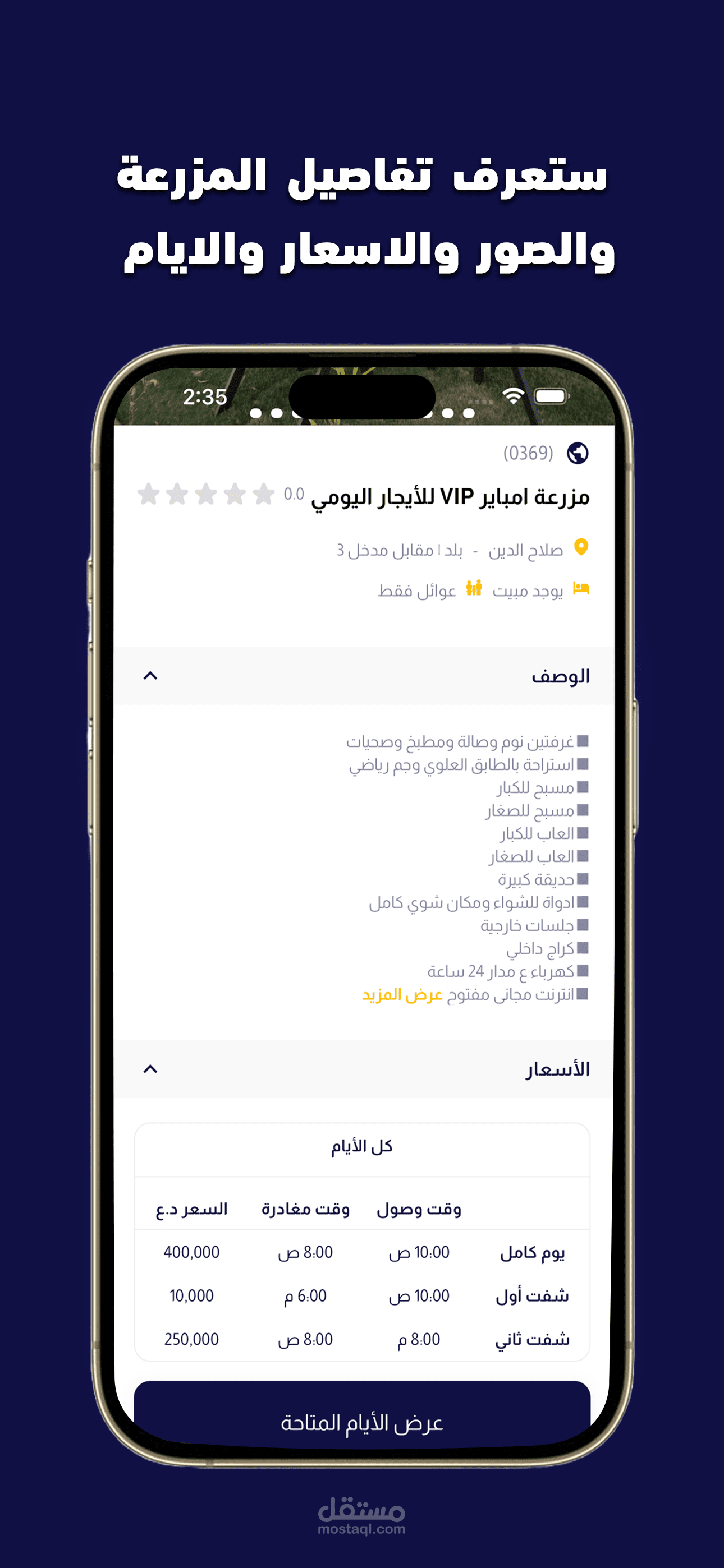 كما يتوفر إصدار خاص بالملاك يتيح لهم إدارة ممتلكاتهم داخل التطبيق، واستلام طلبات الحجز للمزارع والفنادق الخاصة بهم، والرد عليها بكل سهولة. يشمل هذا الإصدار أدوات لإدارة الحجوزات، عرض التواريخ المحجوزة والمتاحة، ومتابعة كافة تفاصيل الطلبات.