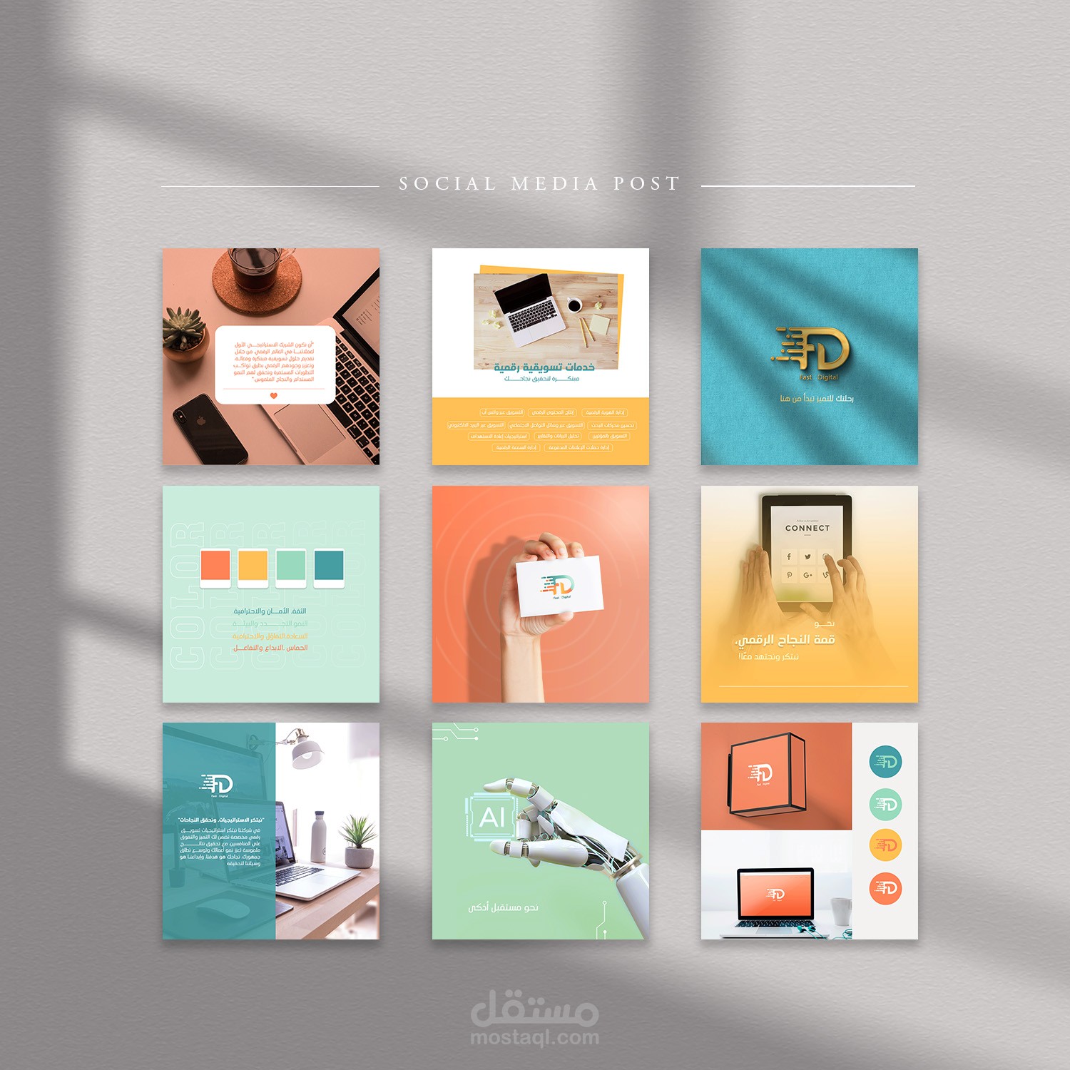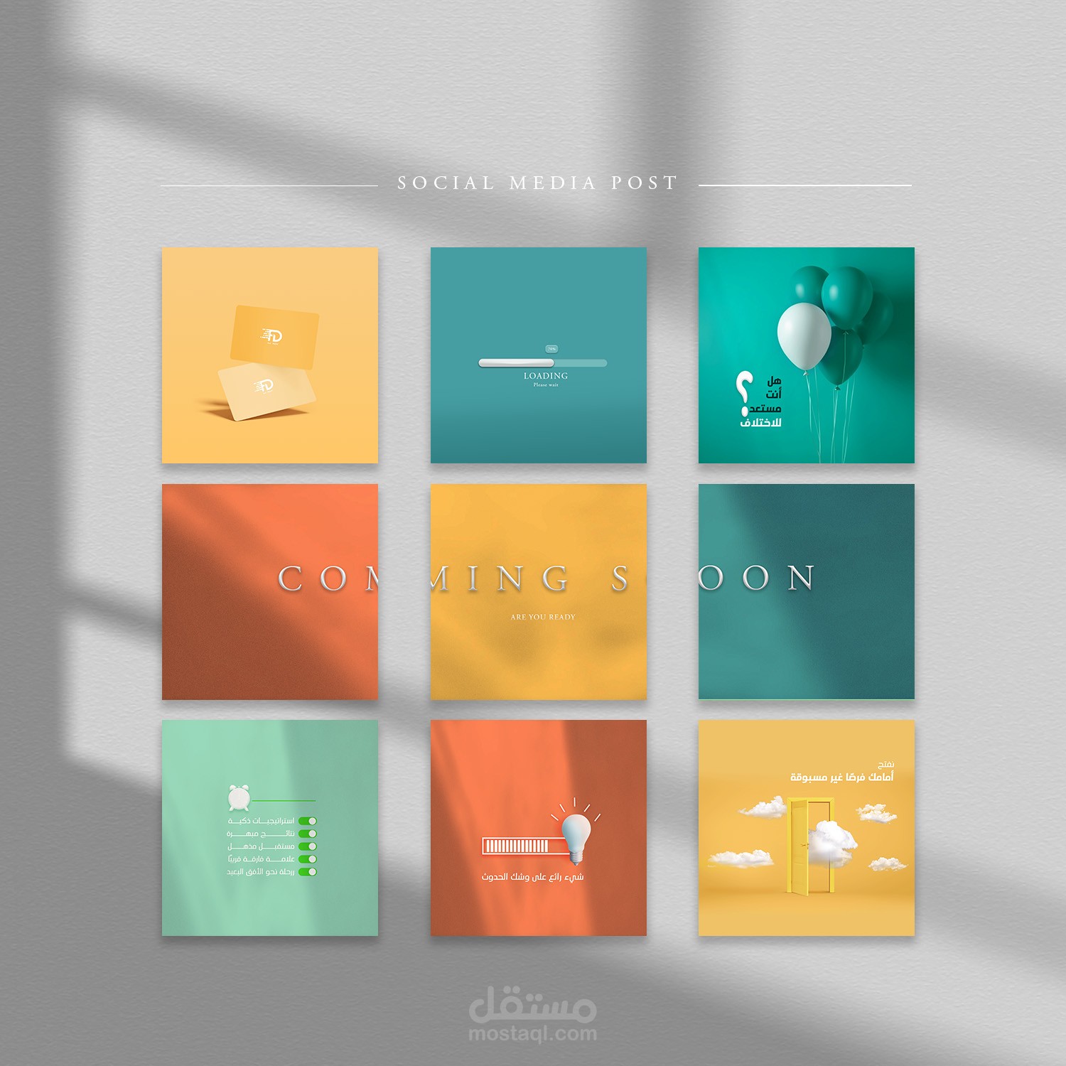 تصميم منشورات تواصل اجتماعي احترافية ومبتكرة بألوان متناسقة وتنسيق جذاب. تم تنفيذ التصاميم بهدف تعزيز الهوية البصرية للعلامة التجارية وجذب المتابعين.