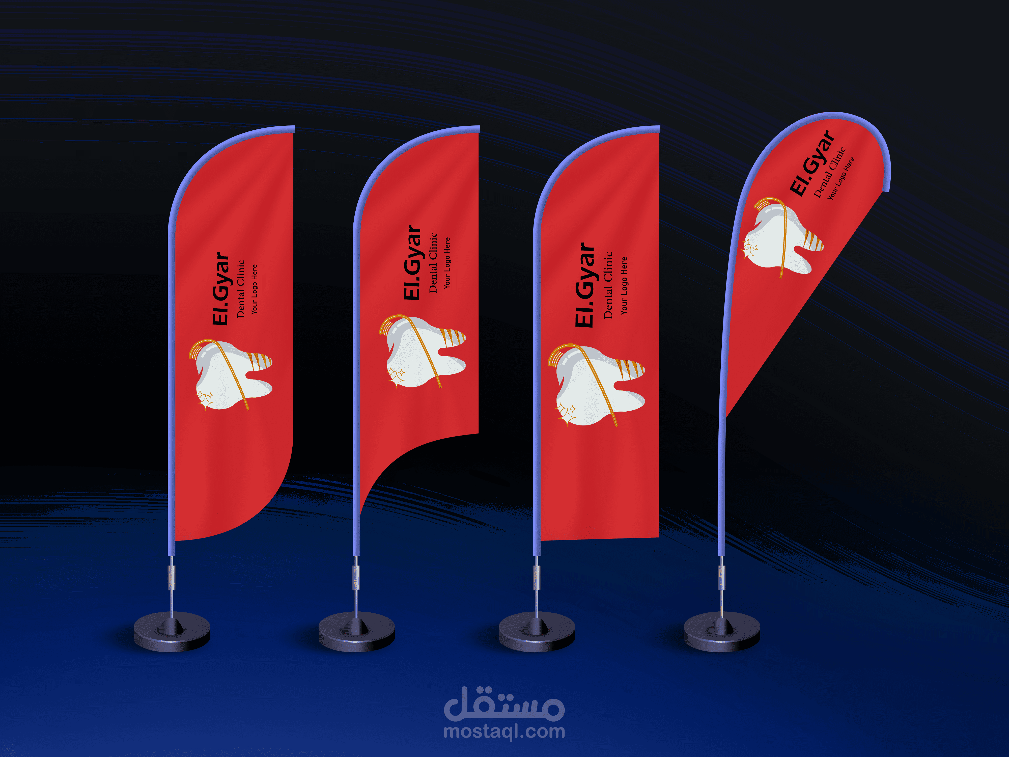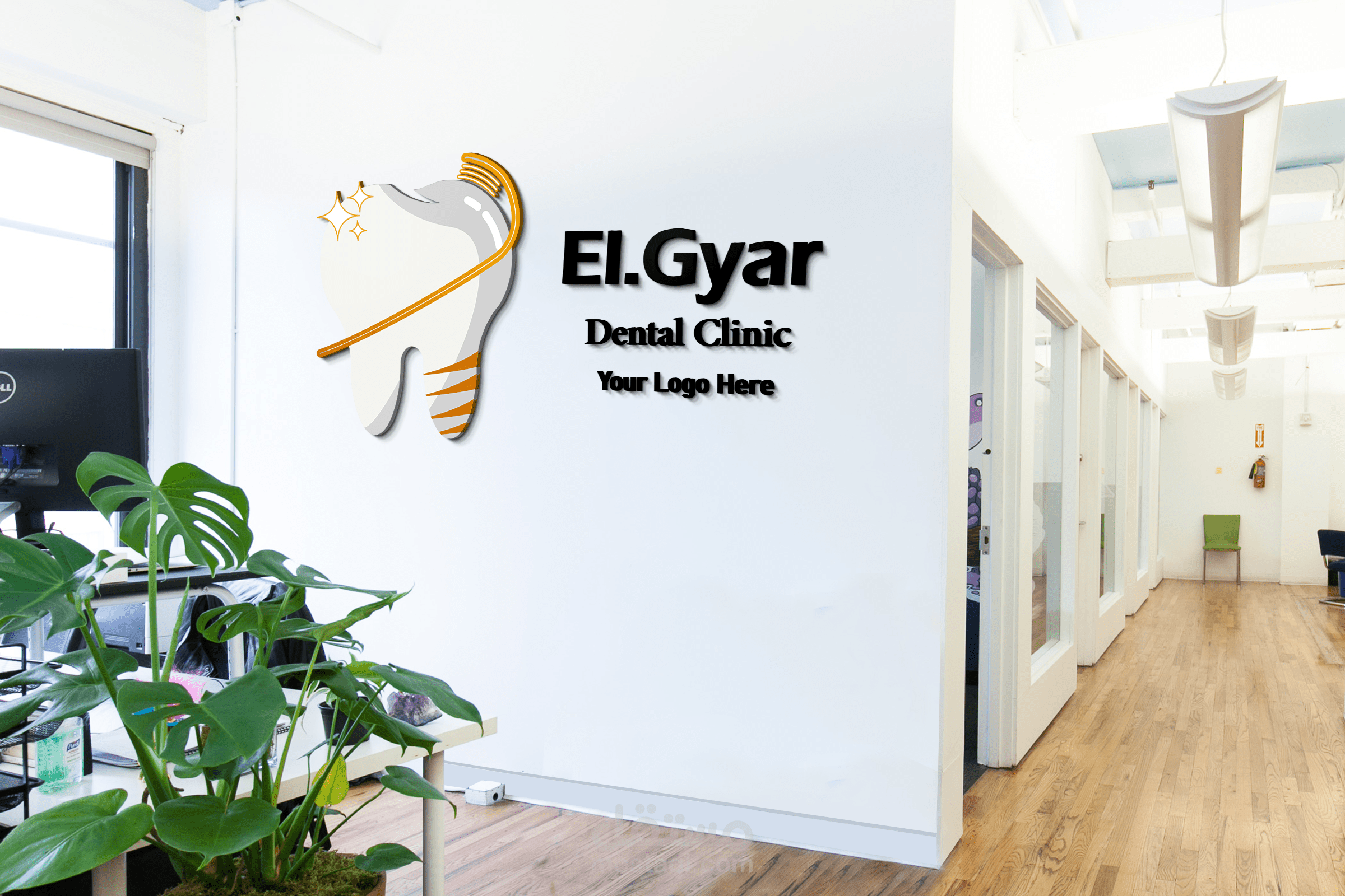 A design for a dental clinic in the name of El-Gyar that combines the shape of a molar with a toothbrush It is a visual .identity consisting of a logo, a business card, a bag, a cup and advertising flags