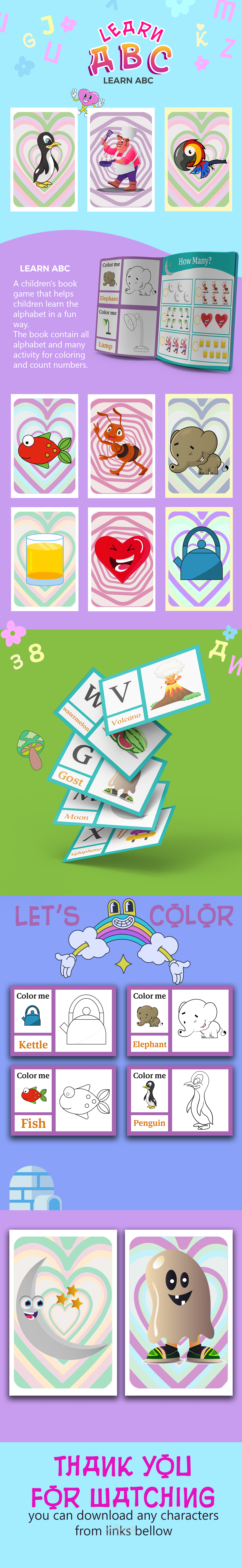 كتاب learn ABC للأطفال يساعد الأطفال على تعلم الحروف الأبجدية بطريقة ممتعة ، يحتوي الكتاب على كل الحروف الأبجدية والعديد من الأنشطة للتلوين وعد الأرقام والجمع والطرح .