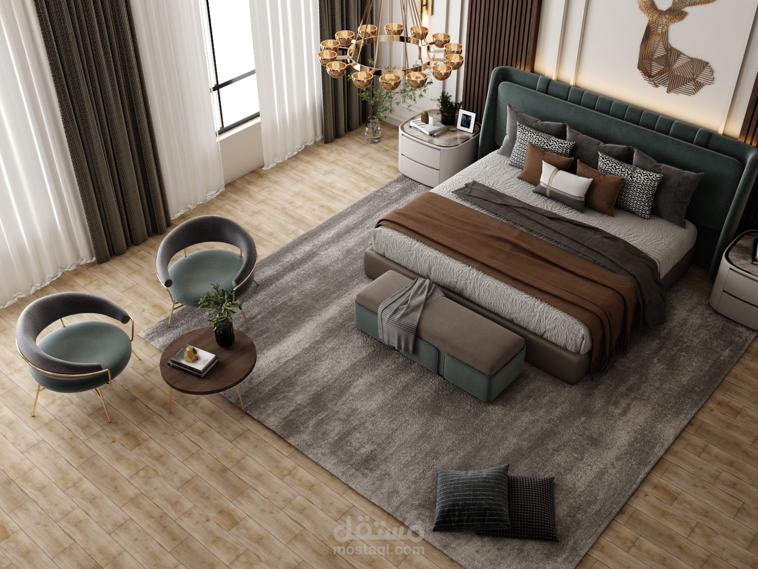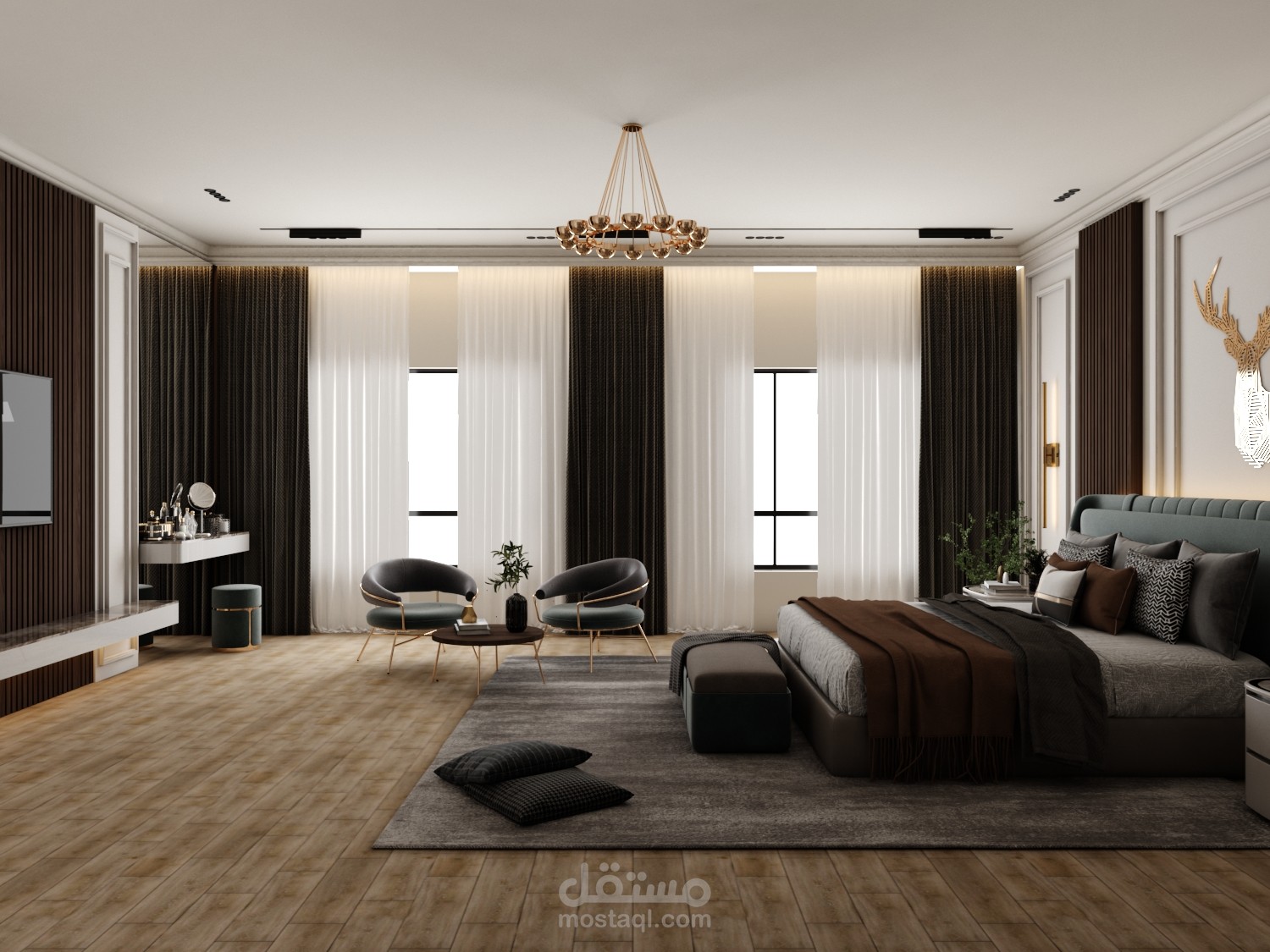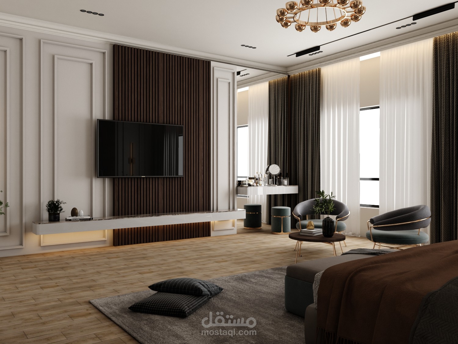 تصميم داخلي لغرفة نوم ماستر حديثة بأستخدام خامات الخشب