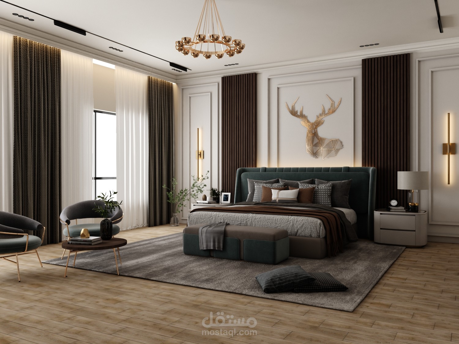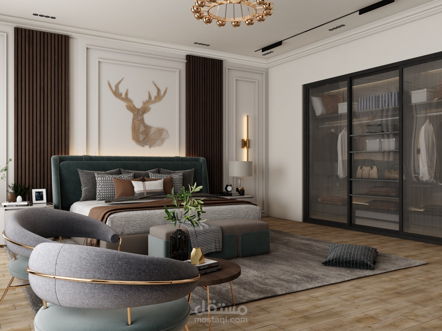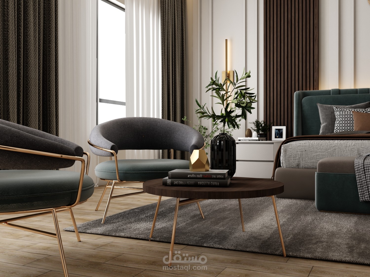 تصميم داخلي لغرفة نوم ماستر حديثة بأستخدام خامات الخشب