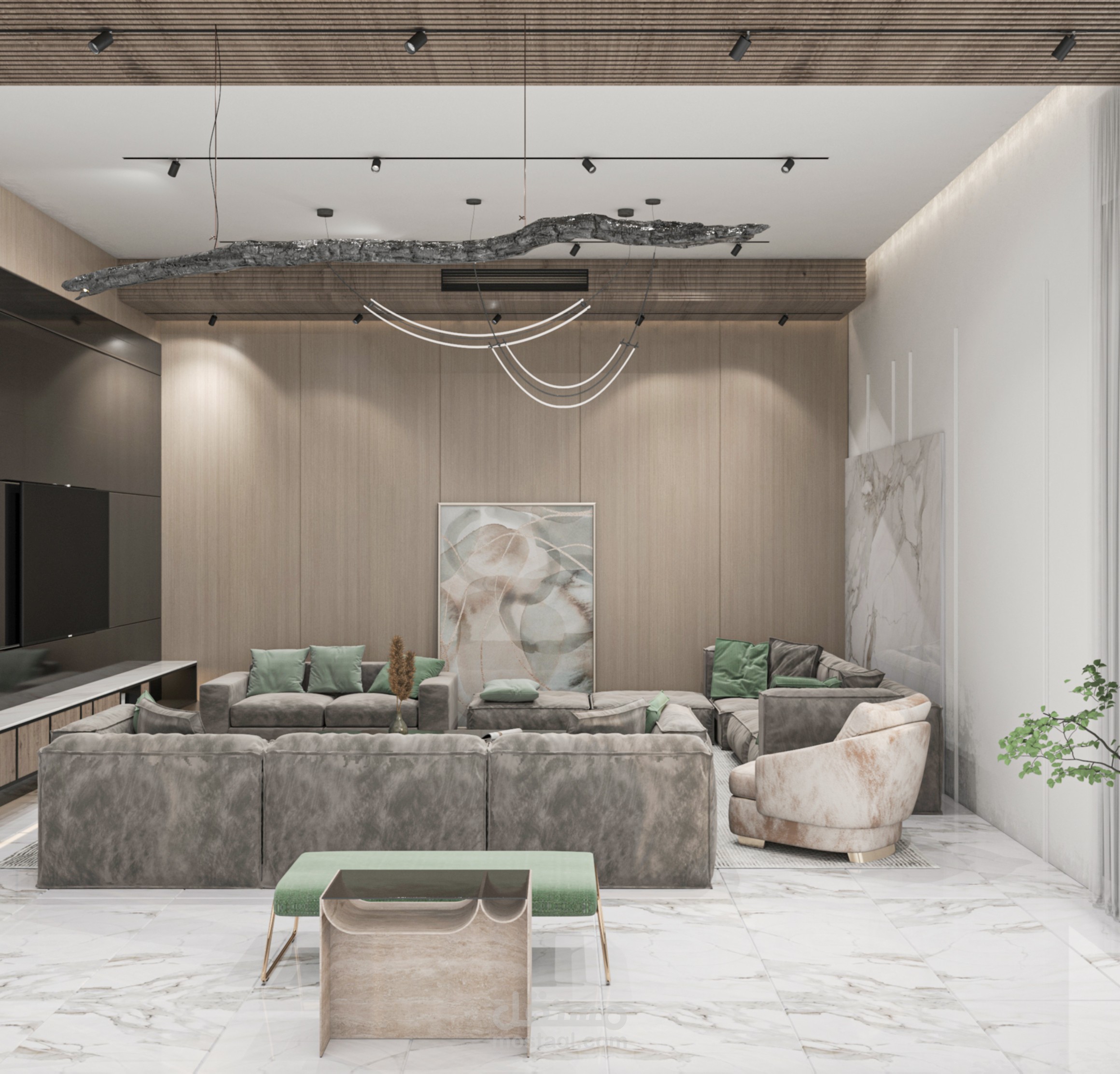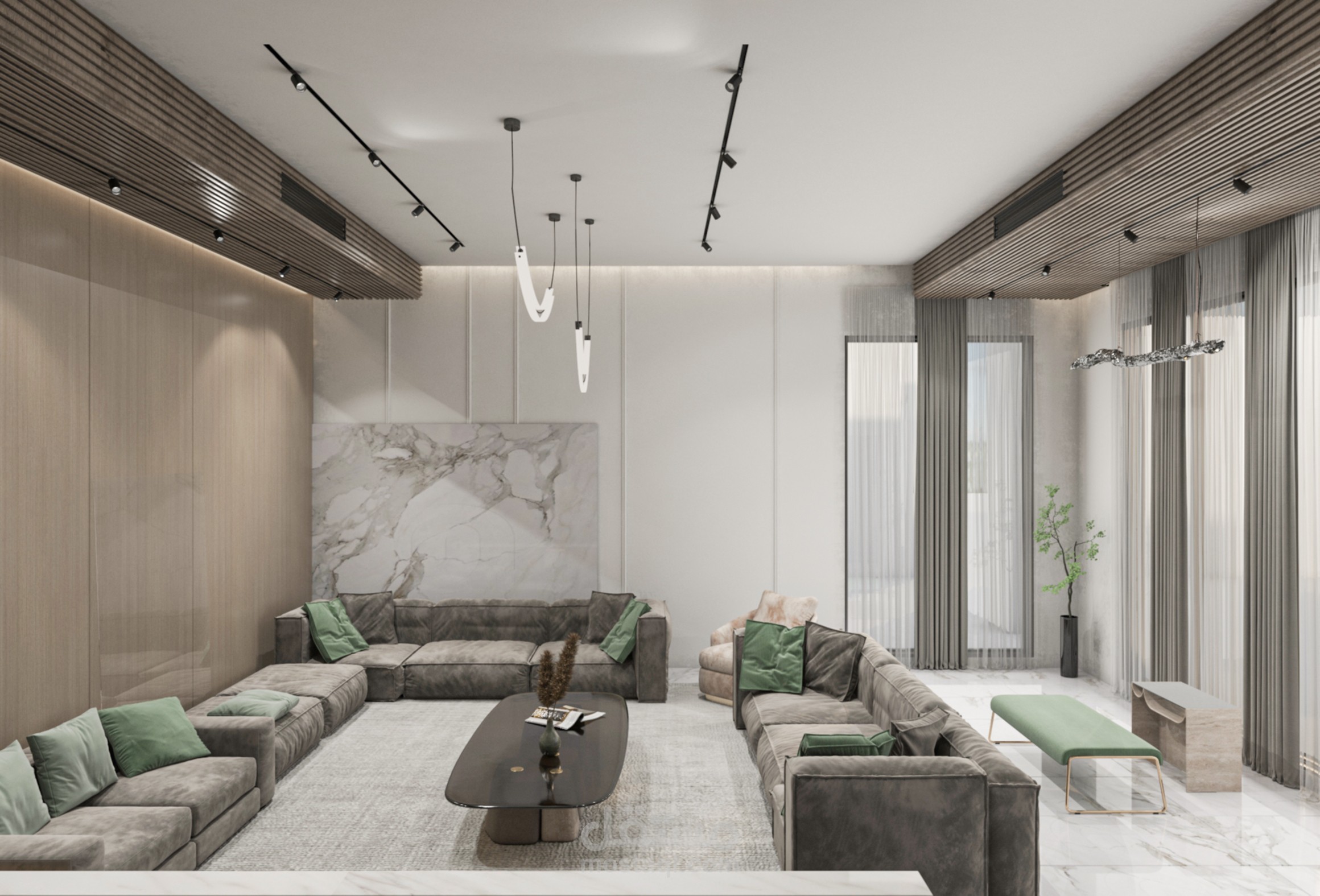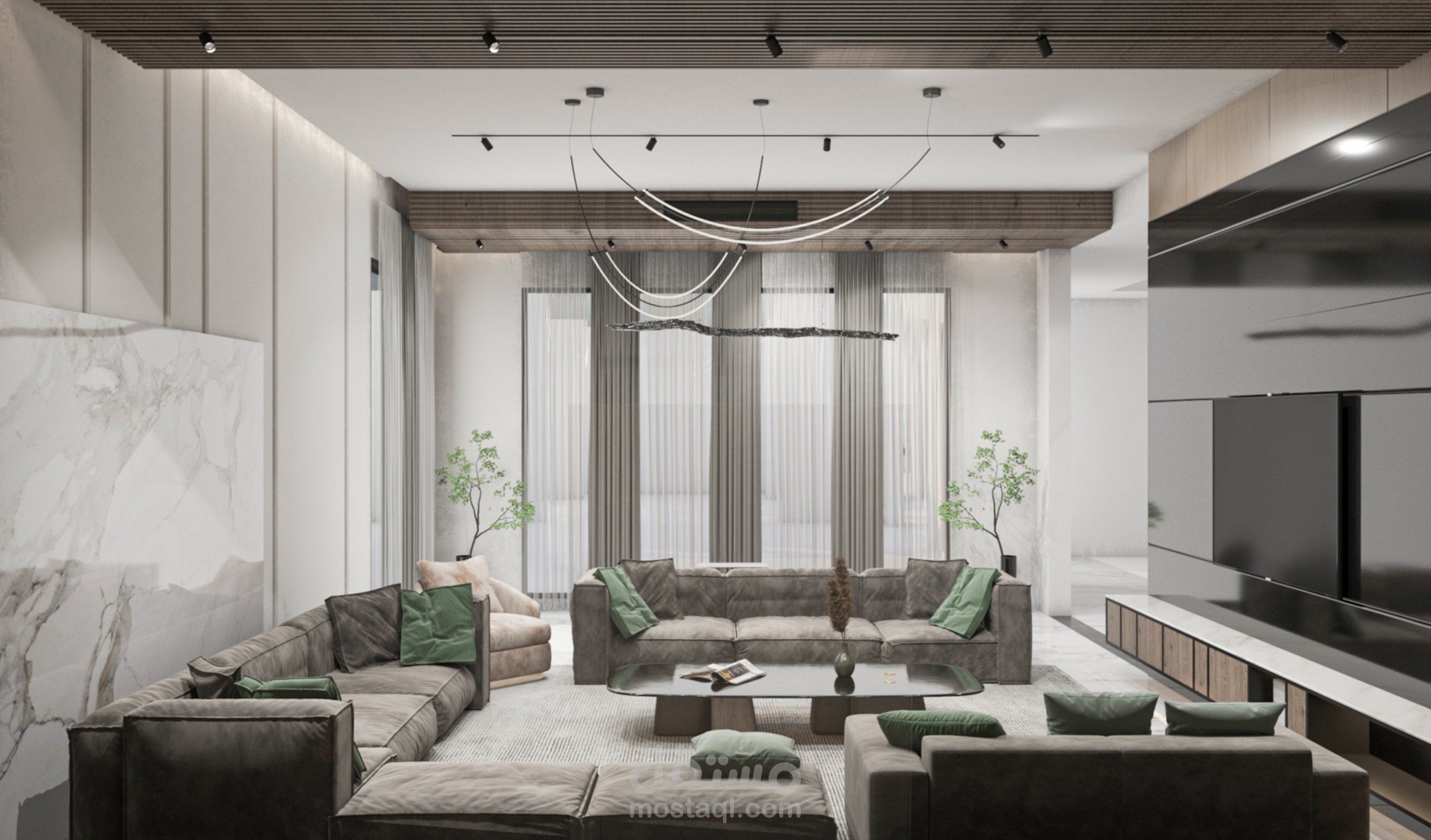 حيث تم عمل تصميم فريد من حيث الديكور و الاضاءات التي تتناسق مع مكان الجلسات و ديكور حائط التلفاز بالواح الزجاج الاسود ليتناسق مع التلفاز كعرض للوح و التلفاز و كلون