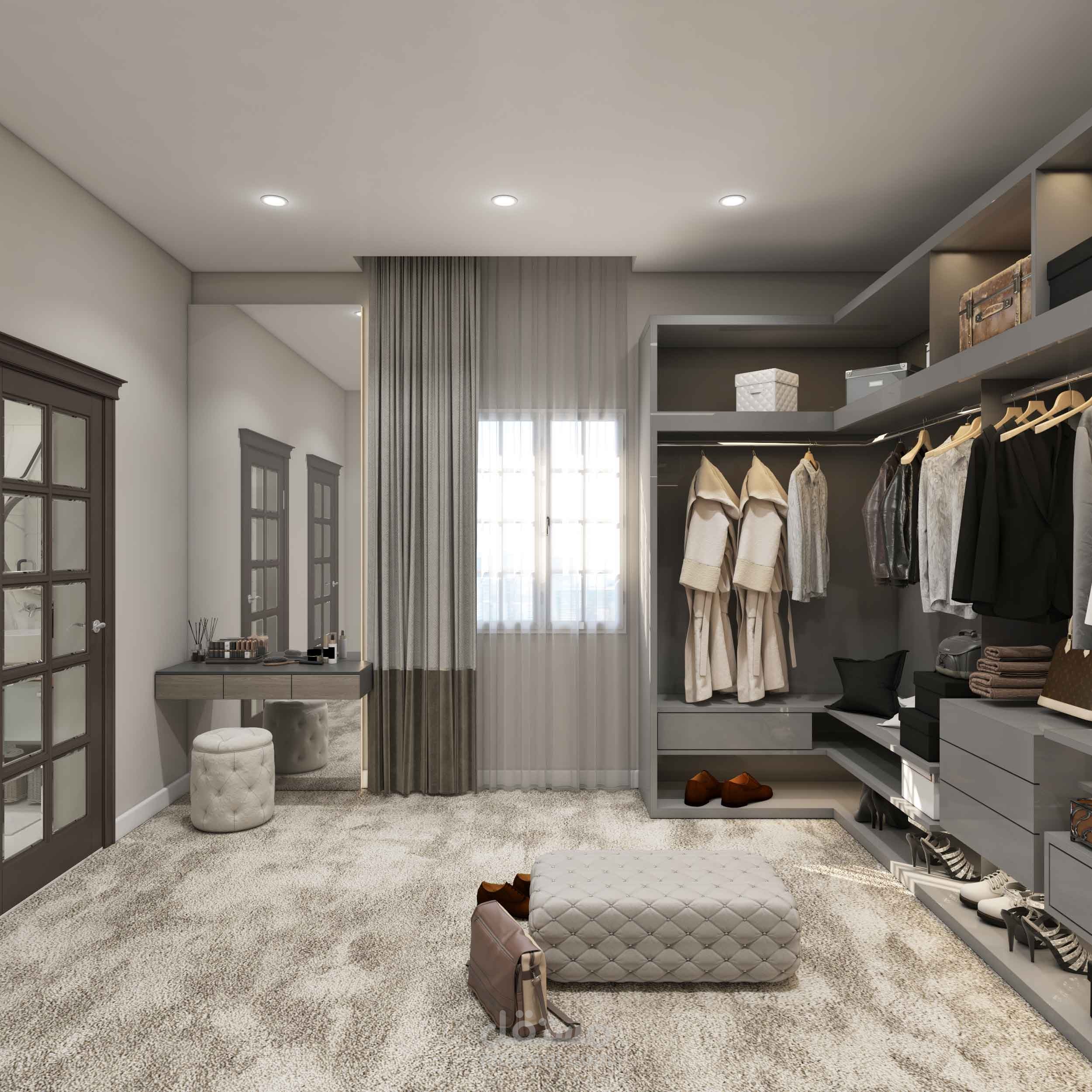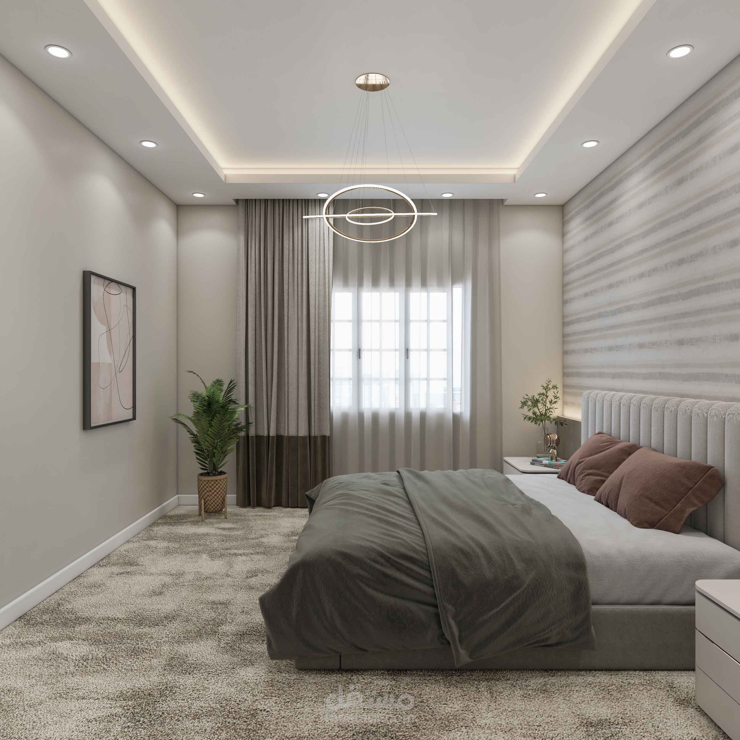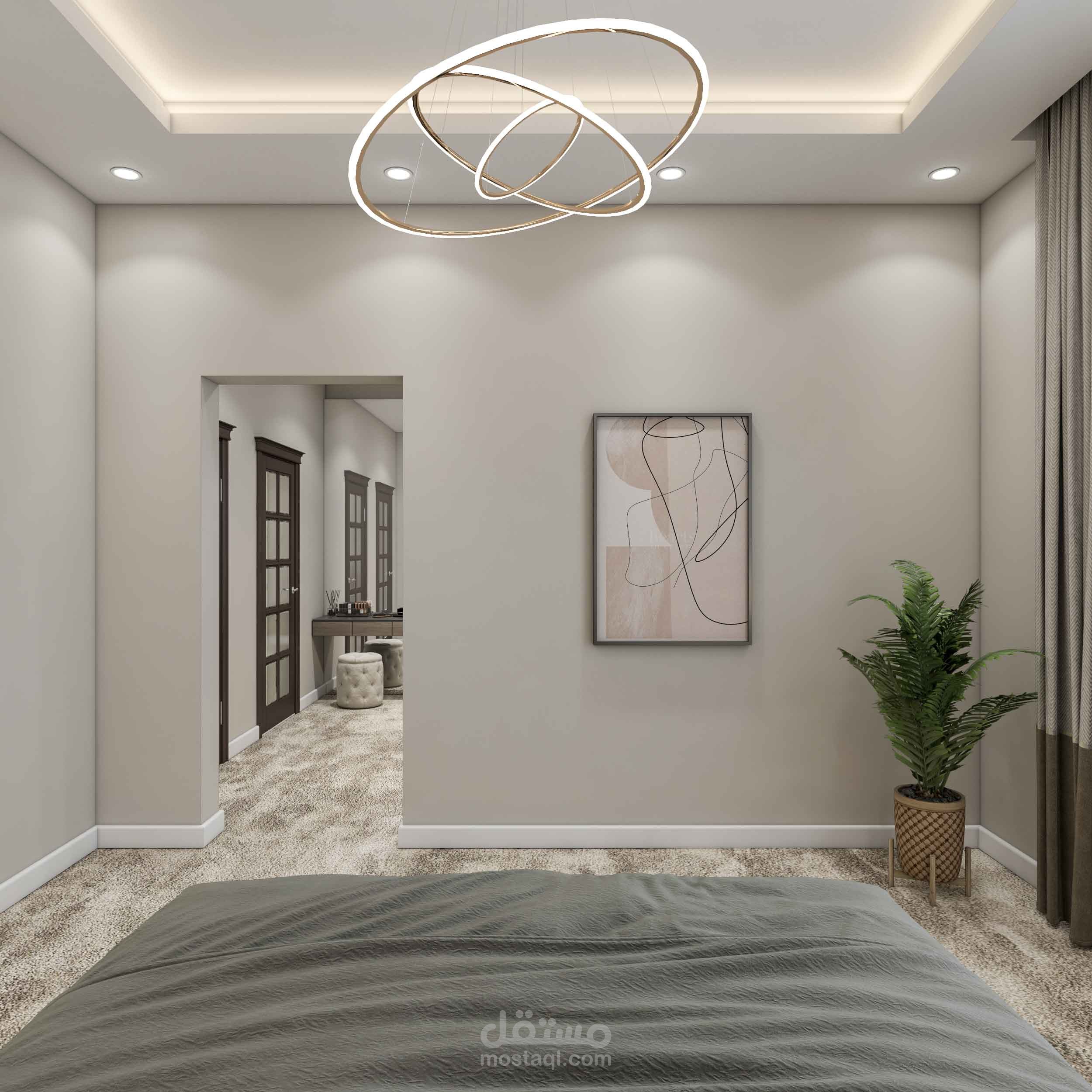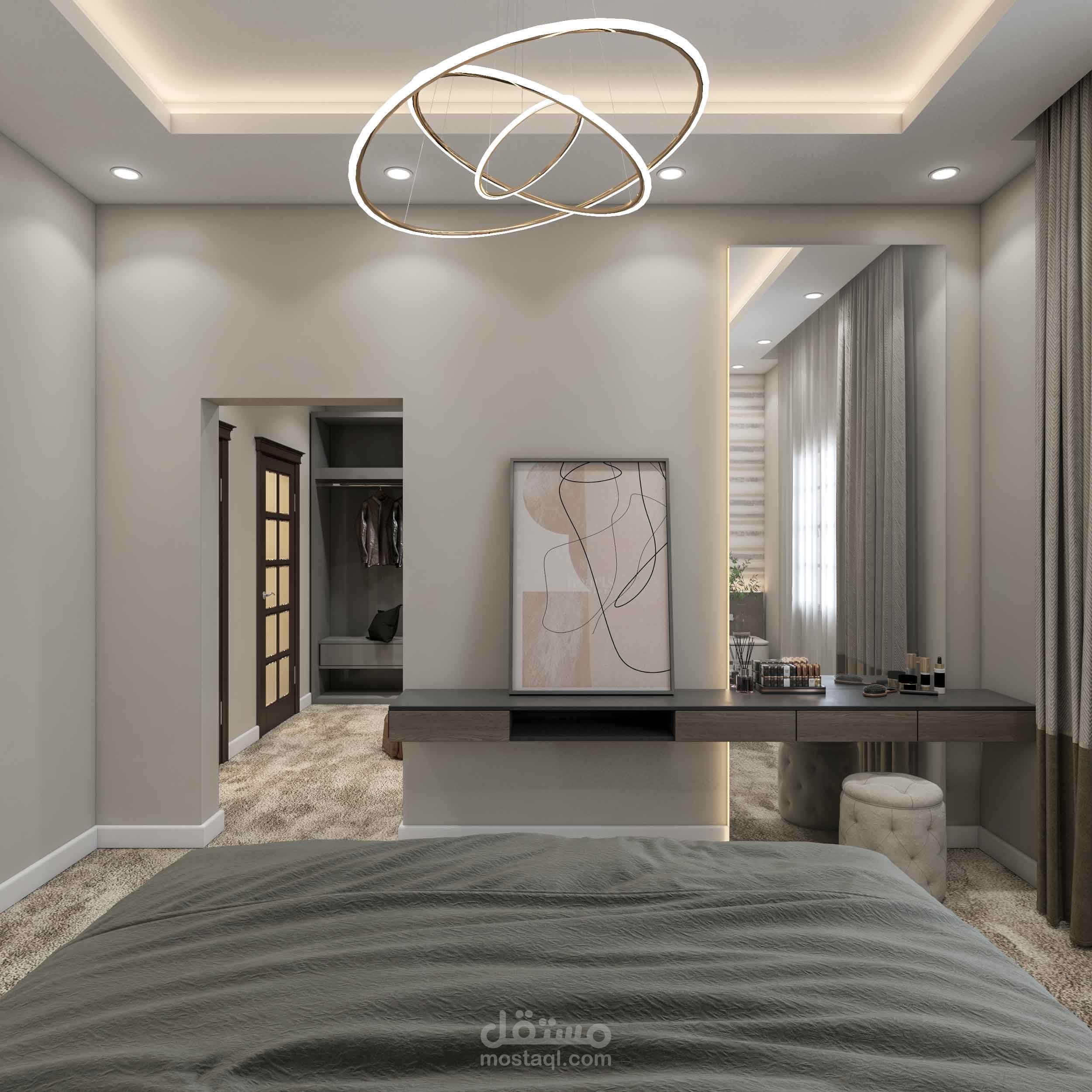 تصميم داخلى لغرفة نوم ماستر تحتوى على غرفة للملابس وحمام باجمالى مساحة 36 م2 .