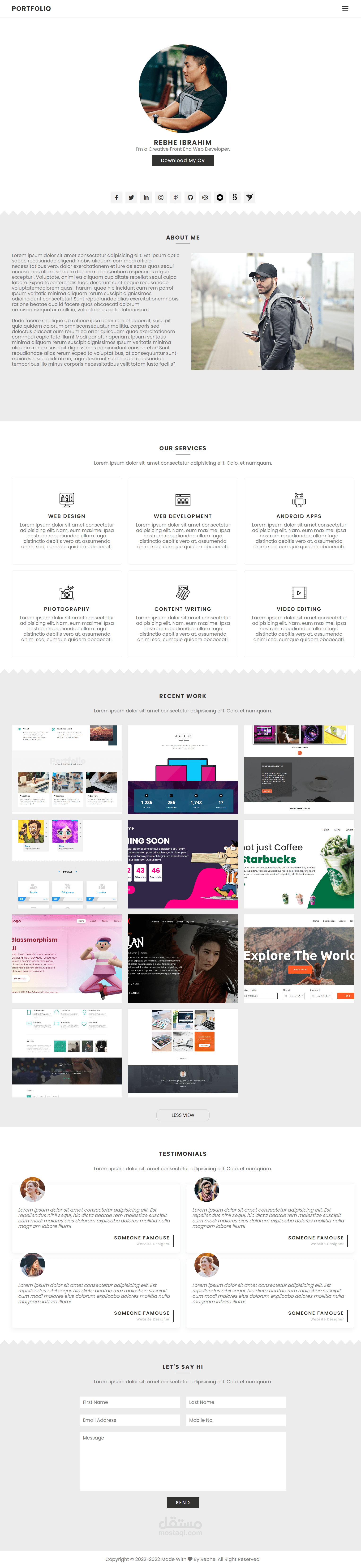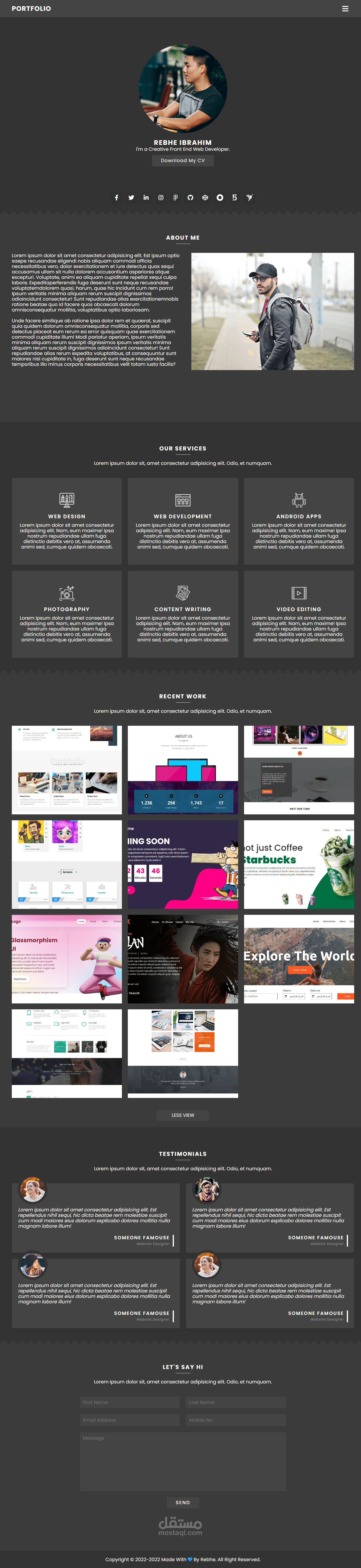 موقع شخصي, تم إنشاؤه باستخدام التقنيات الحديثة مثل HTML5 و CSS3. ستتمكن من عرض المحتوى الخاص بك على الأجهزة المحمولة مثل الهواتف الذكية والأجهزة اللوحية وجميع أنواع الأجهزة. مع هذا التصميم المثالي للبكسل والتقسيم الأنيق ، سيساعدك ذلك على إنشاء موقع ويب ذو مظهر احترافي لعملك في أي وقت من الأوقات و جذب زوار موقعك على الويب والحفاظ على تفاعلهم. أيضا سيسمح لك بعرض أعمالك وخدماتك بطريقة رائعة. جميع عناصر هذا القالب مستجيبة تماما وتعمل بسلاسة على جميع الأجهزة وأحجام الشاشات.