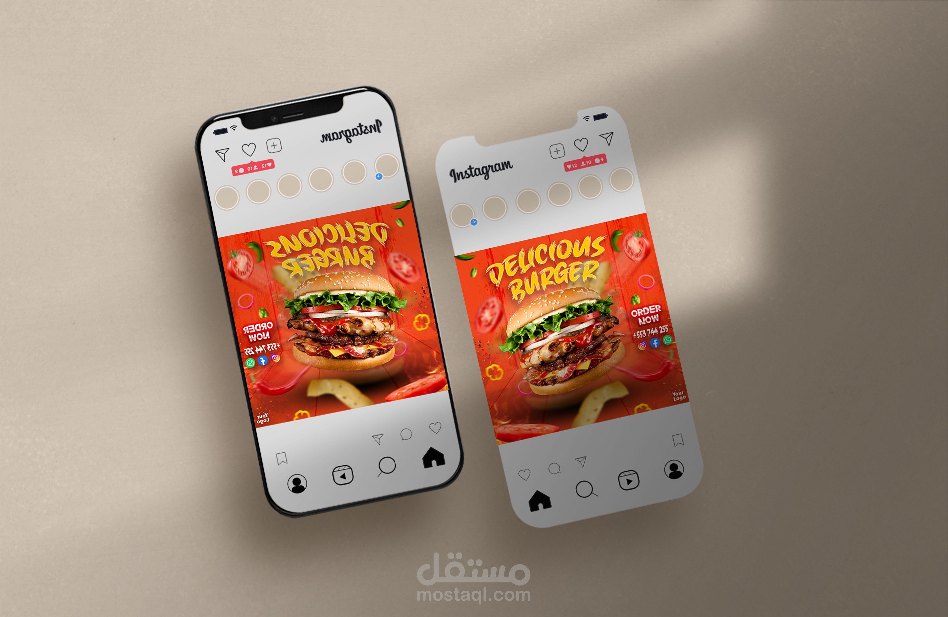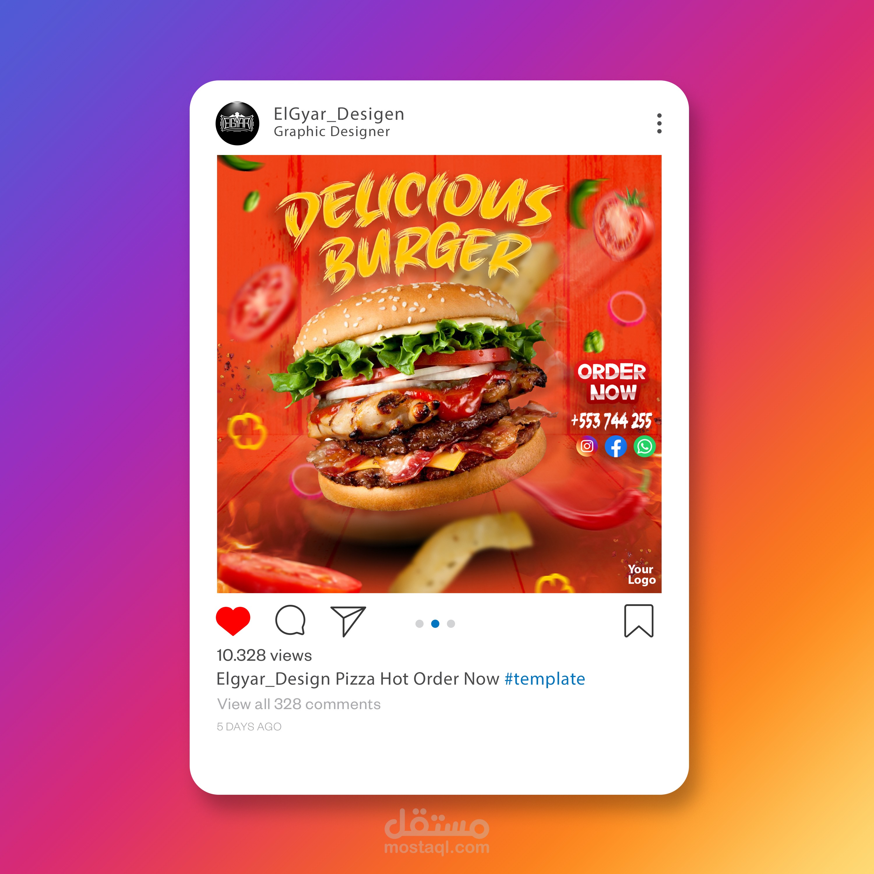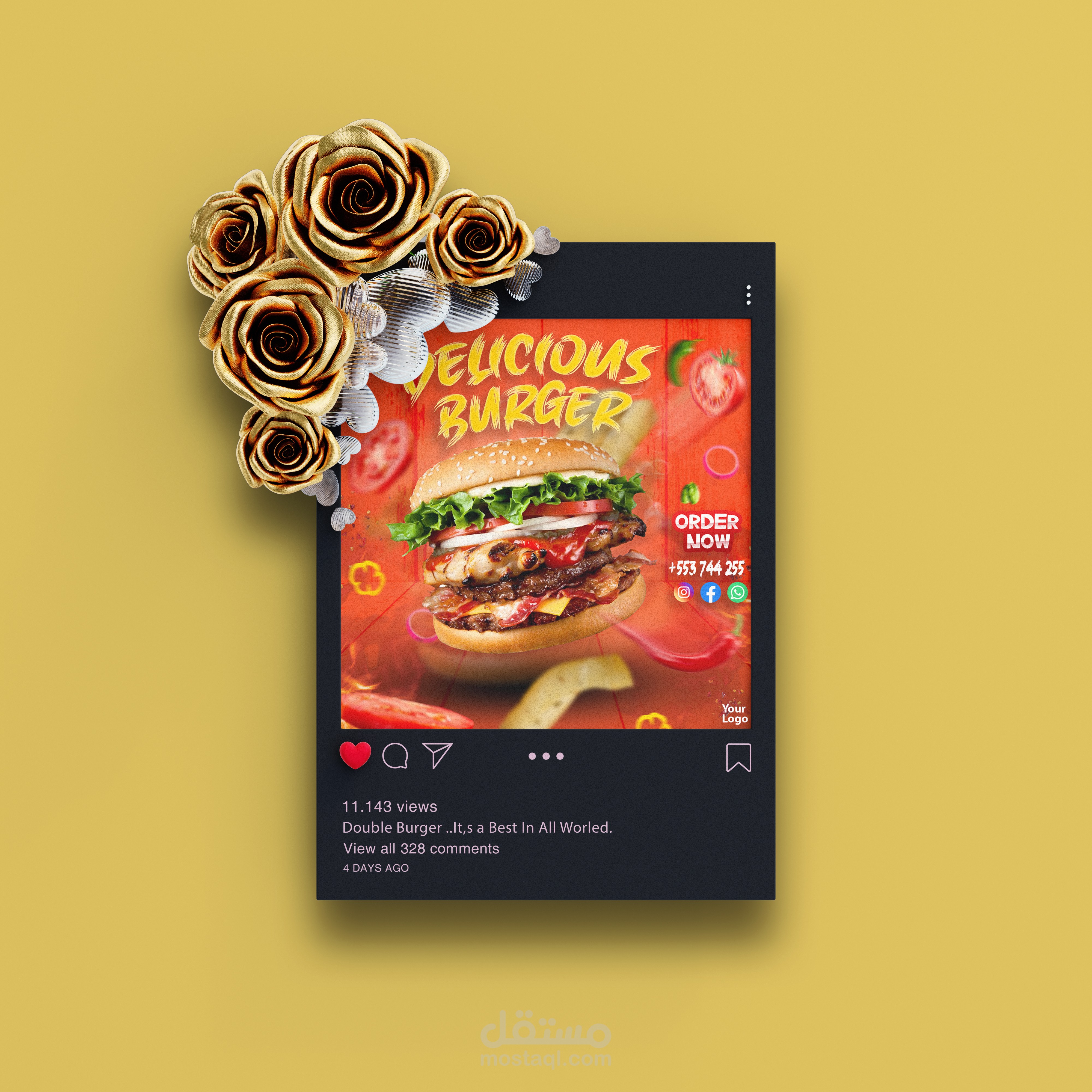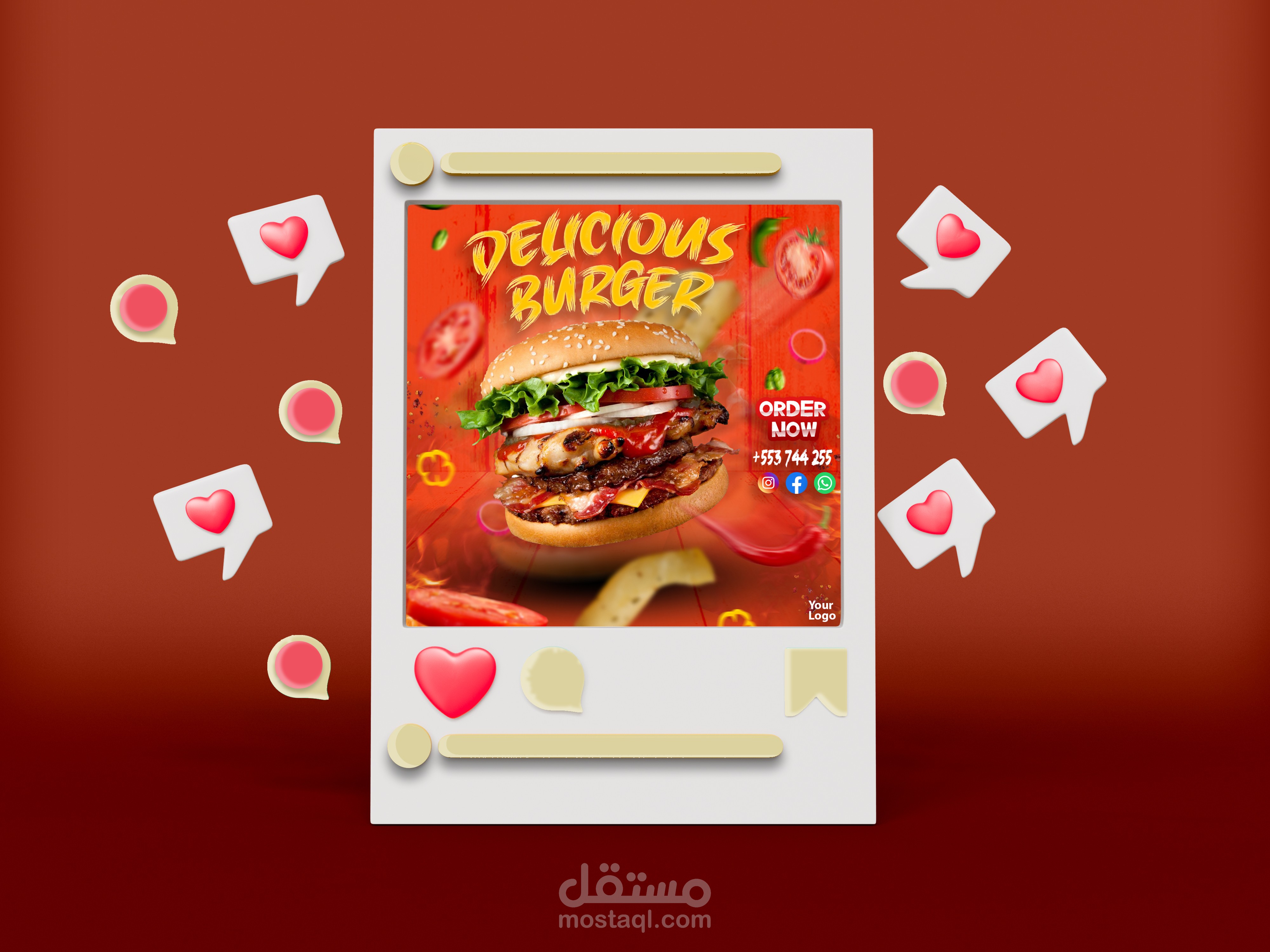 تصميم بوستر دعاية البرجر اللذيذ ذو الطعم الرائع و الجديد أطلبة الأن.