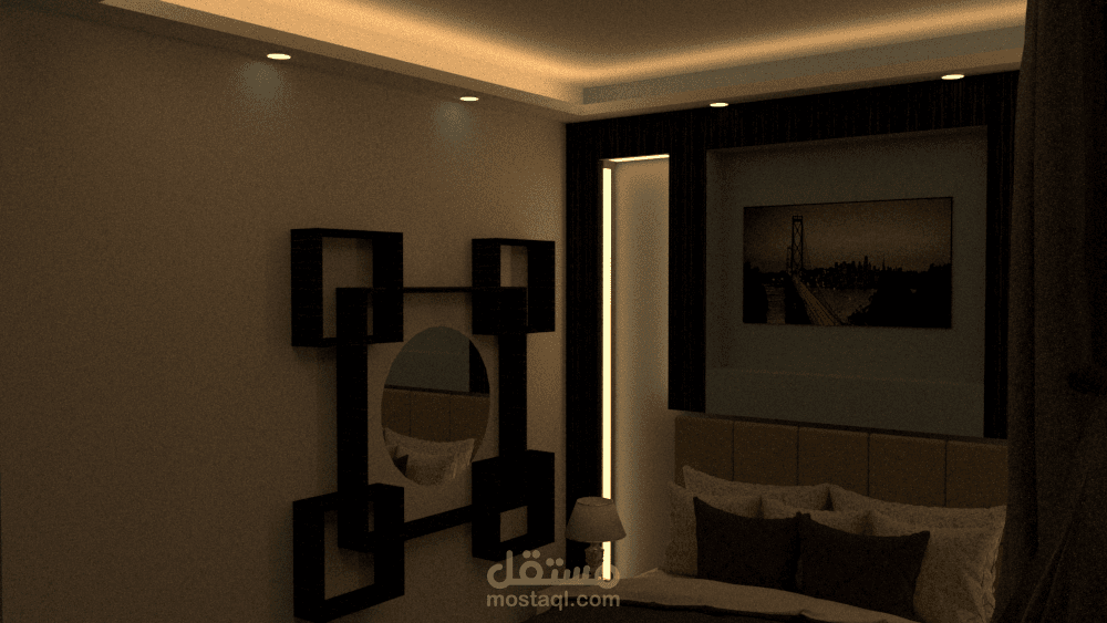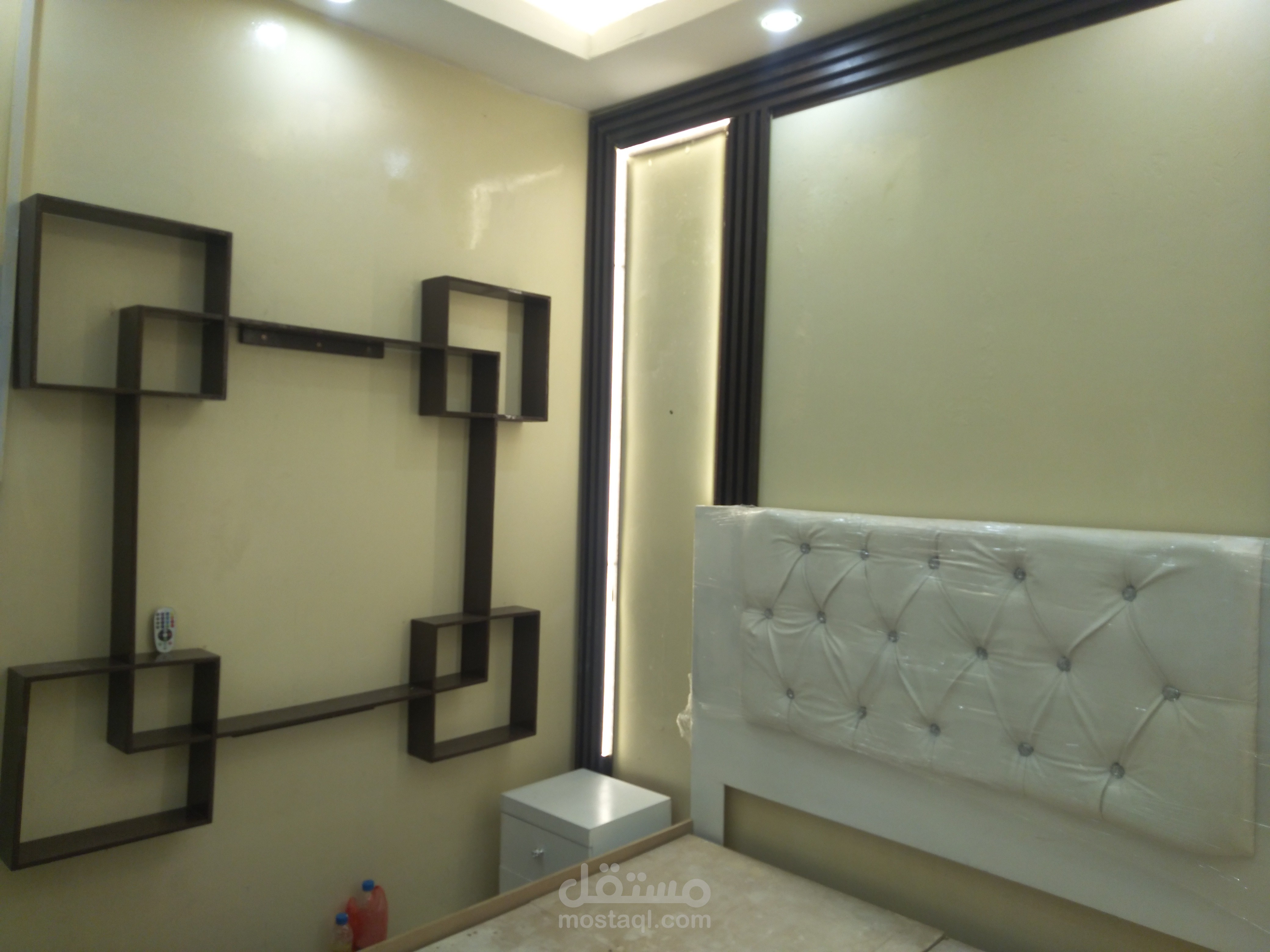 تصميم وتنفيذ غرفة نوم باستخدام الجبس والخشب وبديل الخشب واسبت لايت واضاءة مخفيه وتسريحه معلقه مراعتاً لصغر الغرفة