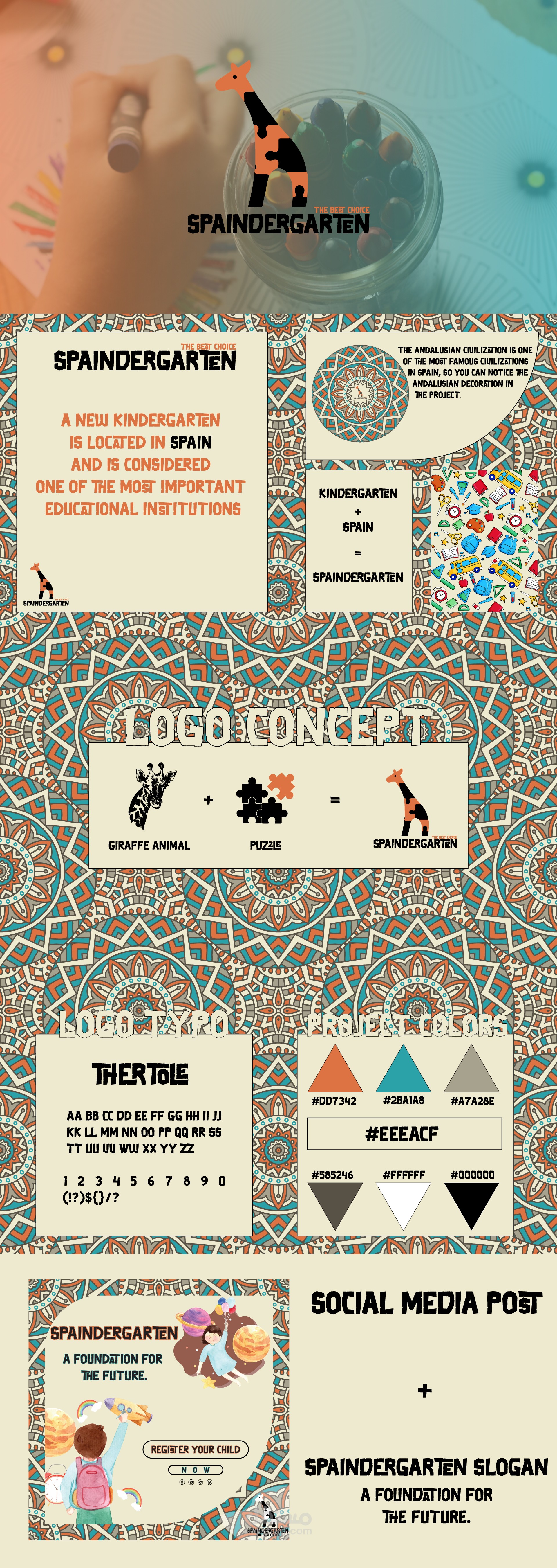 تم تكليفي بتصميم لوغو يتناسب مع طلب العميل وفكرته، وتم تحديد فكرة العمل كرياض أطفال تقع في إسبانيا. لتحقيق ذلك، قمت بإجراء مقابلة مع العميل لفهم متطلباته ورؤيته للمشروع. بعد ذلك، قمت بإعداد عدة مفاهيم للوغو وتم تقديمها للعميل للاختيار من بينها. وبناءً على اختيار العميل، تم تحديد الألوان والشكل والخطوط اللازمة لتصميم اللوغو.