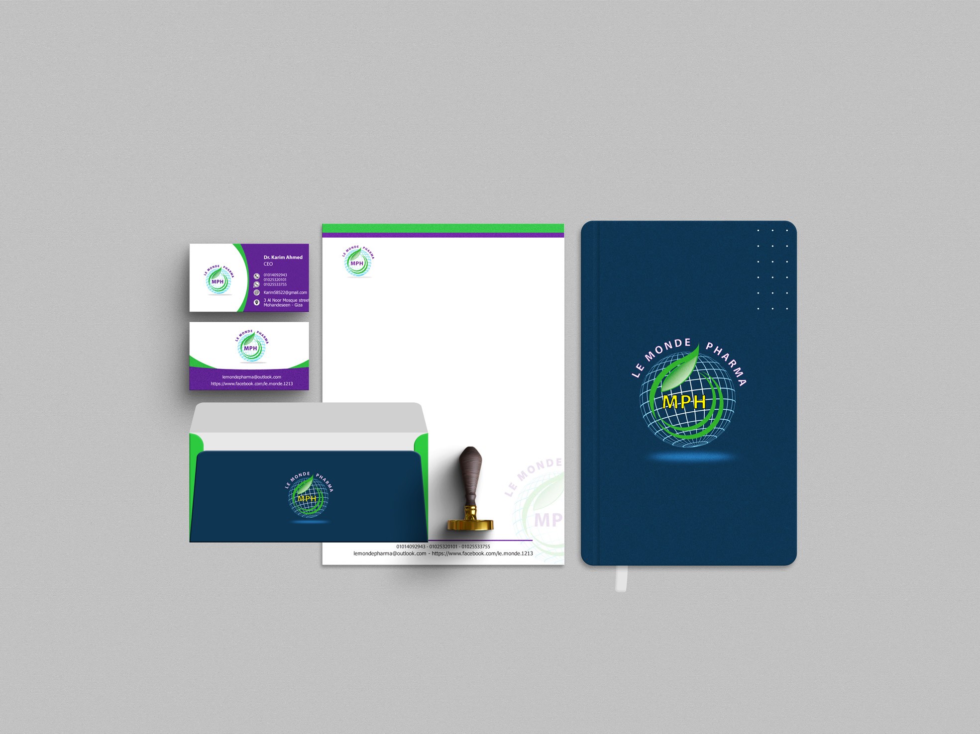 تصميم شعار شركة أدوية ( le monde pharma ) ، الشركة تعتمد في منتجاتها على الأعشاب والنباتات الطبية الطبيعية ، لذلك إستخدمت نموذج لورقة نبات ، واللون الأخضر يرمز إلى الطبيعة بشكل عام وإن المواد المستخدمة طبيعية من البيئة ، ولأن الشركة توزع منتجاتها إلى عدة بلدان بجانب أنها محلية أستخدمت نموذج مفرغ للكرة الأرضية بلون المياه ( وجعلنا من الماء كل شئ حي ) ، وأيضل لتدل على النقاء والطبيعية