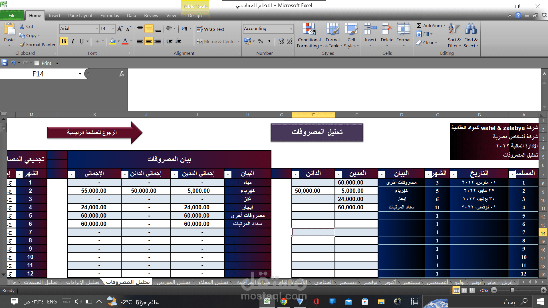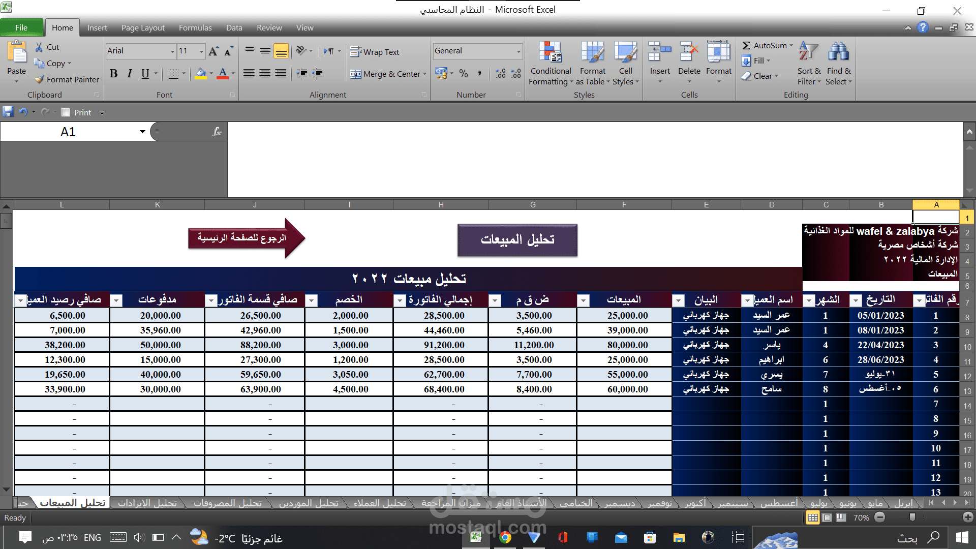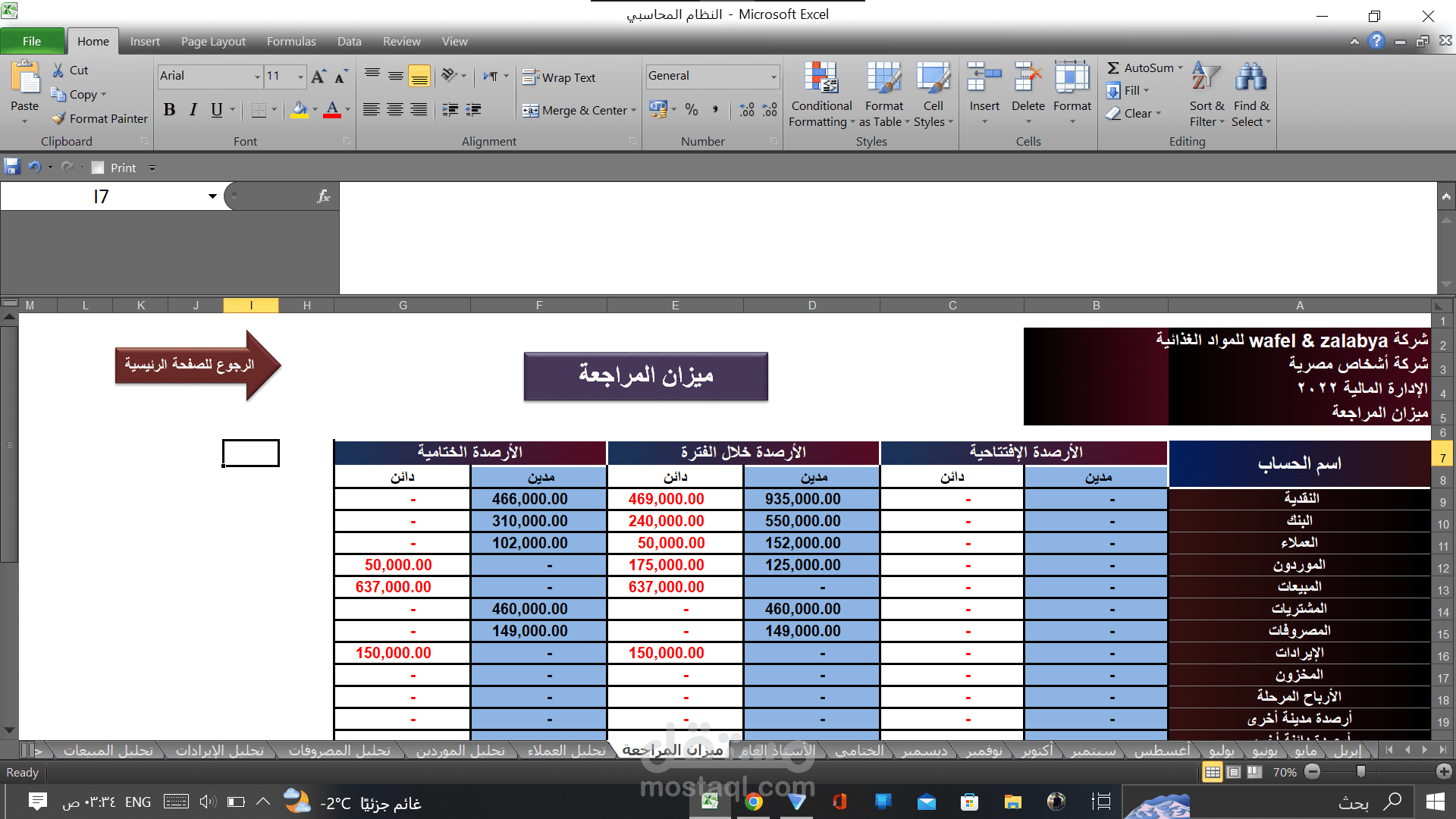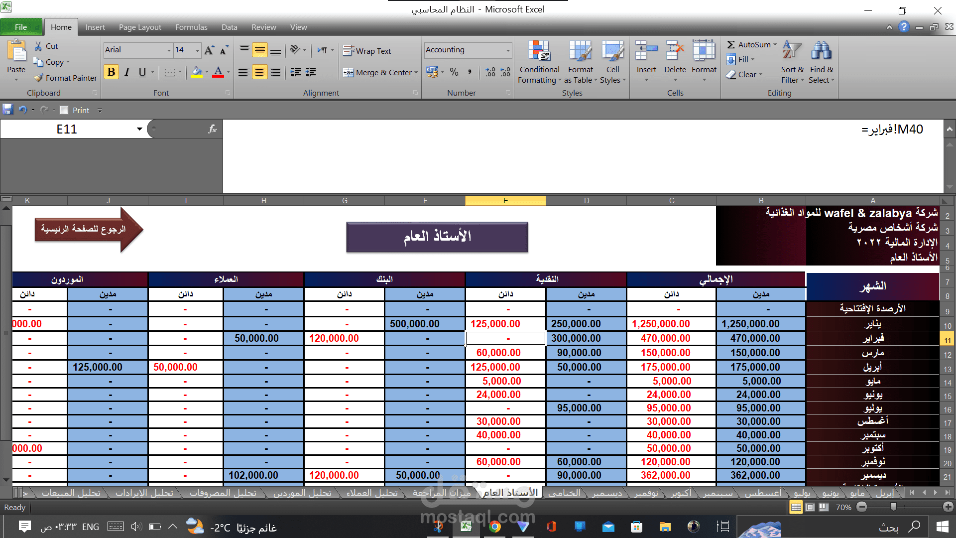 الحمد لله الذي وفقني لعمل نظام محاسبي قوي على برنامج الاكسيل, كما اني أدرجت فيه شيت لتحليل العملاء وأخر لتحليل الموردين وتحليل المصروفات والإهلاك وباقي حسابات الشركة