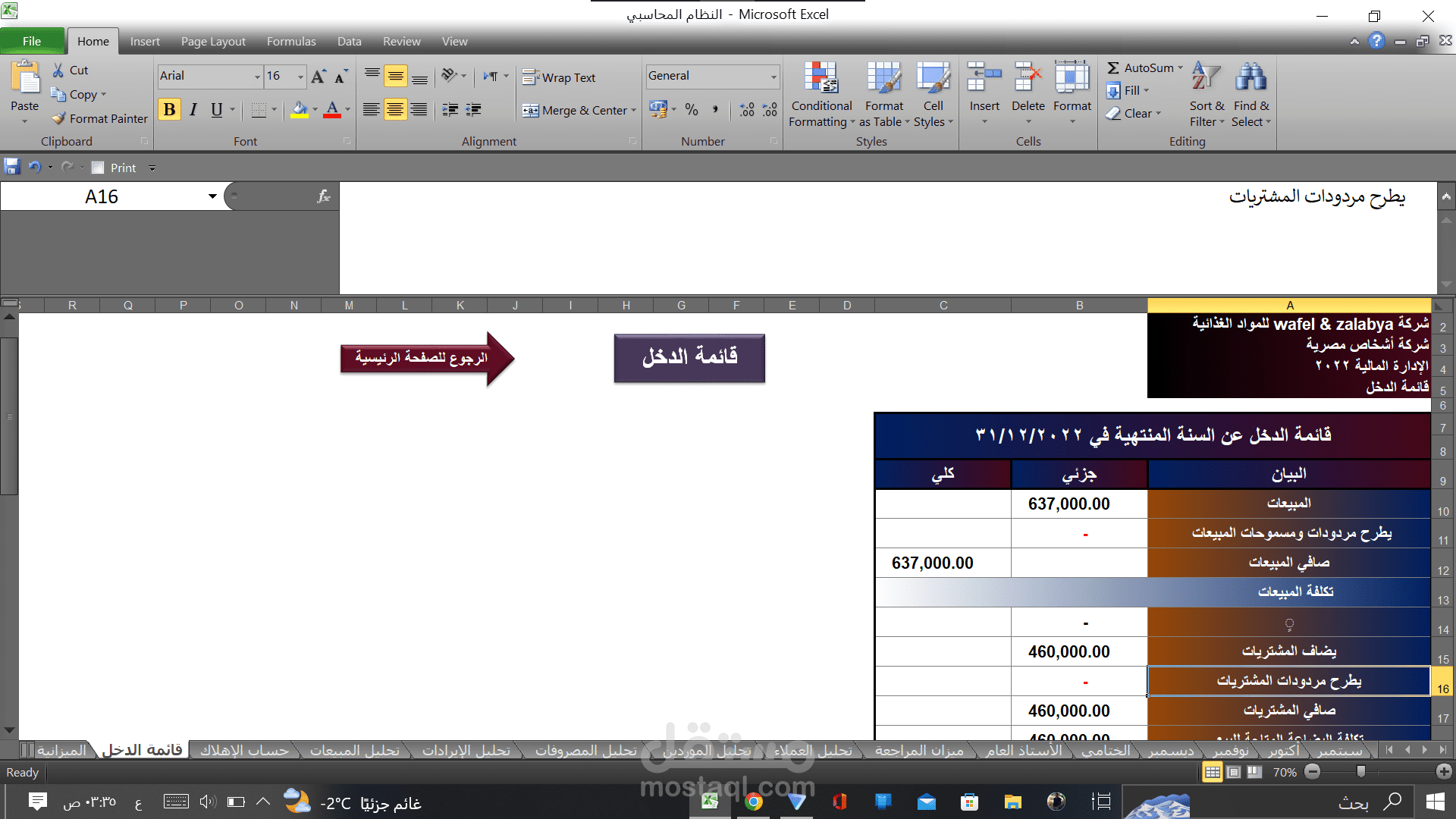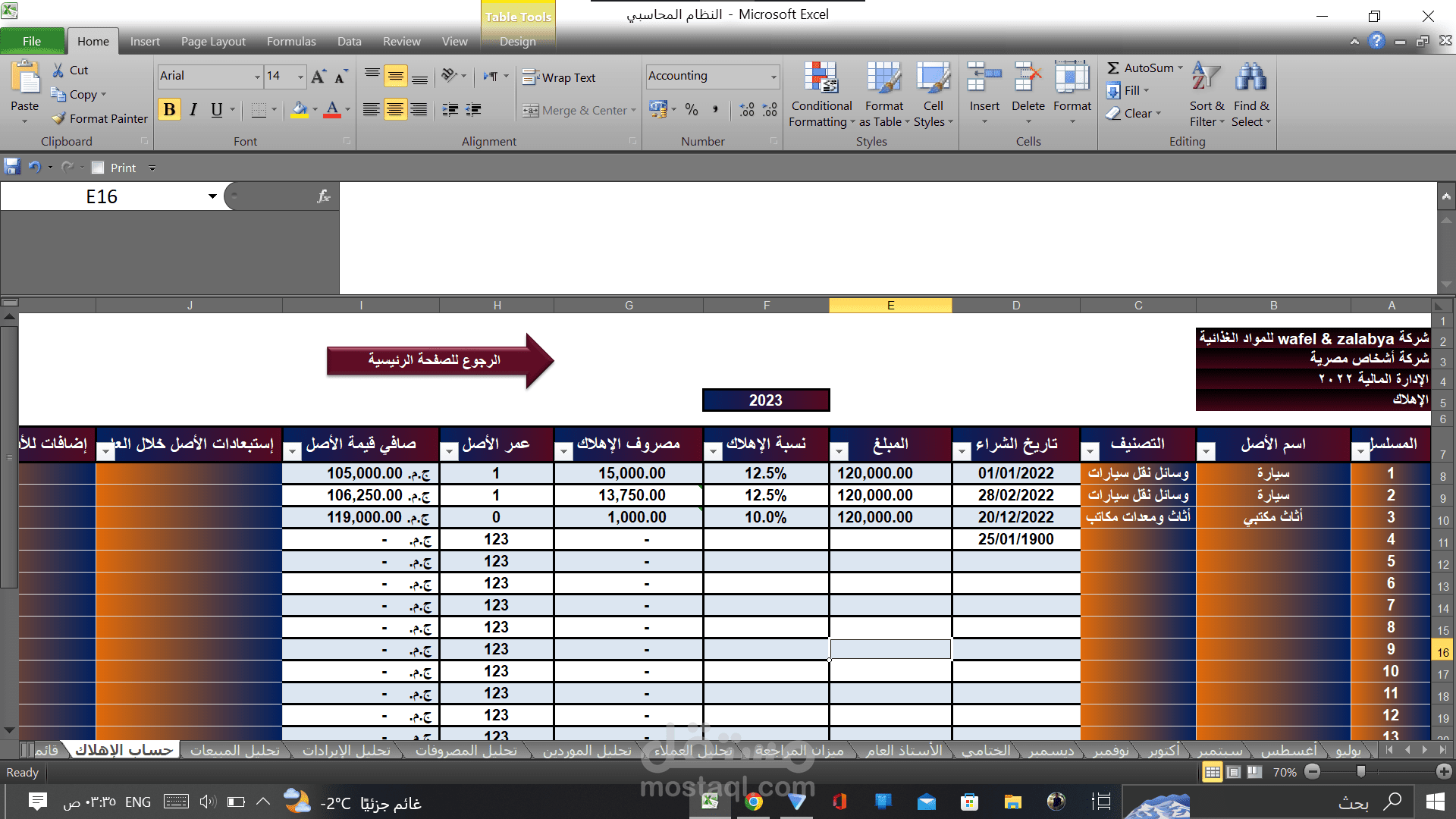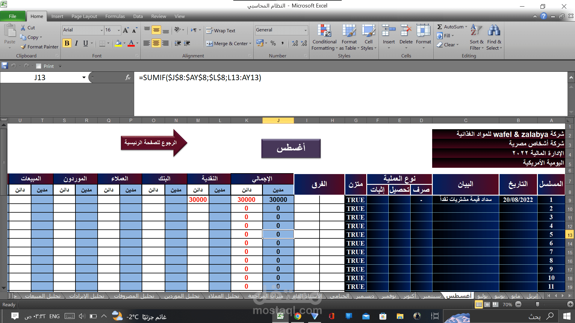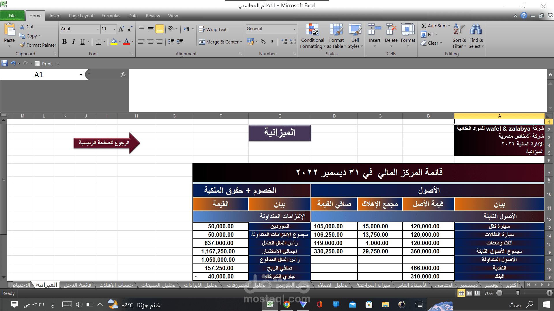 الحمد لله الذي وفقني لعمل نظام محاسبي قوي على برنامج الاكسيل, كما اني أدرجت فيه شيت لتحليل العملاء وأخر لتحليل الموردين وتحليل المصروفات والإهلاك وباقي حسابات الشركة