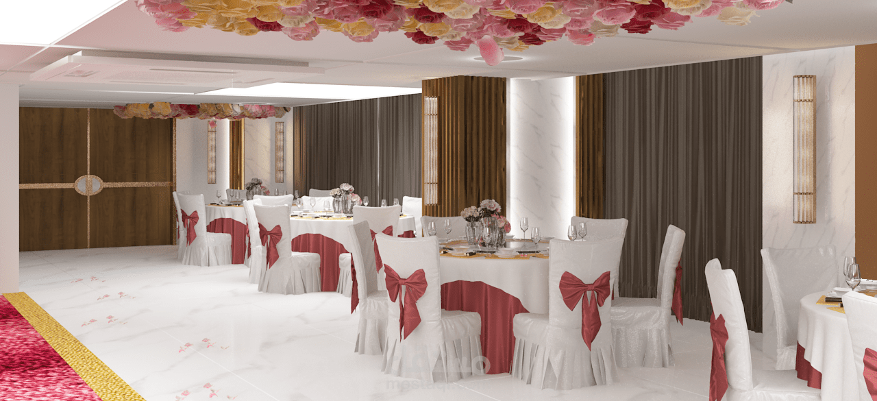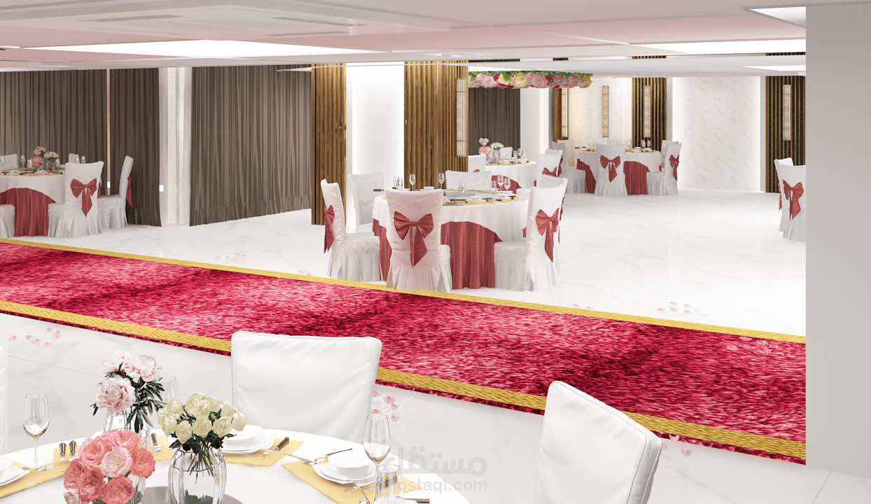 تم عمل تصميم ديكوري 3d يوضح جميع تفاصيل لقاعة أفراح خاصة بالنساء