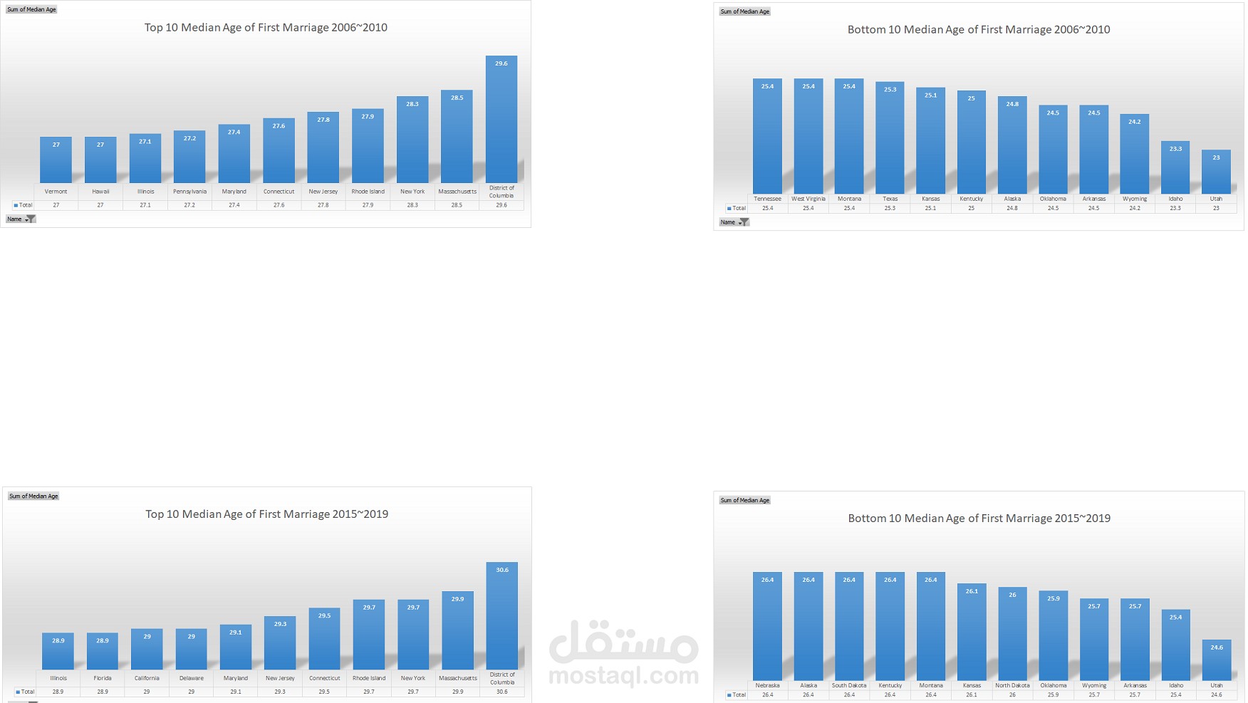 صورة مبسطة عن مقارنة اصغر 10 ولايات و اكبر 10 ولايات من حيث متوسط سن الزواج الأول للشباب في الولايات المتحدة الامريكية.