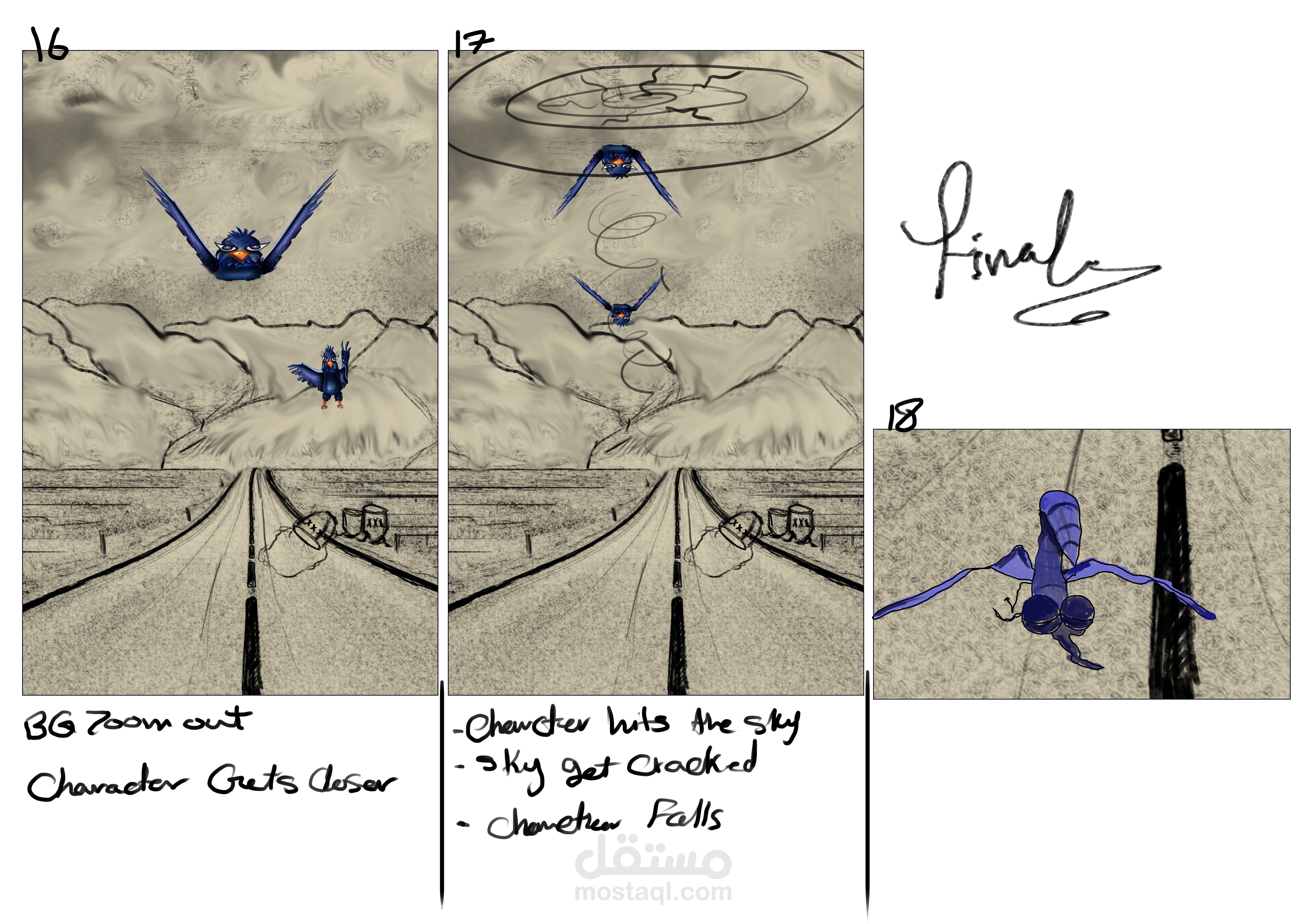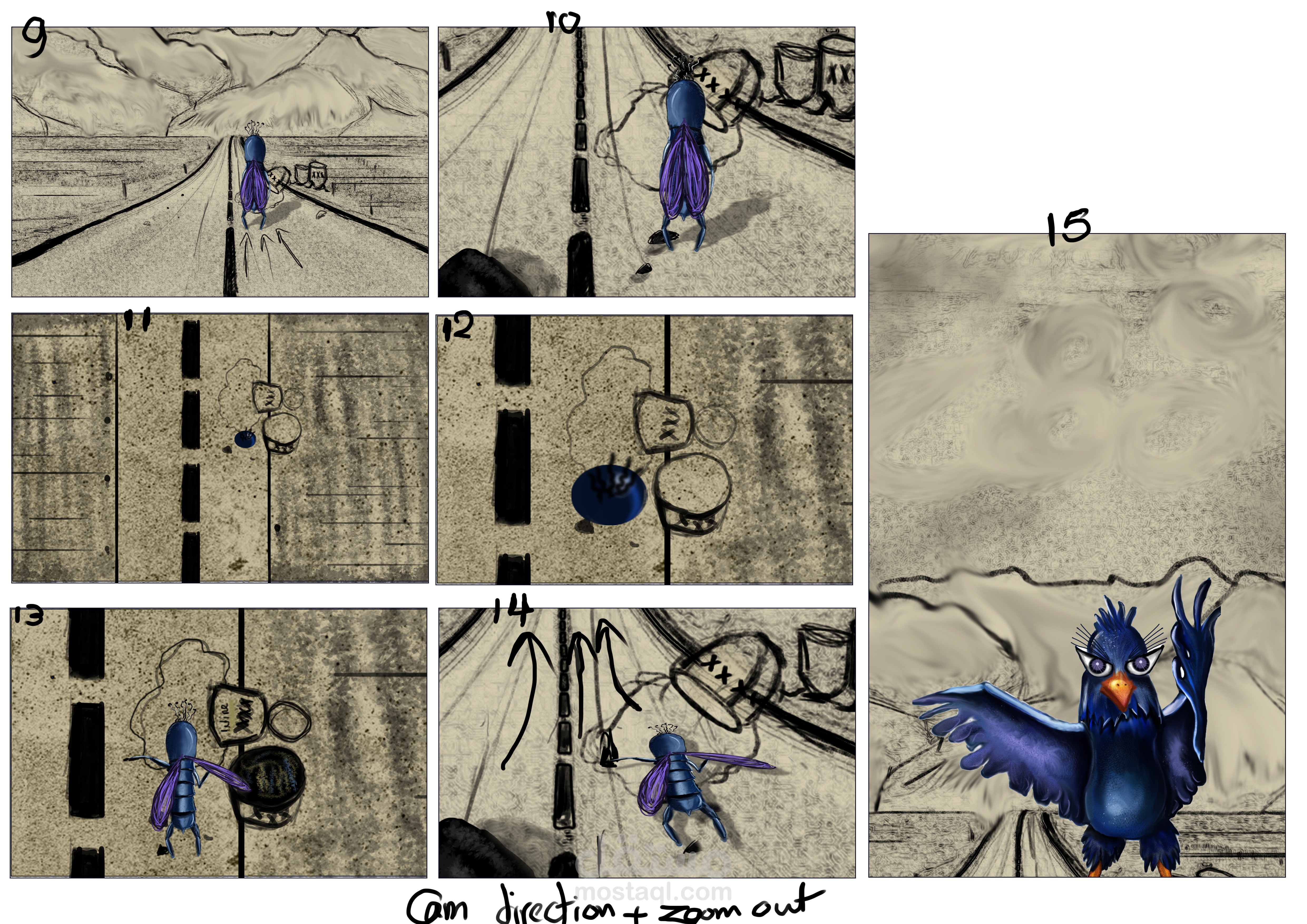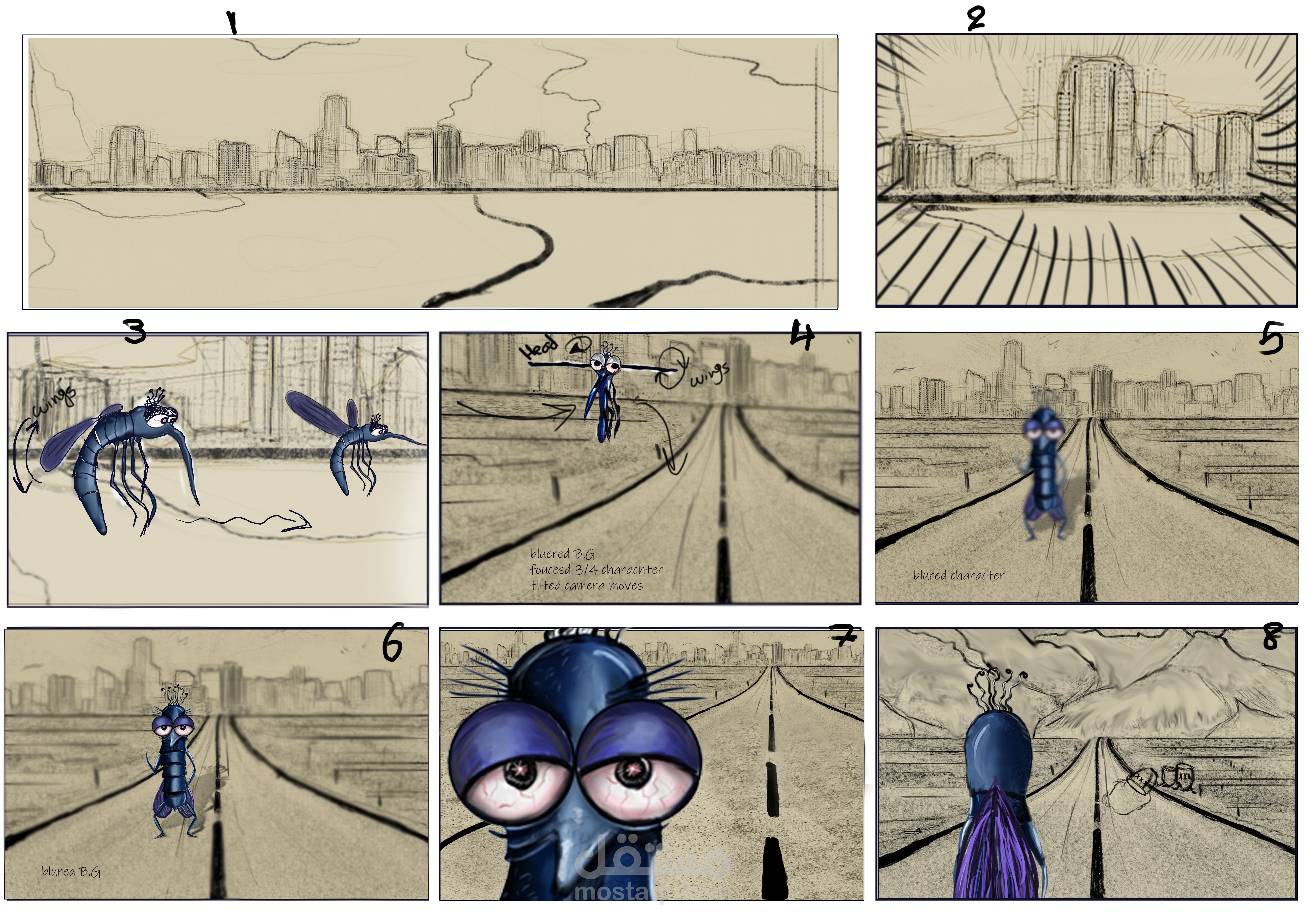 تصميم الشخصيات من مرحله الاسكتش حتي ال digital painting و عمل story boarding للقصه و الدمج في الاسلوب بين ال monochromatic و ال