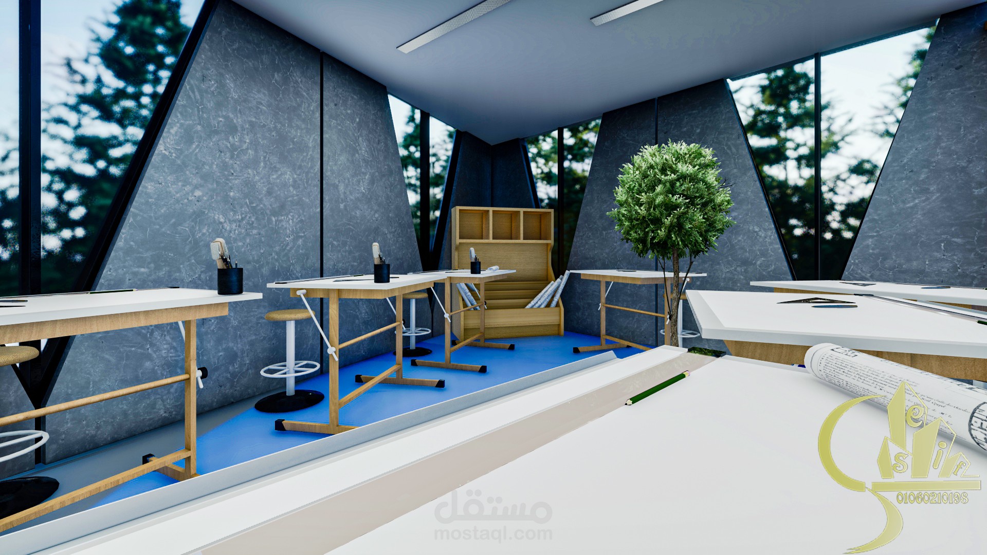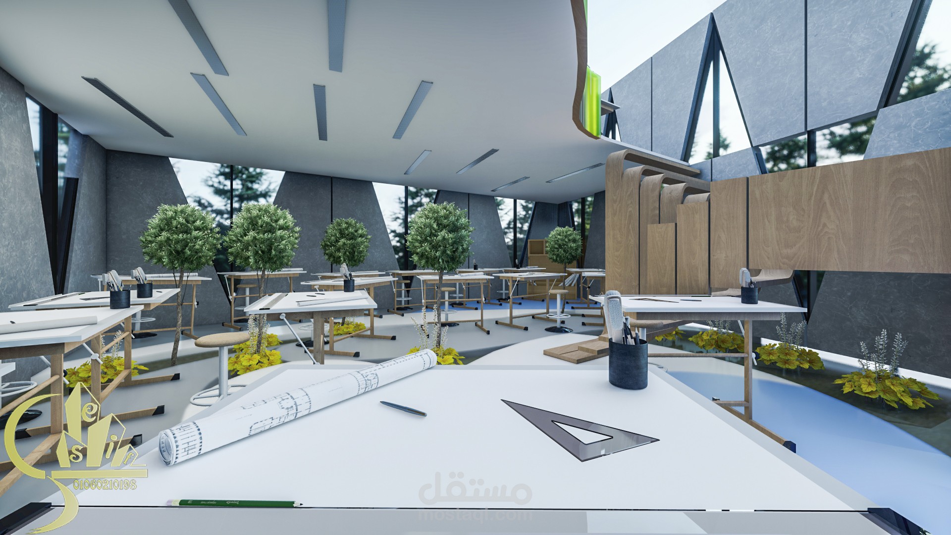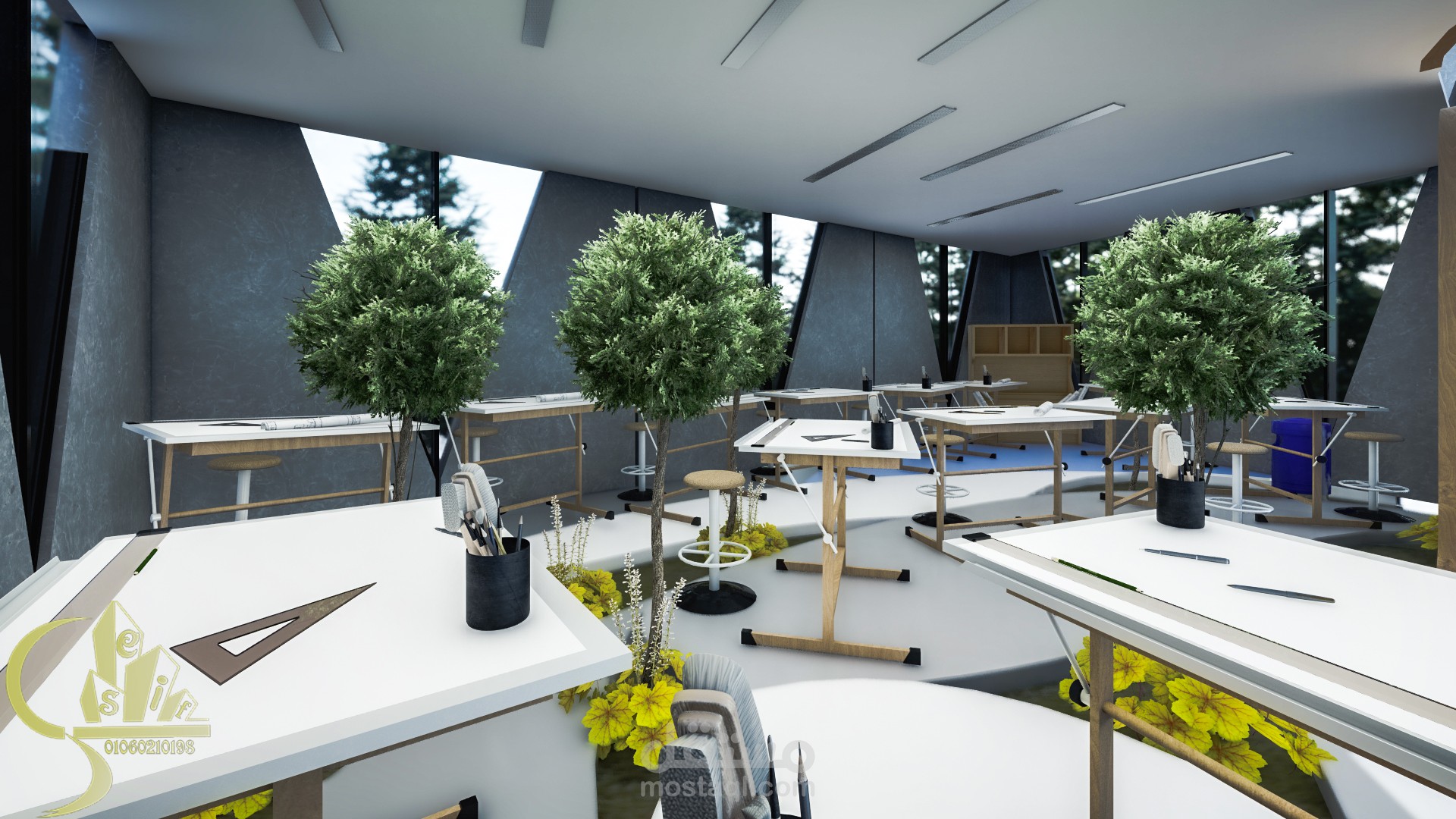 The studio is a place designated for students to practice their daily work, which is drawings. This is a place where students sit for five to ten hours continuously. And the distribution of drawing arrangements in an unorganized way to help break the boredom of the regular system