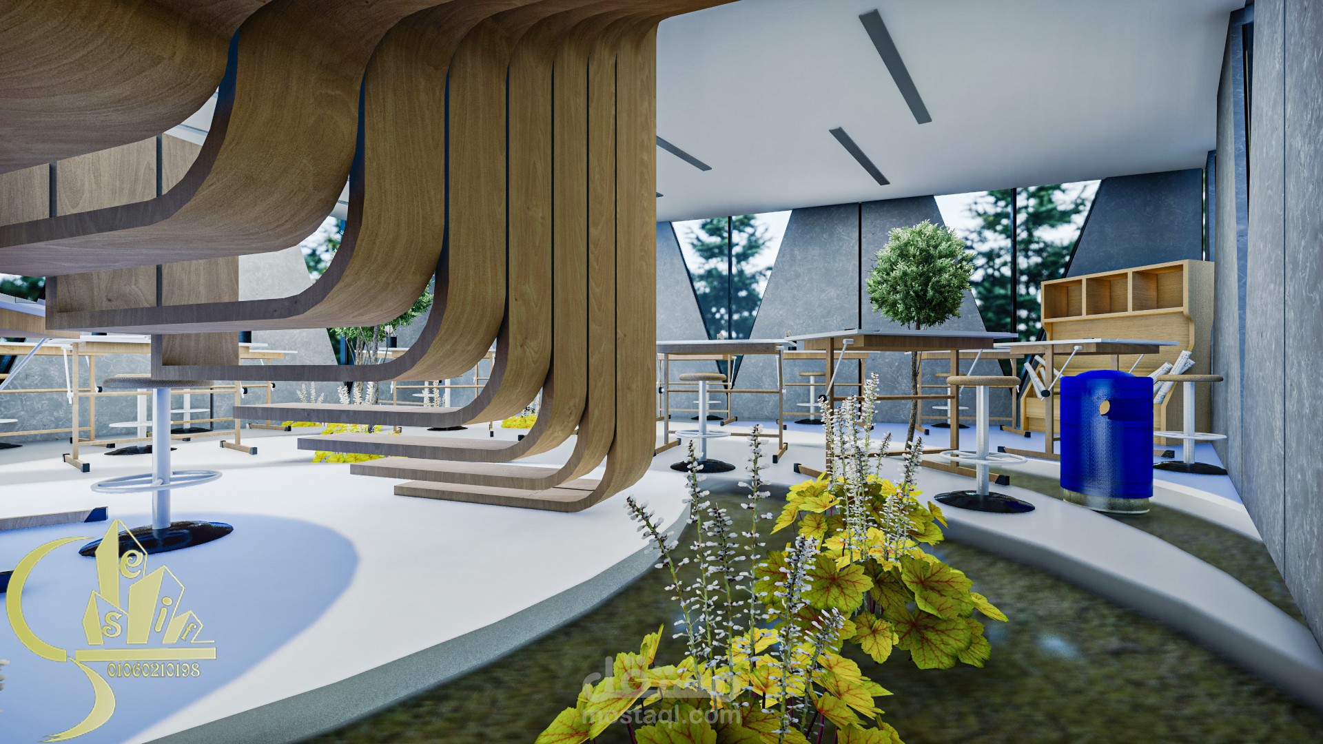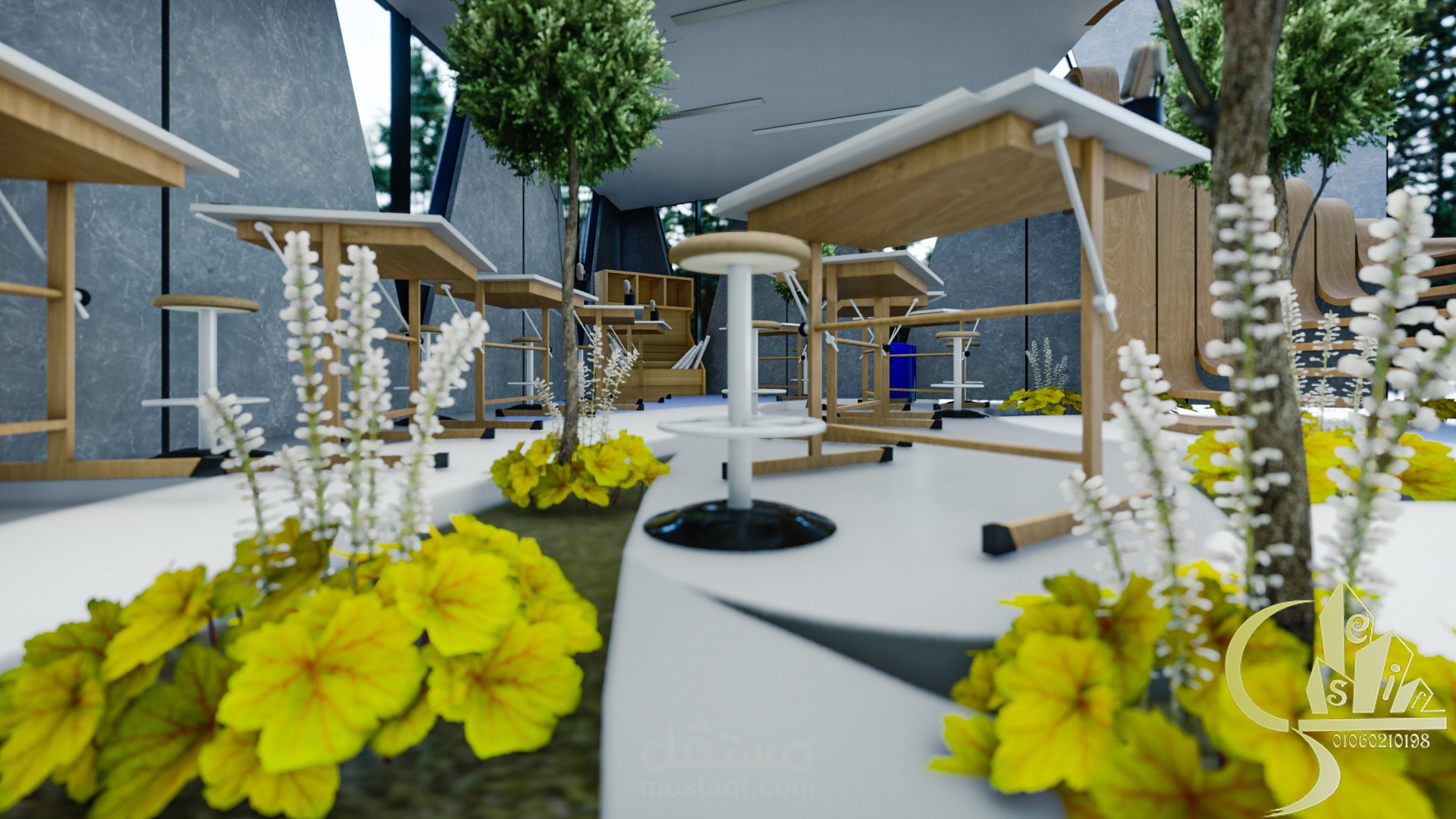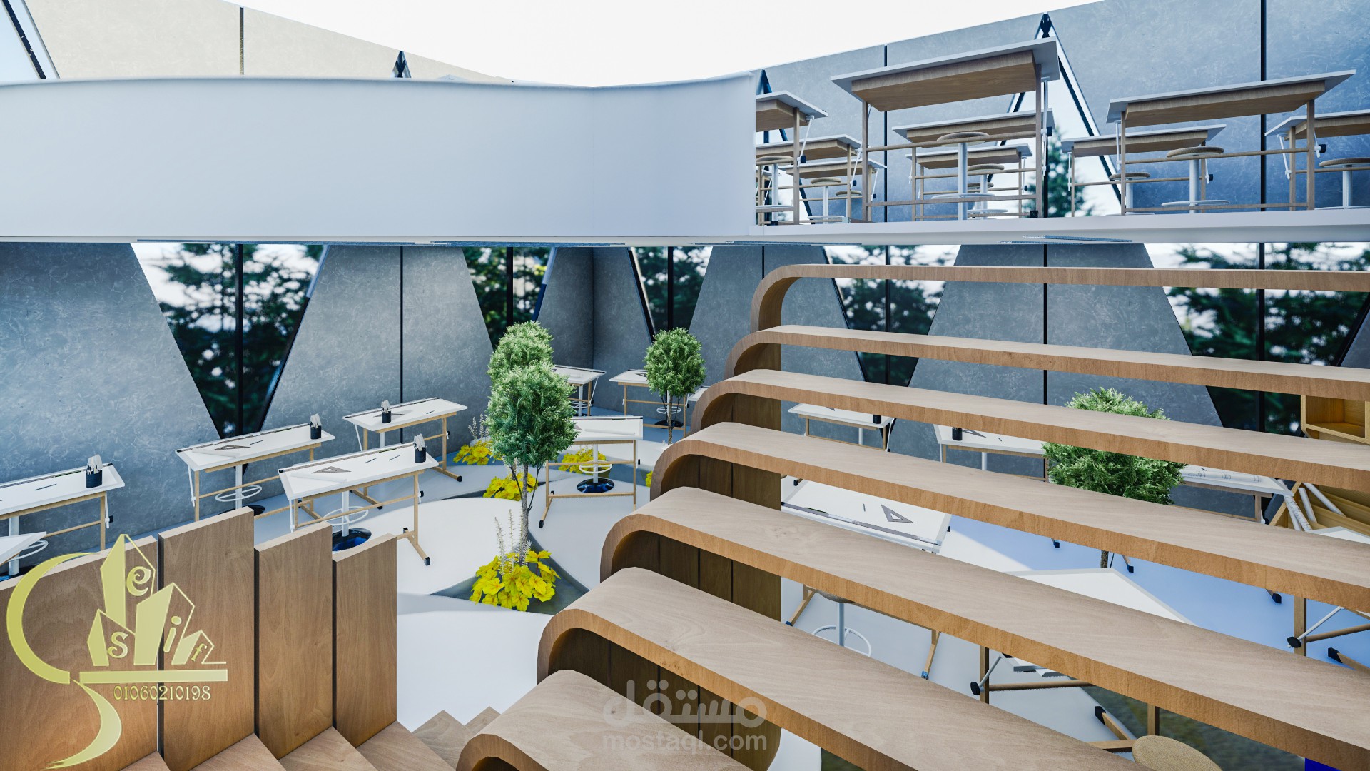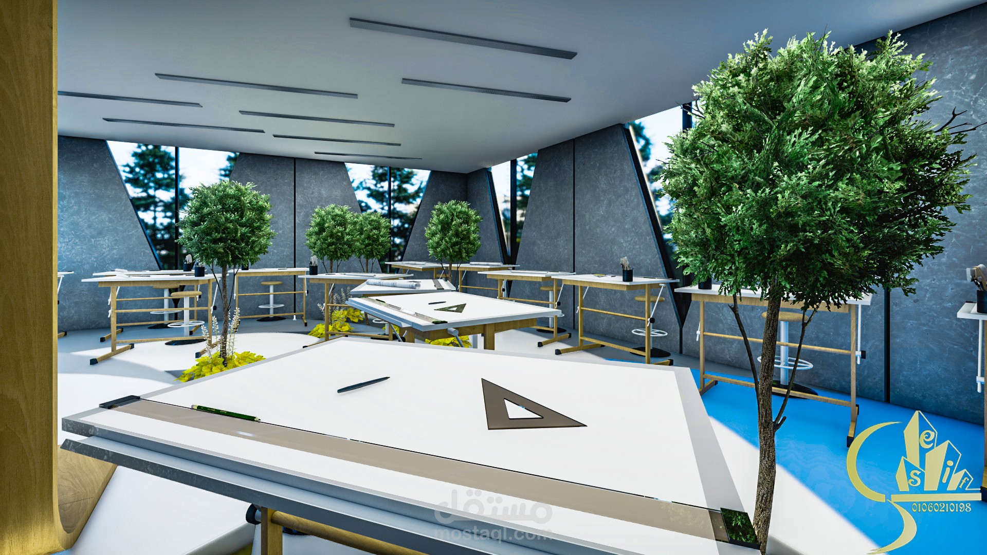 The studio is a place designated for students to practice their daily work, which is drawings. This is a place where students sit for five to ten hours continuously. And the distribution of drawing arrangements in an unorganized way to help break the boredom of the regular system