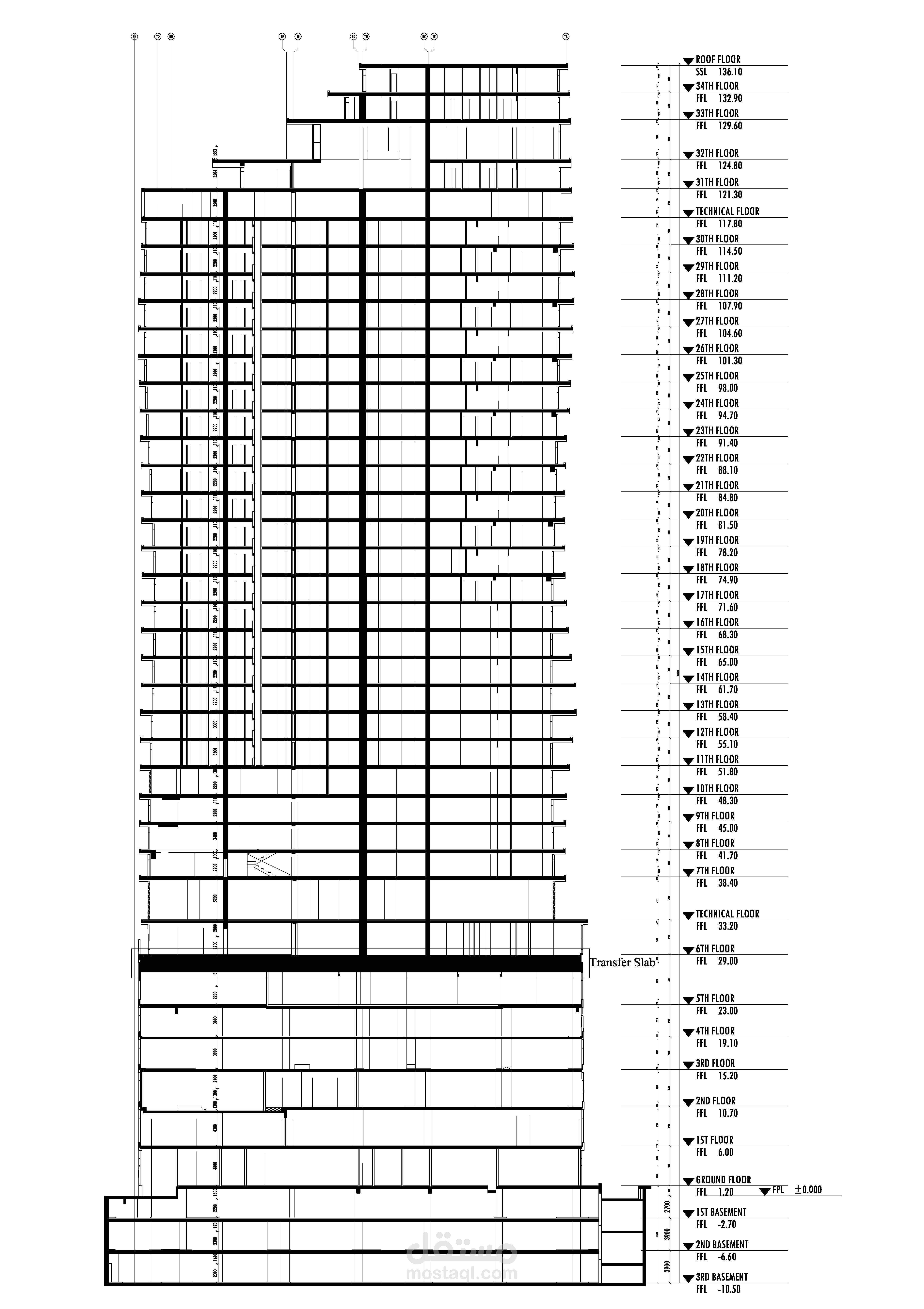 This Skyscraper is a reinforced concrete (RC) building with total height 146.3 m (40 stories) that was designed .The developed 3D model and cross-section elevation . The main system resisting the lateral loads is building frame system and RC bracing. The transfer slab is located at tenth floor level which equal 27% of the building total height. The thickness of RC transfer slab is 2000 mm