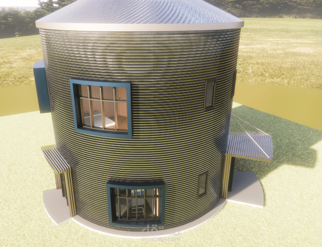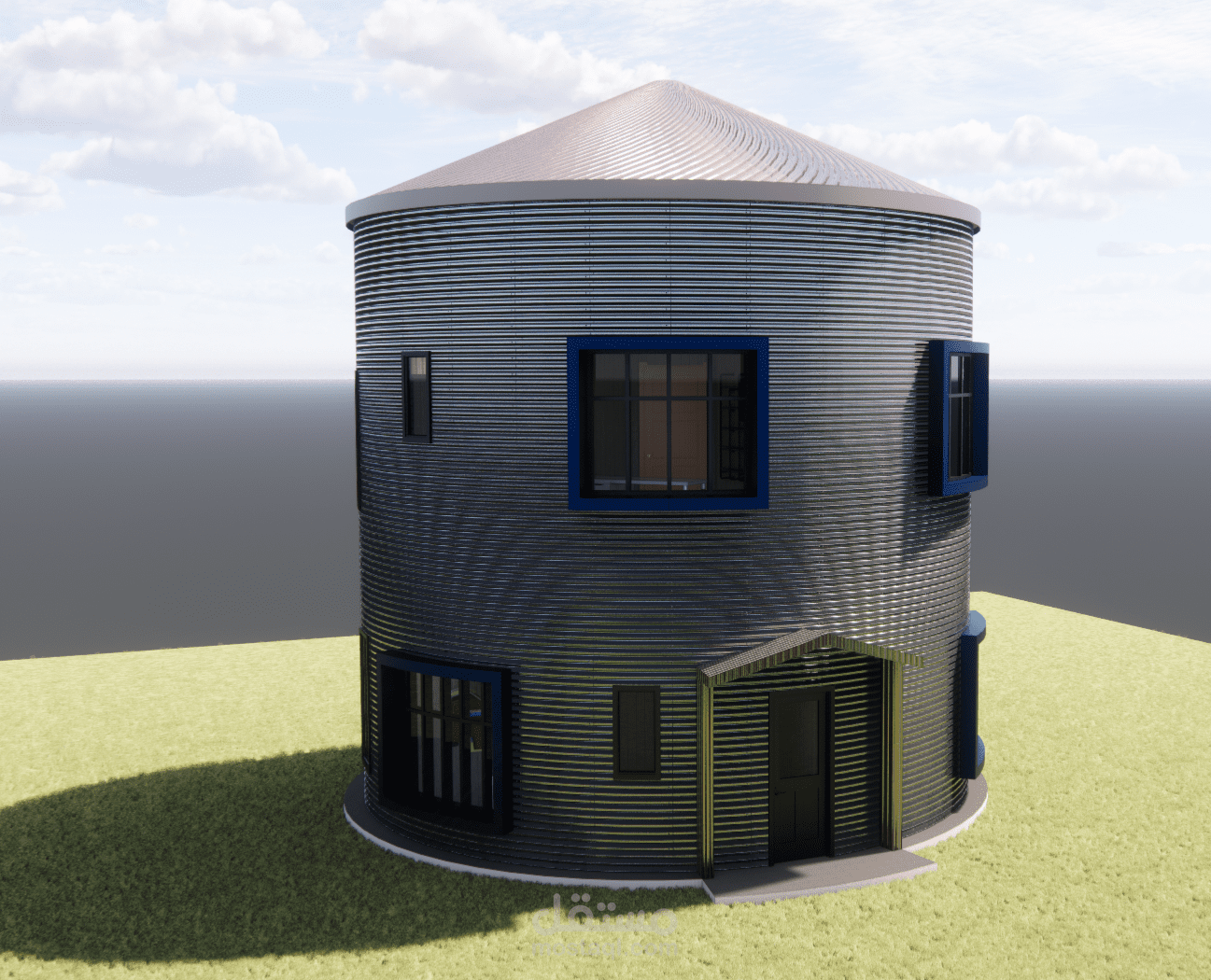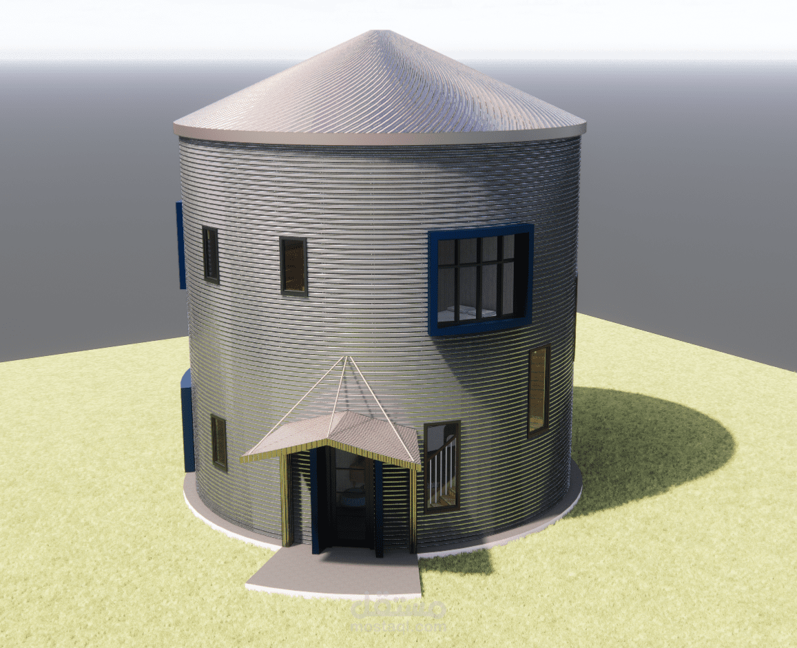 بناءً على رقبة العميل الذي يملك مستودع حبوب بشكل صومعة ويرغب بابتكار تصميم جديد لتحويله غلى منزل قابل للسكن فقد تم عمل التصميم المرفق والذي نال إعجابه حيث بدأ العمل بتنفيذه ليكون أيقونة مميزة في الحي