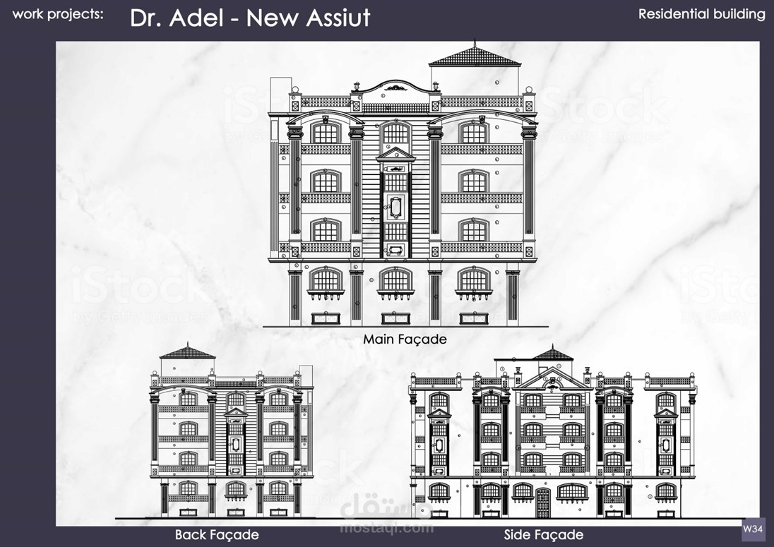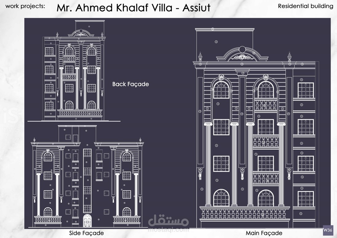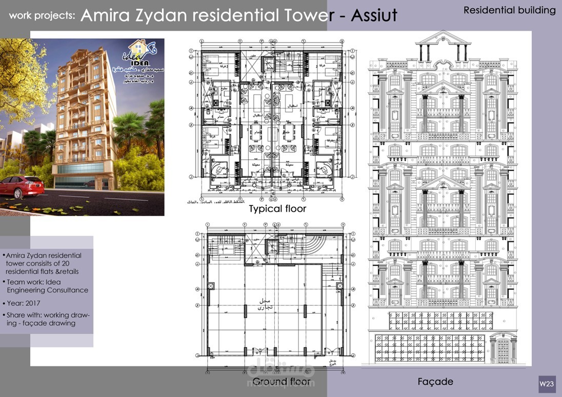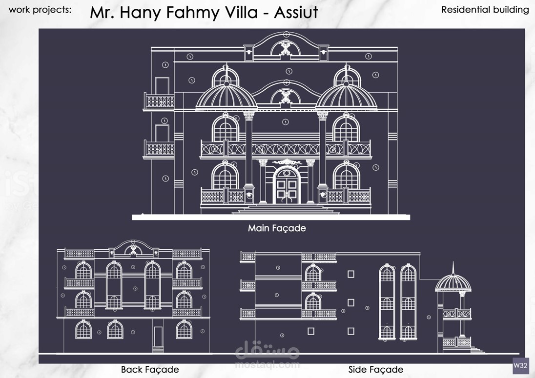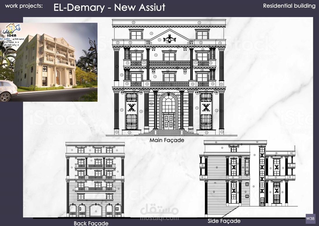 إعداد الرسومات التنفيذية وتصميم الواجهات لمشاريع عمارات و فيلات وأبراج سكانية كلاسيكية بمساحات متنوعة تحت رعاية مكتب Idea Engineering Consultant, Dr. Mahmoud Morad