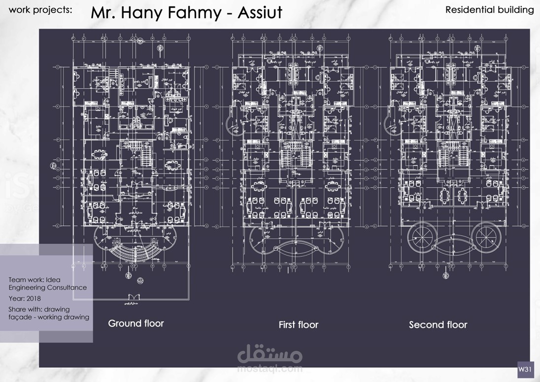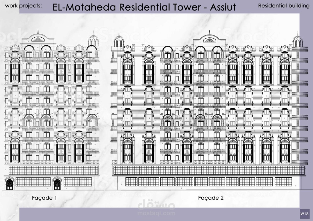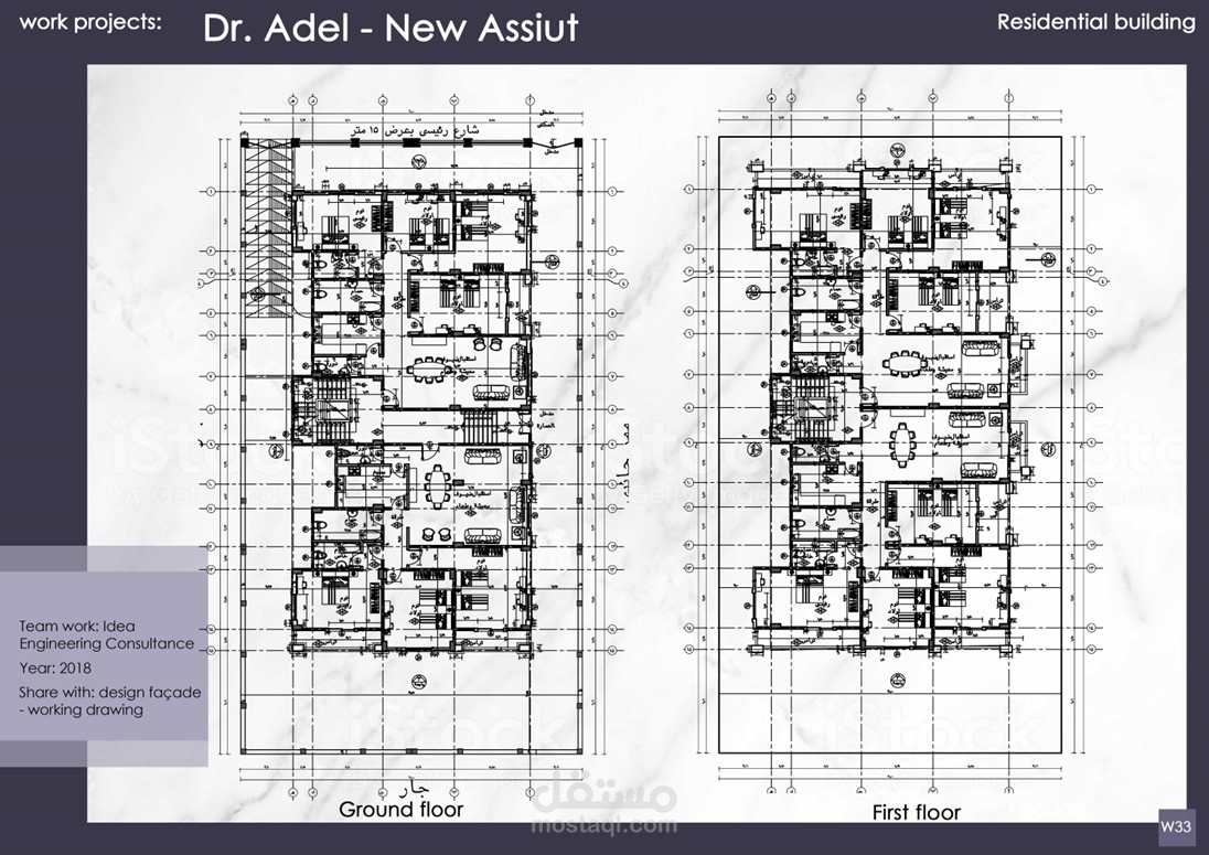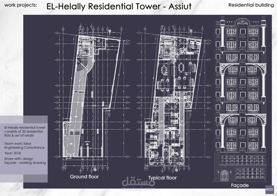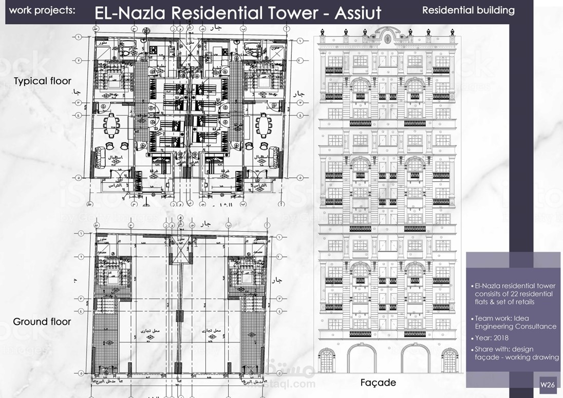 إعداد الرسومات التنفيذية وتصميم الواجهات لمشاريع عمارات و فيلات وأبراج سكانية كلاسيكية بمساحات متنوعة تحت رعاية مكتب Idea Engineering Consultant, Dr. Mahmoud Morad